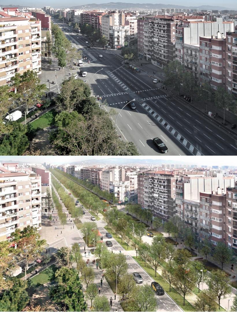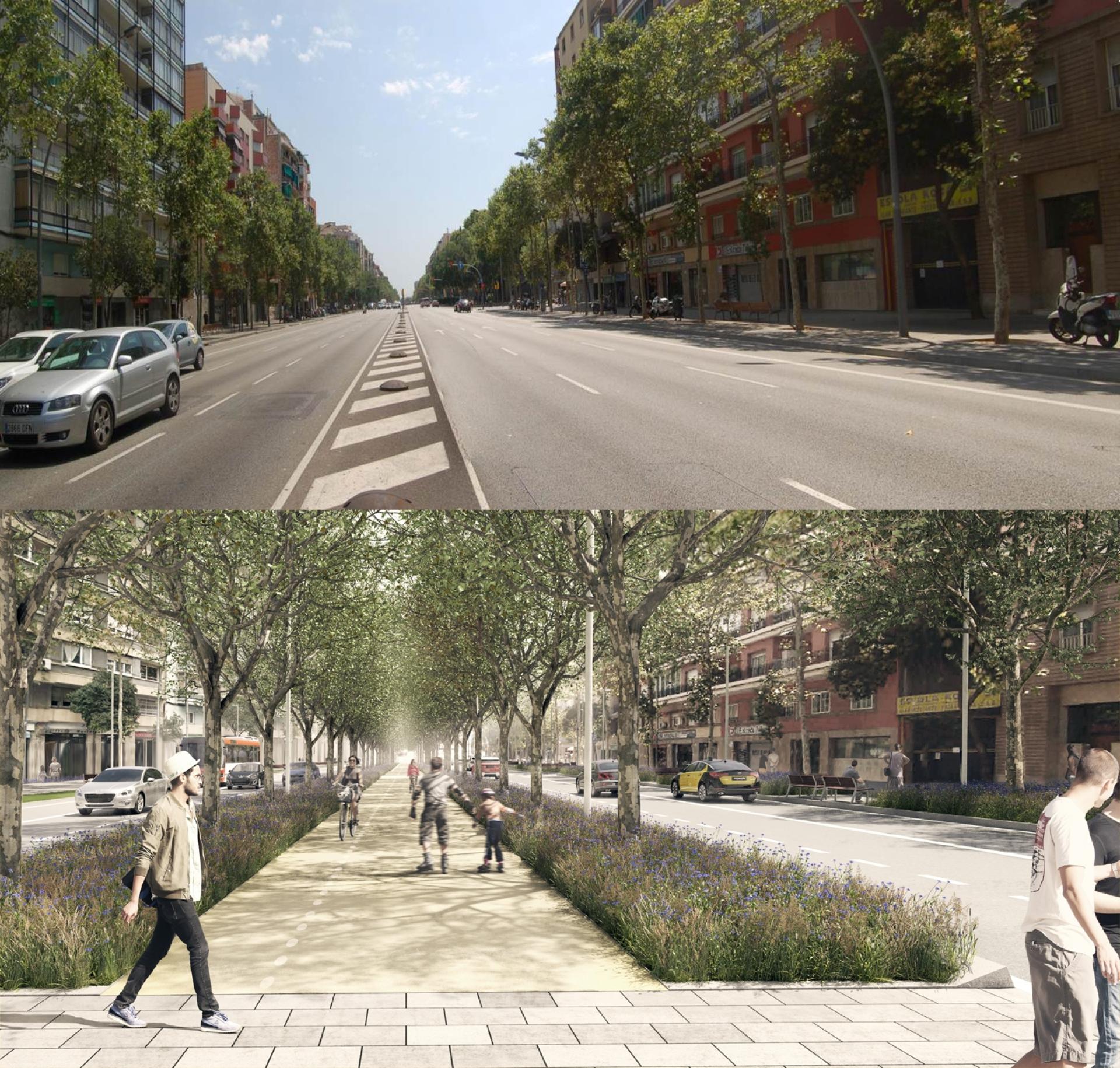 The transformation of Meridiana aims to reverse its current character of urban motorway, turning it into a civic axis of reference for the city. The strategy proposes its transformation into a green street where the vegetation, space for leisure and street furniture invite you to live it and not perceive it as a barrier that divides neighbourhoods. This implies to make the necessary changes in mobility to advance the pacification of the road, prioritizing the use of public transport, segregating bike lanes on the roadway and recovering the full width of the sidewalks for pedestrians. The final purpose is to improve the environmental quality of the surrounding neighbourhoods, implementing the greening of public space and promoting sustainable mobility.