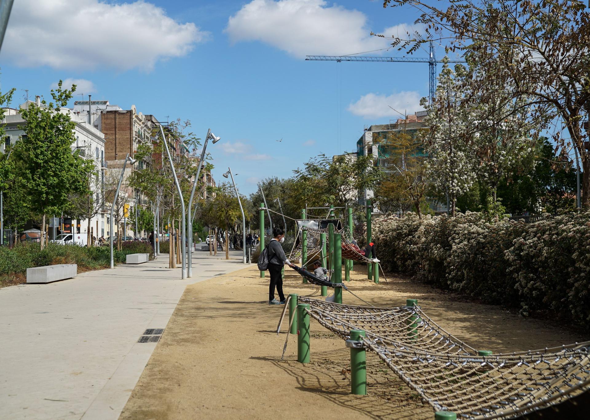 Finally, the central boulevard of the node, for the exclusive use of pedestrians houses two newly created children's play areas, which are part of the municipality Plan for Play in Barcelona's Public Spaces and among other innovations in its design includes the choice of inclusive game elements.