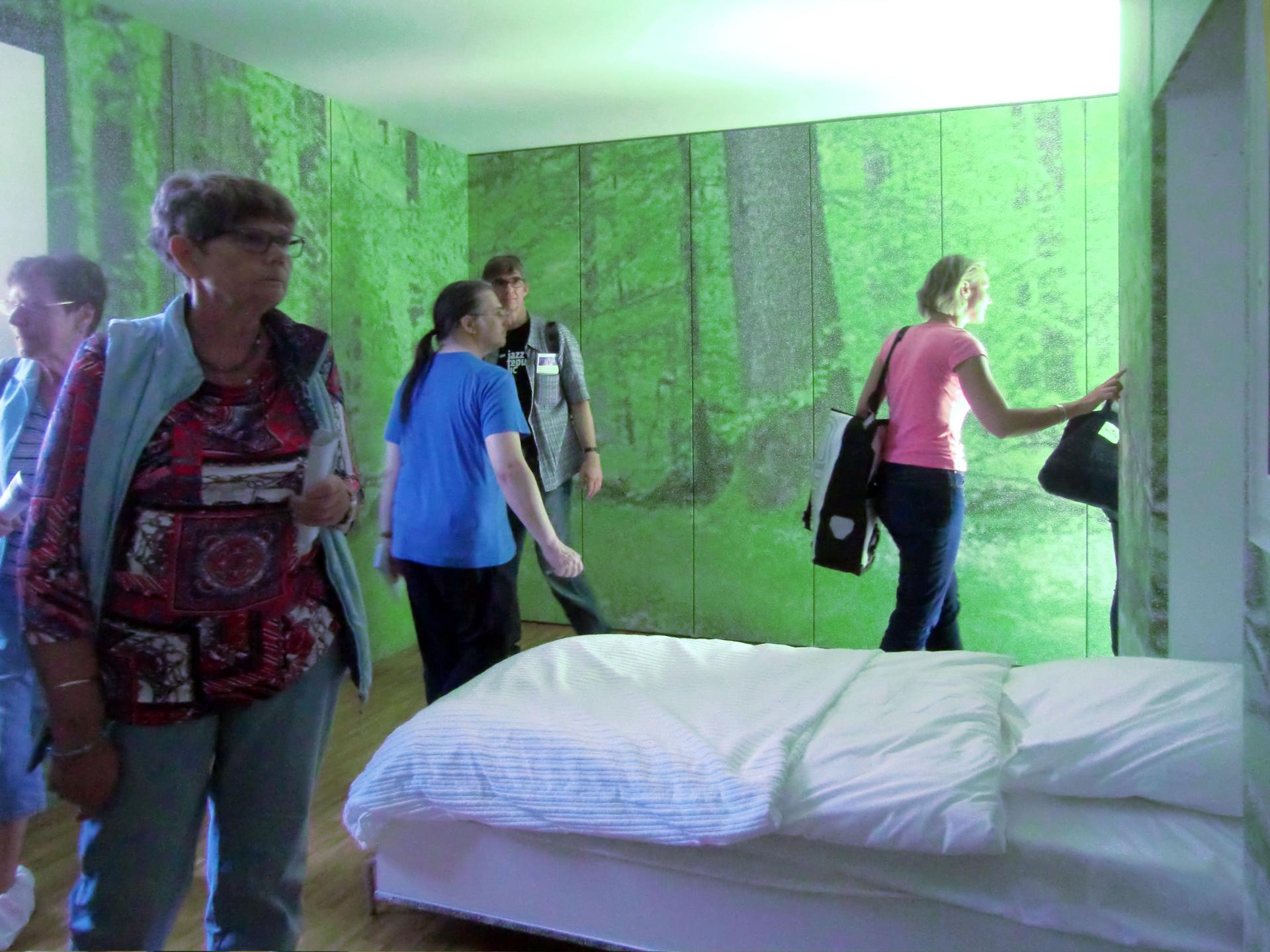 For the public, every facade panel allows a framed view on the basis of all life on earth – the bio-chemical process of photosynthesis. The colour of the panels varies over the course of a day, month and year depending on daylight and weather conditions. This dynamic appearance is strengthened by the rising air bubbles inside the panels that allow an effective uptake of carbon and daylight. The air bubbles displace the green algal medium and create a continuously changing semi-transparency allowing temporary views to the primary building skin behind. Behind the literally living facade, this wall relates to nature through its bright green colour and its decoration with grape-vine ornaments on the upper floor. The inside surface of the same wall on the ground floor displays full height photographic prints of a forest, provoking strong associations of calmness and peace. Nature is becoming the scenography for human activity, visually re-integrating habitants with nature.