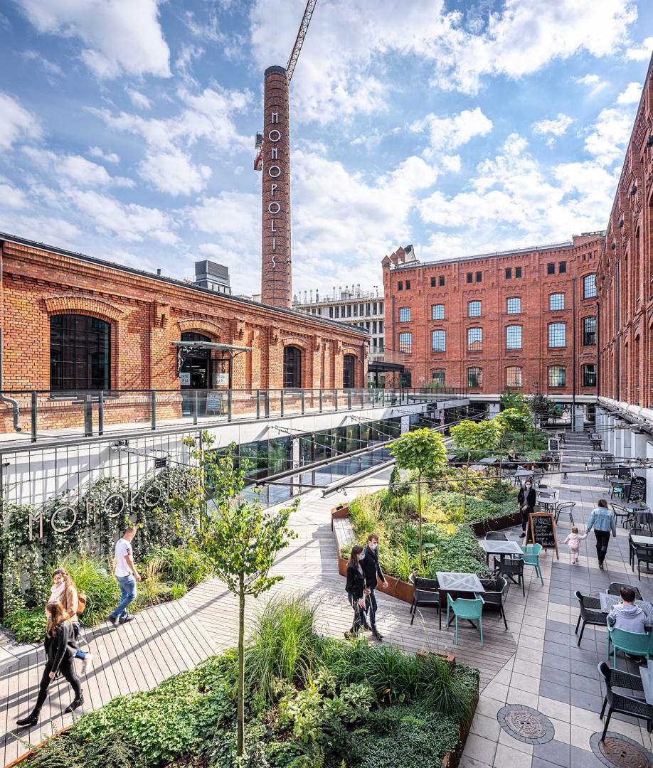 MONOPOLIS is a revitalization of the former Vodka Factory. The unique character of the place was maintained with addition of new contemporary buildings. The entire complex includes offices, gastronomy and cultural spaces like theater, gallery, museum. A special passage has been hollowed out and fulfilled with extraordinary greenery. Vehicle traffic and all deliveries have been eliminated from the ground level. An example of how to revive life in a former factory and create magnific public place.