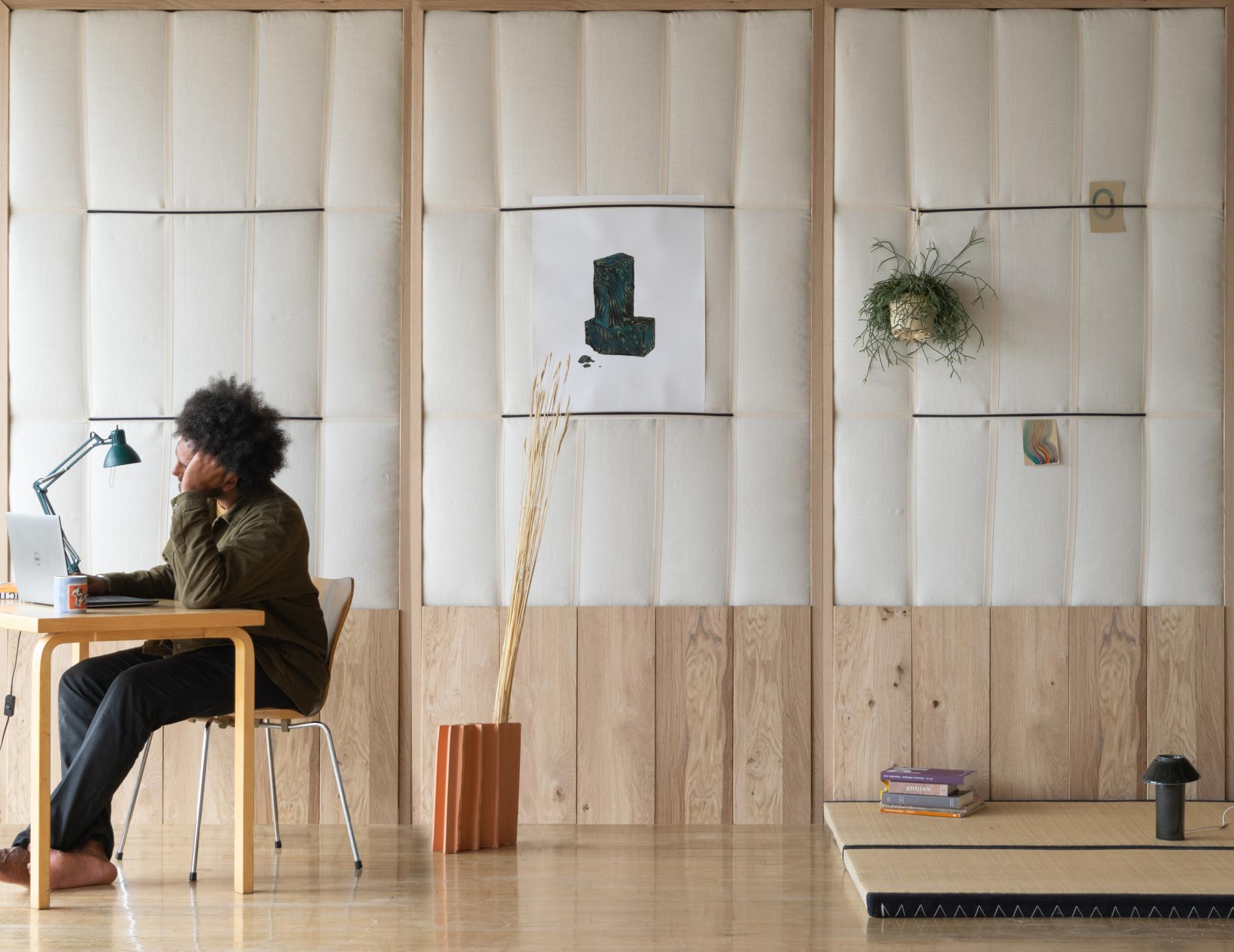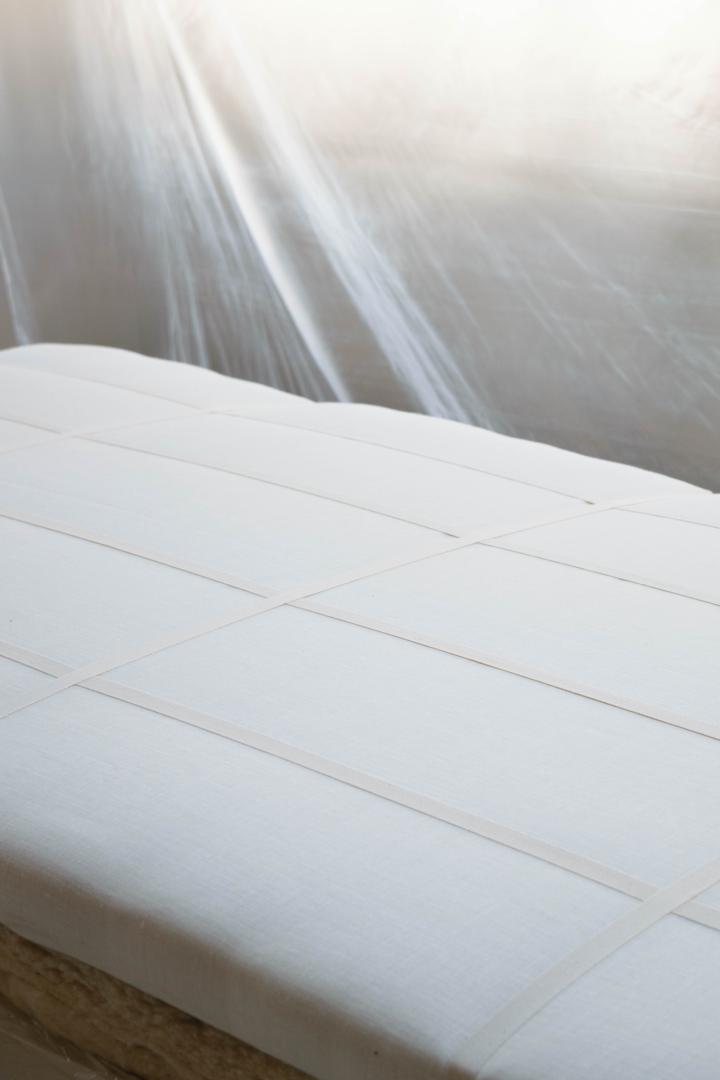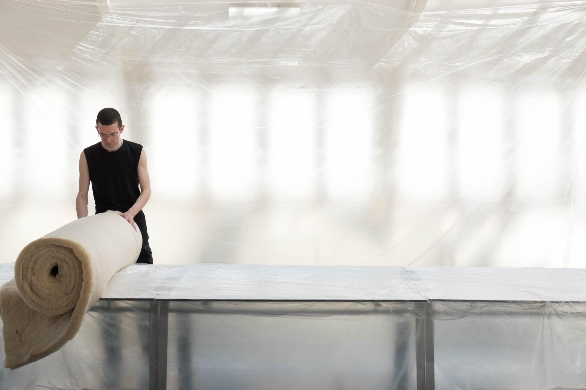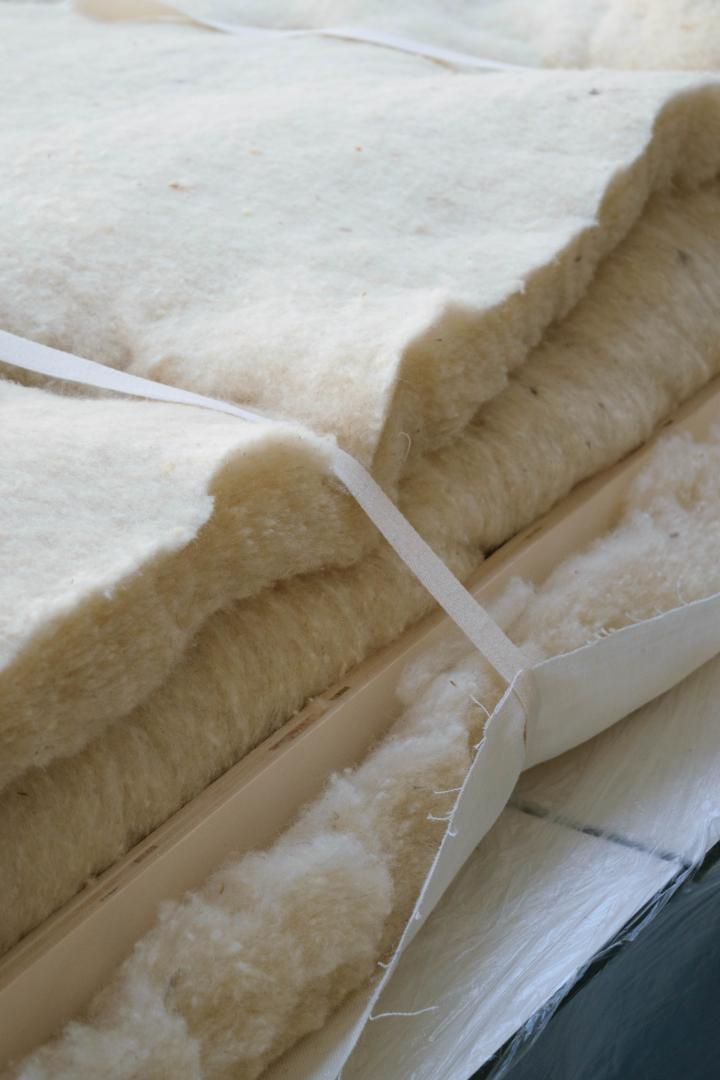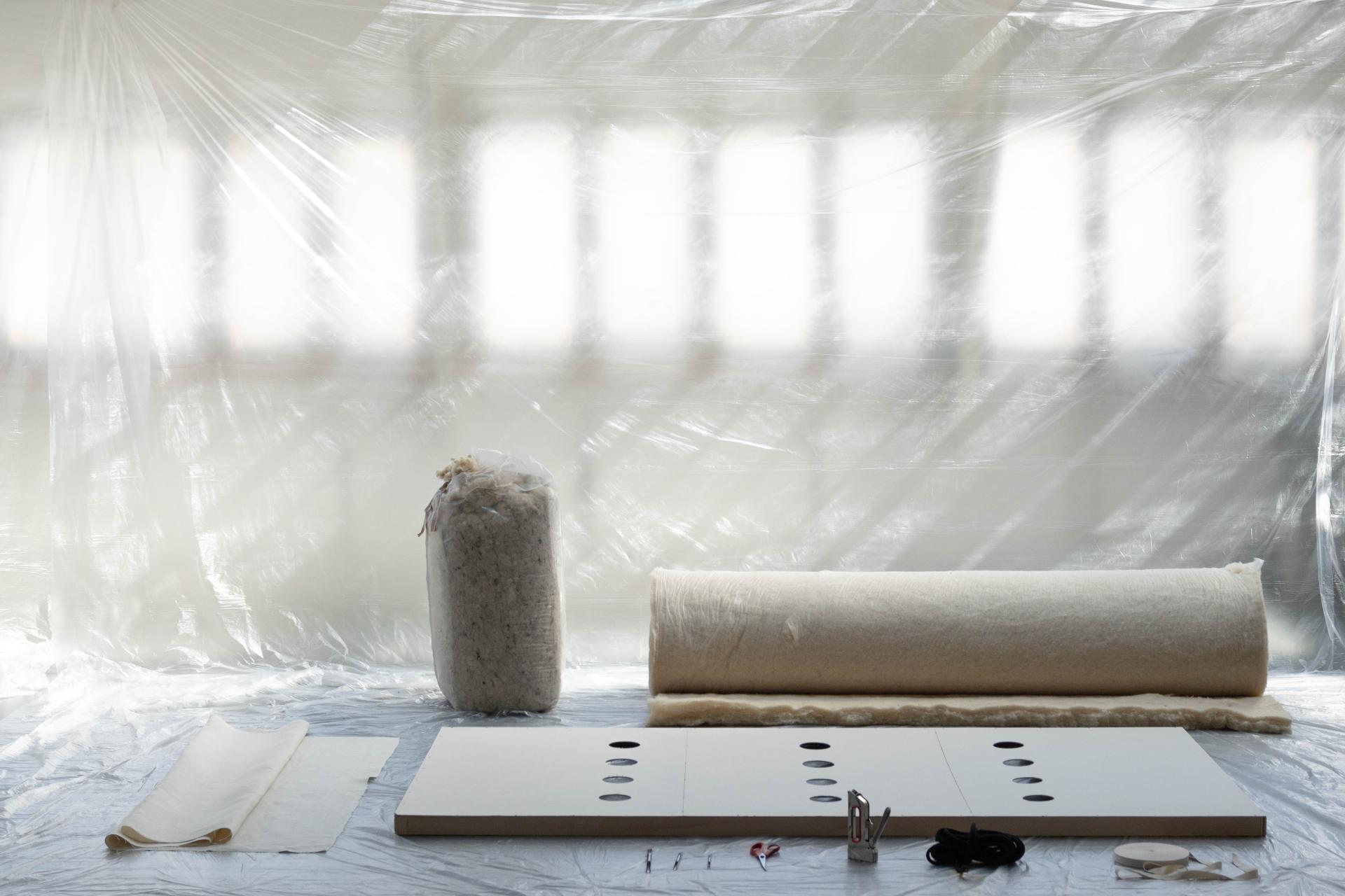First felted then spun, wool has been a part of domestic uses in many forms for ages. With carded wool, loose wool and textile, these forms merge consciously in the Wool Wall. Contemporary innovation relies here on a contextualized use of material, rather than technological accumulation. However, the thermal comfort brought by a certain form of frugalism makes sense in this timeframe of our history, where insulation appears as a new architectural typology that can bring solutions to fight climate changes. Wool Wall both achieve to renew the imaginaries of construction and interior.