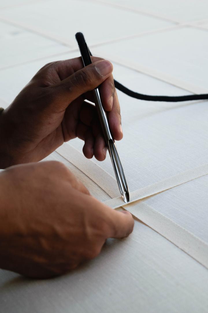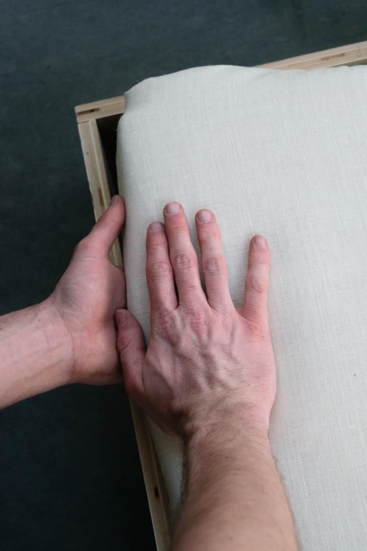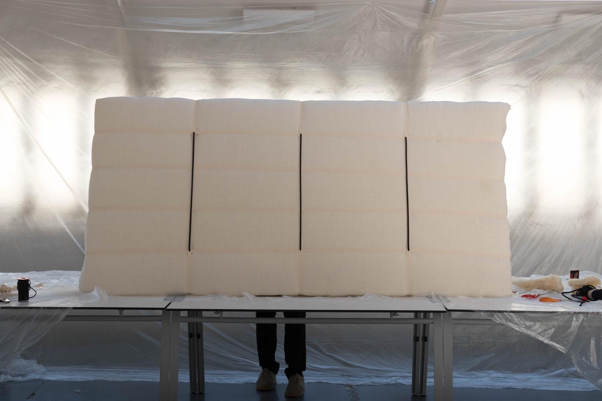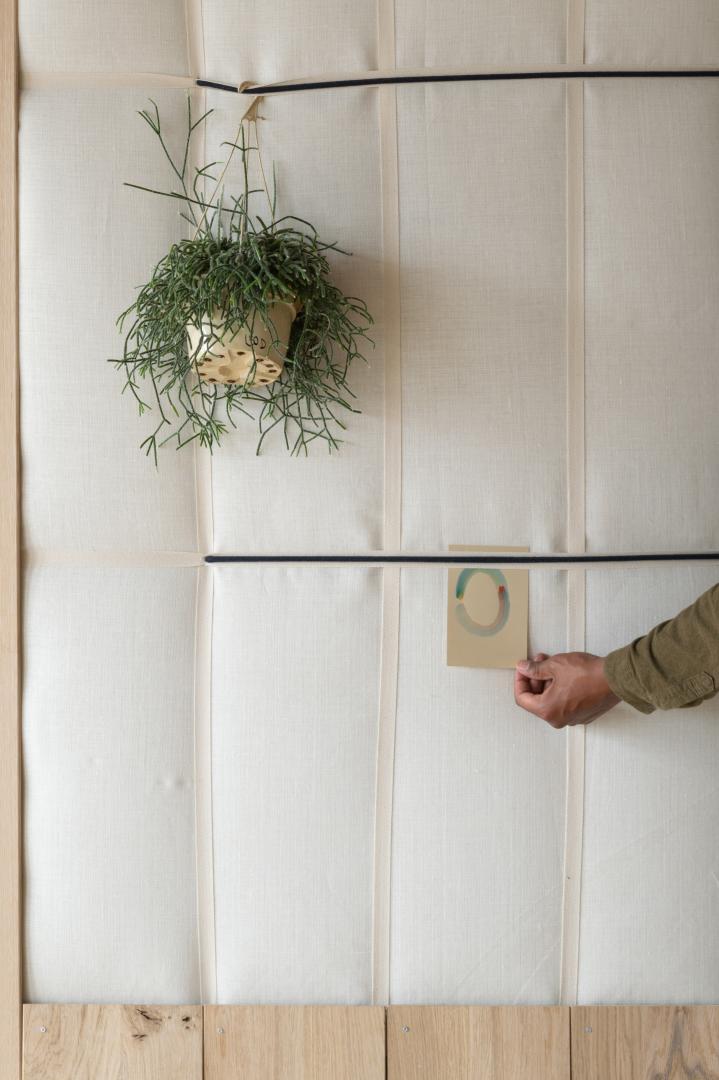 Wool Wall initiates a new gaze on the wall. With the textile and softness of the carded wool, the panel allows different types of interactions with what are usually known as hard surfaces. The net of straps, first structural, creates a functional pattern where pictures, lights, or suspensions can be hooked. Like brickworks, the construction allows a pattern to be visible: created by the net of straps, variations can be imagined, brought by changing the nature of the textiles, the rhythms of the pattern or the colour of the straps. Wool Wall’s structural element becomes a decorative asset.