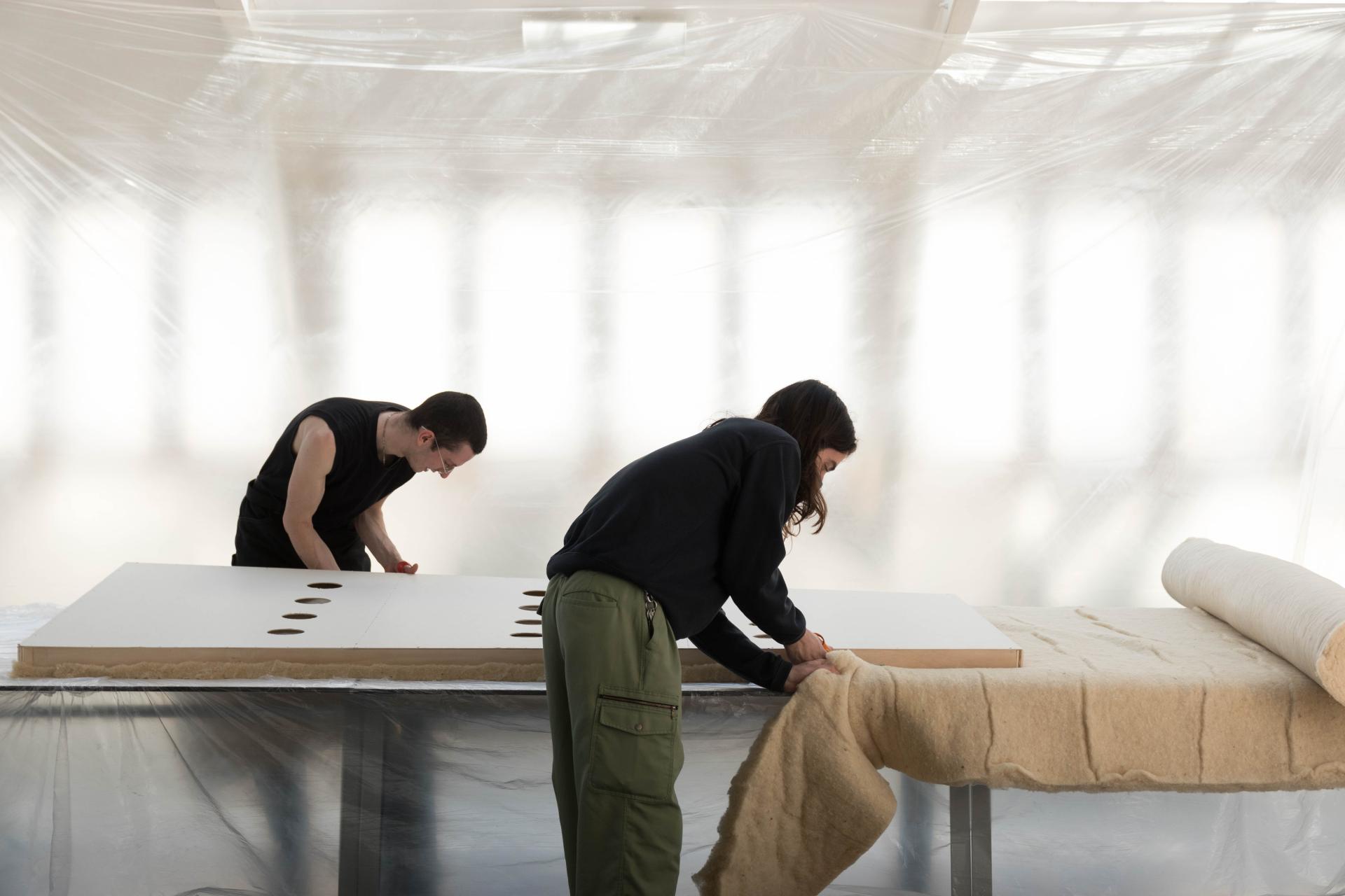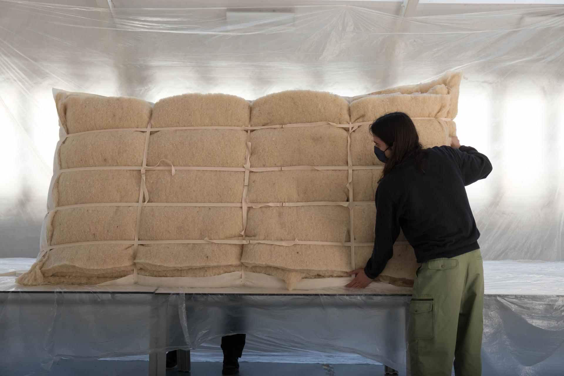 Switching from heavy to light construction materials, Wool Wall’s building process becomes accessible to everybody. This lightness of the materials and the simplicity of tools also prevent workers from long-term injuries. Moreover, inhalations are not toxic, which also prevent any types of health problems. If carded wool is more expensive than traditional insulation material, the fact that Wool Wall doesn’t need expensive tools to be mounted balances the overall cost. The facility chooses craftsmanship, which favours learning and recognition of craftsman work. The building time becomes a moment of transmission, the masonry becomes sewing.