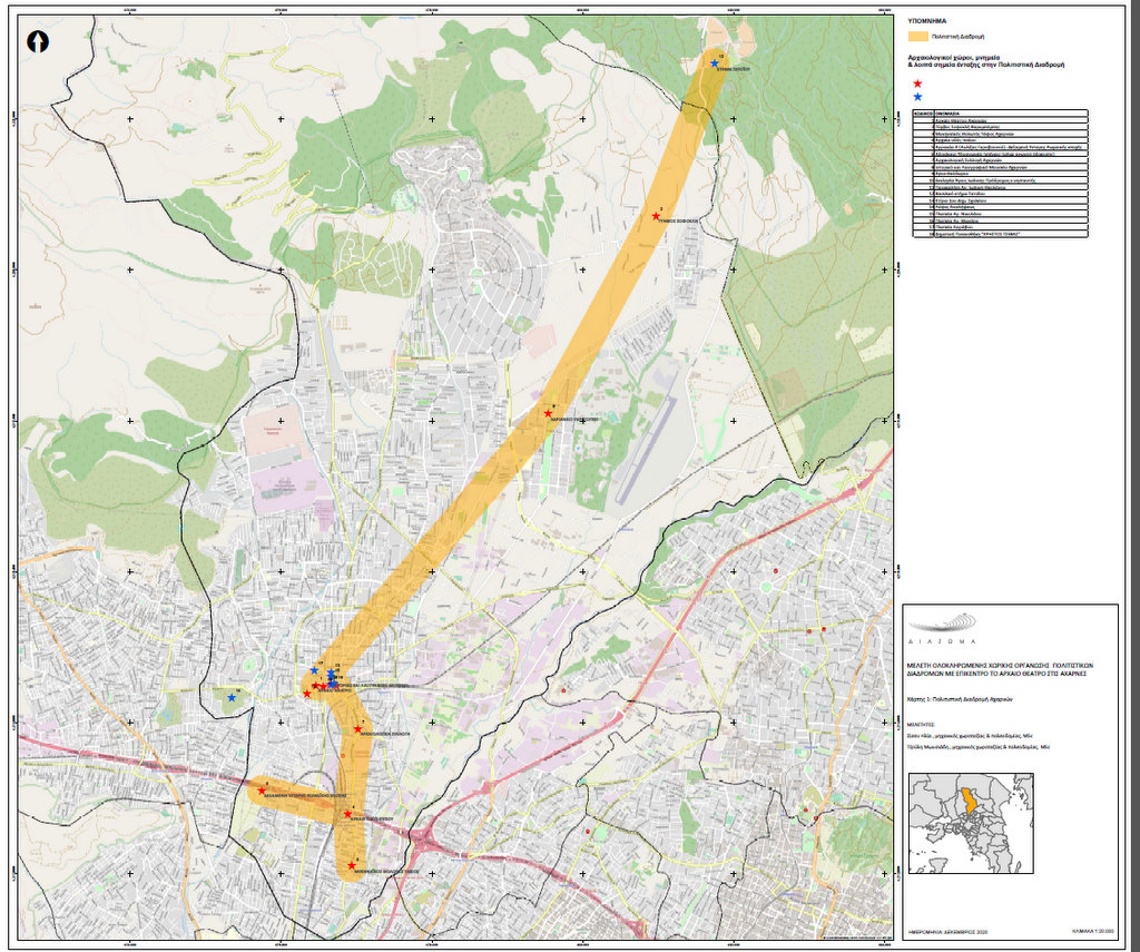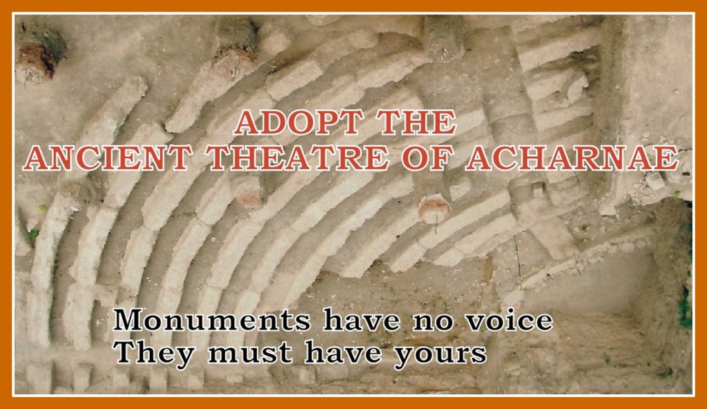 - An e-piggy bank opened to collect money for the ancient theatre, following the "adopt a theatre" model that could safeguard the initial funding of the forthcoming conservation management research. Indeed the Integrated Urban Development Plan intended to: a) Utilize the environmental (by displaying the unique biodiversity of the area), cultural, and archaeological reserve by uniting the archaeological environment and the urban fabric through the creation of an archaeological-environmental park. b) Enhance productivity and innovation, digital applications, the primary sector, small and medium-sized enterprises, social economy (e.g. social cooperatives), local gastronomy, folk art, etc. by encouraging synergies between tourism and culture-related activities and increasing their impact on local community and the economy. c)Revitalize underprivileged hubs in specific areas and achieve social cohesion through programs to combat social exclusion, so that the city of Acharnae can become an attractive and viable urban center, with a view to the protection and sustainable development of the natural and built environment, the promotion of the history, architecture and, in general, the special identity of the city, in order to improve the quality of life of the inhabitants overall, socially and financially