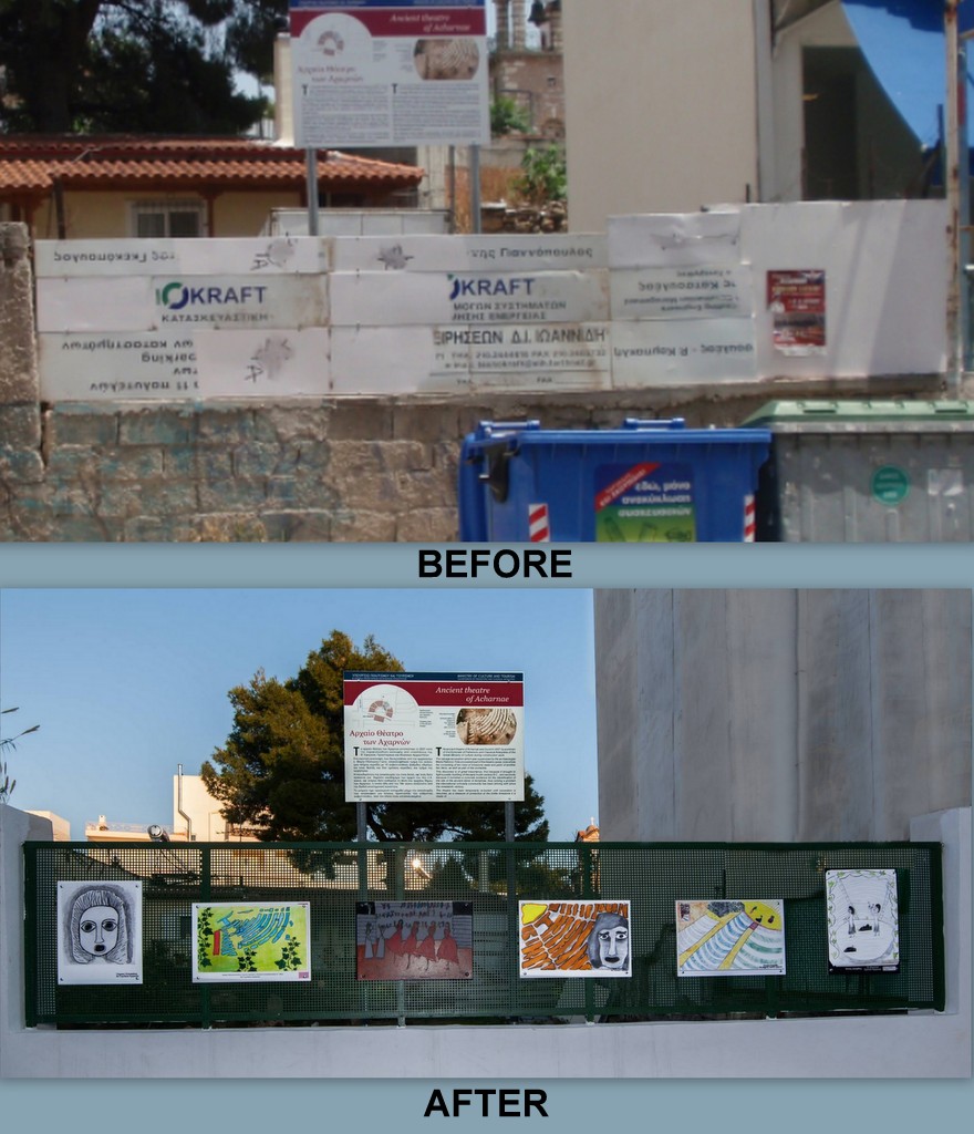 The community-led project “EPISKINION” accelerated the process of the first plot expropriation where the ancient theatre was found and its completion through the deposit of the required funds by the Archaeological Receipts Fund, as published in the relevant Gazette (FEK No. 276, 2011). )and the second plot expropriation and its completion (as published in the relevant Gazette (FEK No . 190., 2019). All the funds were deposited to the property owners. That second expropriation covers the whole area of the Ancient Theater, which remains underground. This was important that lead to its further revelation. Through specific interventions, the aim is to achieve a spectacular improvement in the living conditions of residents, including the regulation of vehicle and pedestrian traffic, the demarcated parking spaces, the possibility of integrating cycle paths as well as bioclimatic improvement of the thermal factors of the area. Therefore we realize that cultural heritage has been put into value in the spirit of sustainability, and the ancient Theatre of Acharnae case study may be an exemplary model of preservation and community participation that would serve numerous sustainable development goals. At the same time, the beautification of the entrance was deemed necessary with the removal of the bins and the installation of a sign for the monument, with the fund, rose through the e-piggy bank. Apart from that, some partial interventions were later implemented.