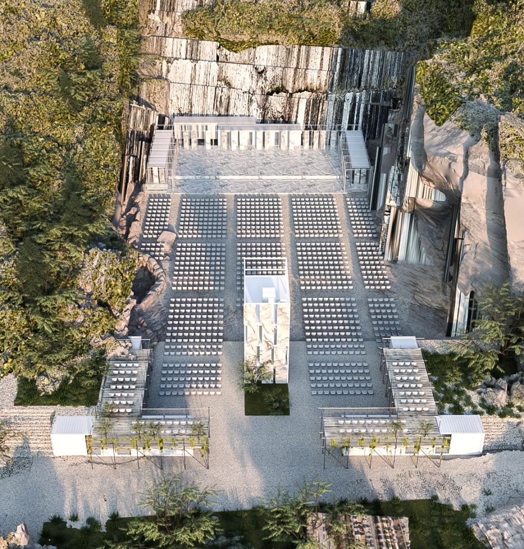 The area set up for events shows the distinctive features of the architectural typology of the theater, prefiguring a symmetrical compositional structure despite the irregularities presented by the walls of the quarry. The project develops around a central empty space, and the structures that will house the ancillary activities stand on the long sides of the quarry.