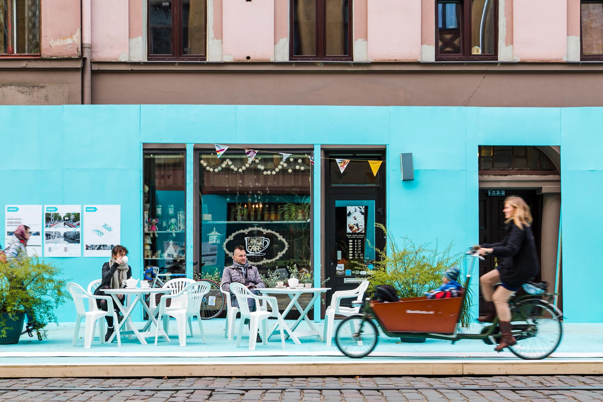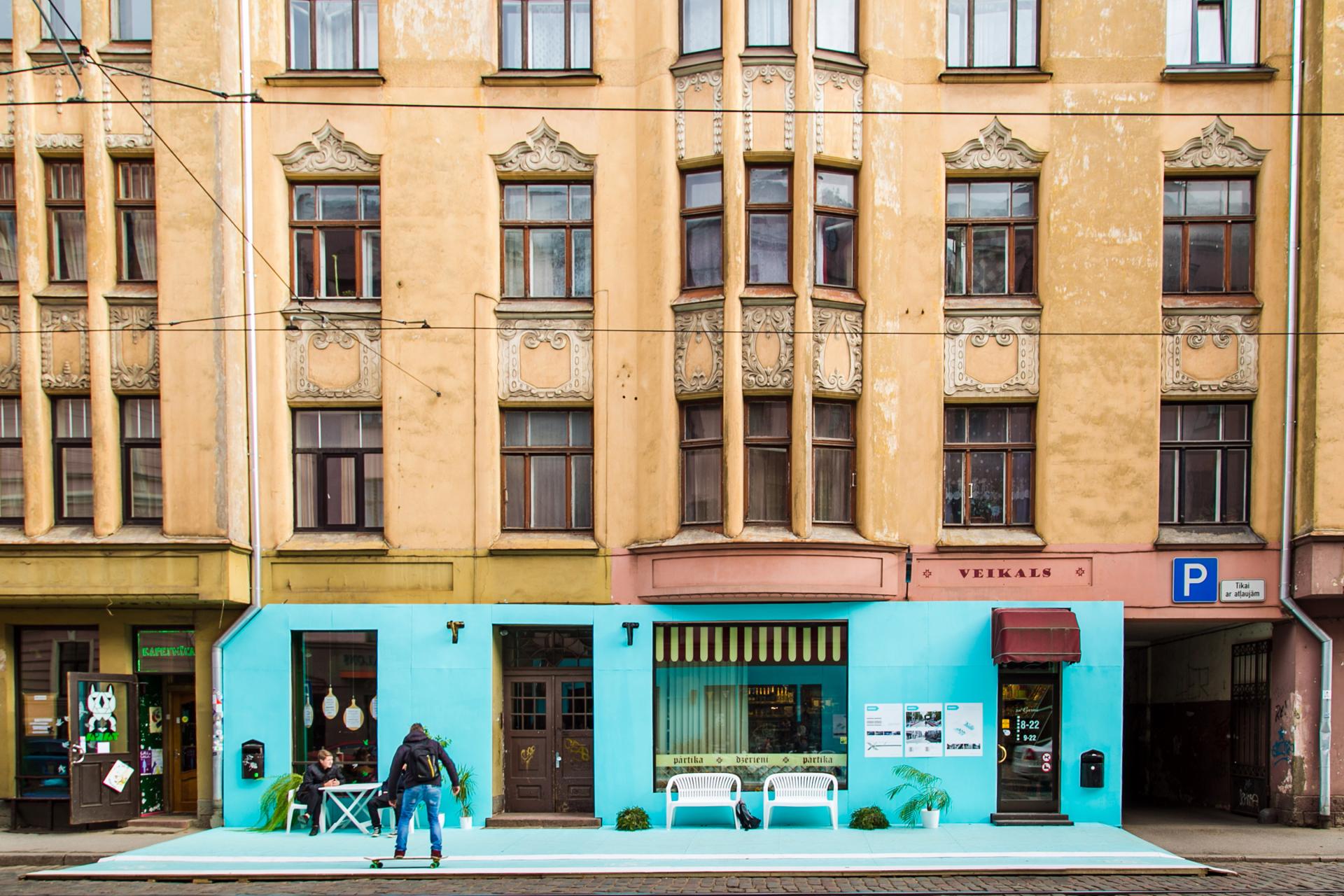 To prove that Miera Street in Riga can be a space for both mobility and social life, Fine Young Urbanists built a 14m-long street prototype on a scale 1:1 featuring wider sidewalks, bicycle lanes, street furniture and potted plants. The mock-up was built in three days and remained in place for a week. The two urbanists used this time to discuss street design with passers-by, local residents and small business owners, discovering an effective method of involving the public in the design process.