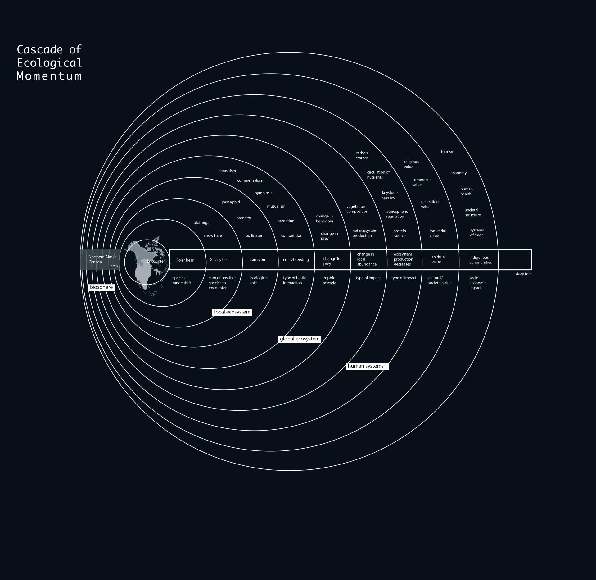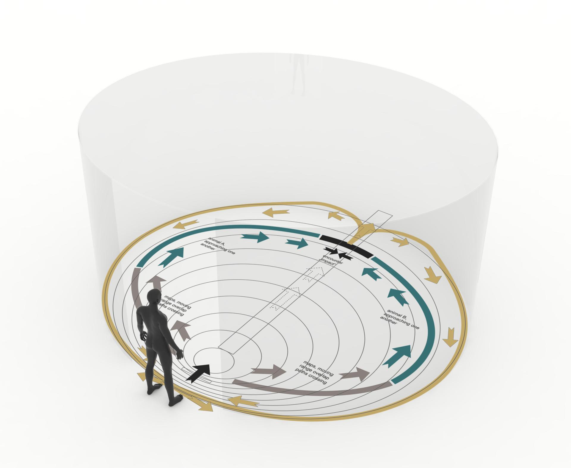 Each encounter of two species produces multiple impact narratives. This idea also manifests in the spatial concept for the project, implementing the “Cascade of Ecological Momentum” into its floor-plan. The non-linear curatorial narrative integrates the visitor as a vital element into its spatial storytelling concept. With the entrance of the human into the ’arena of encounters’ and thus into the story, the dynamics are kicked off and the human is now left to observe as the cascade unrolls. Impacts travel through the exhibition space, as they travel around the globe, connecting remote encounters with direct, tangible impacts. As human species we are standing in the center of consequences - with observer-status only, and we understand that the only option left, is to adapt to the changes we have set off.
