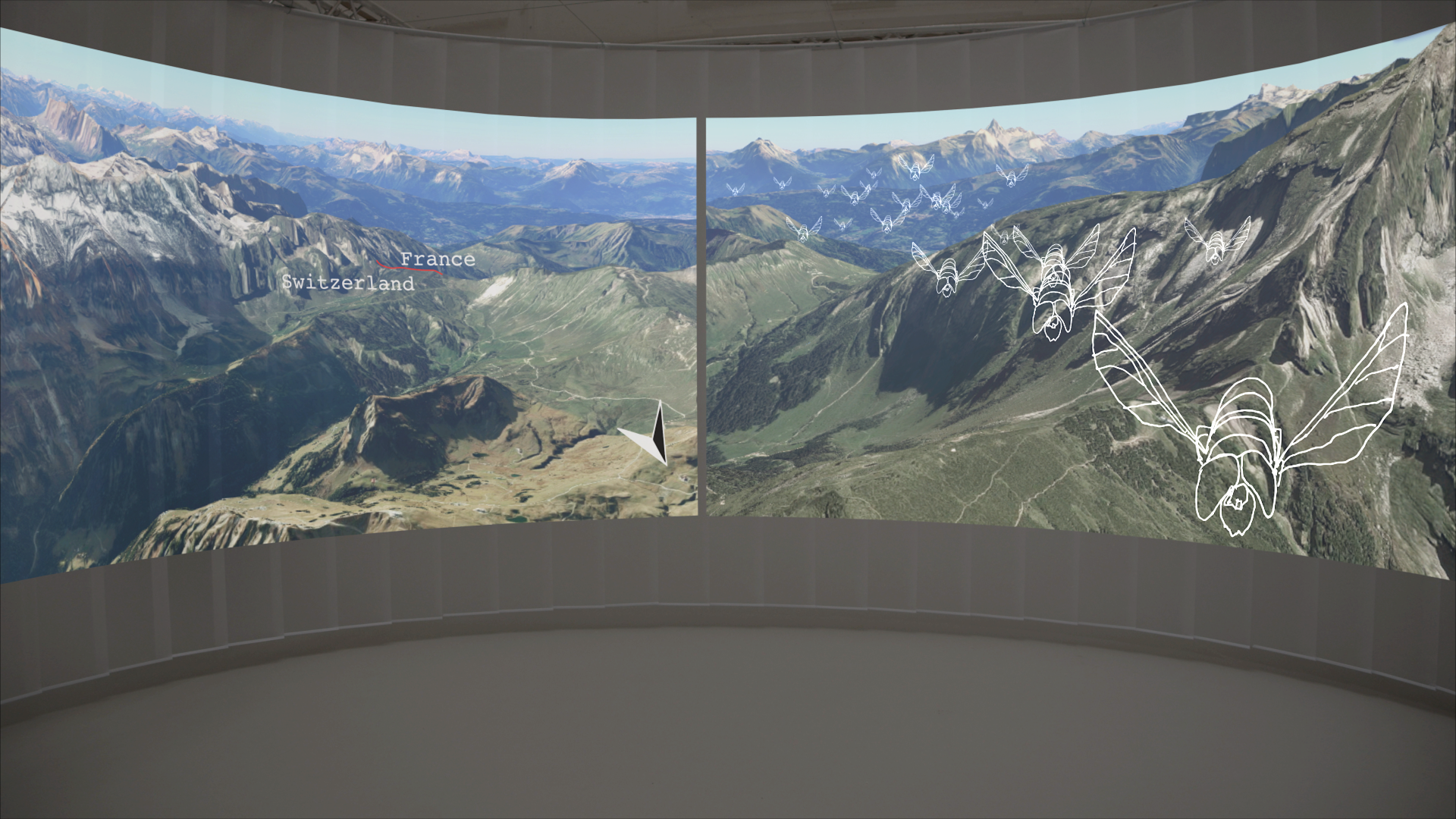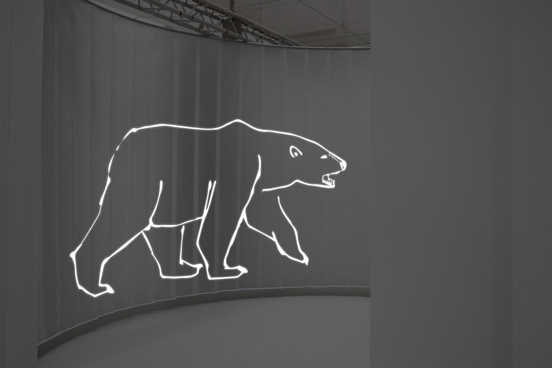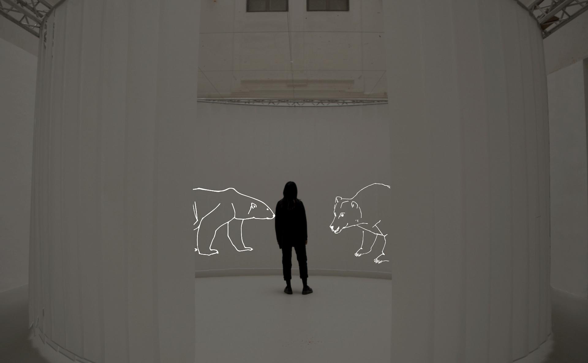 As a spatial installation the project leads the story around the visitor to reconnect cause and effects and to bring the human back into relation to the dynamics he set off. Projected animations of animals roaming the exhibition space surround the visitor together with footage showing possible impacts on food webs and systems of trade, producing an immersive, 360-degree experience.