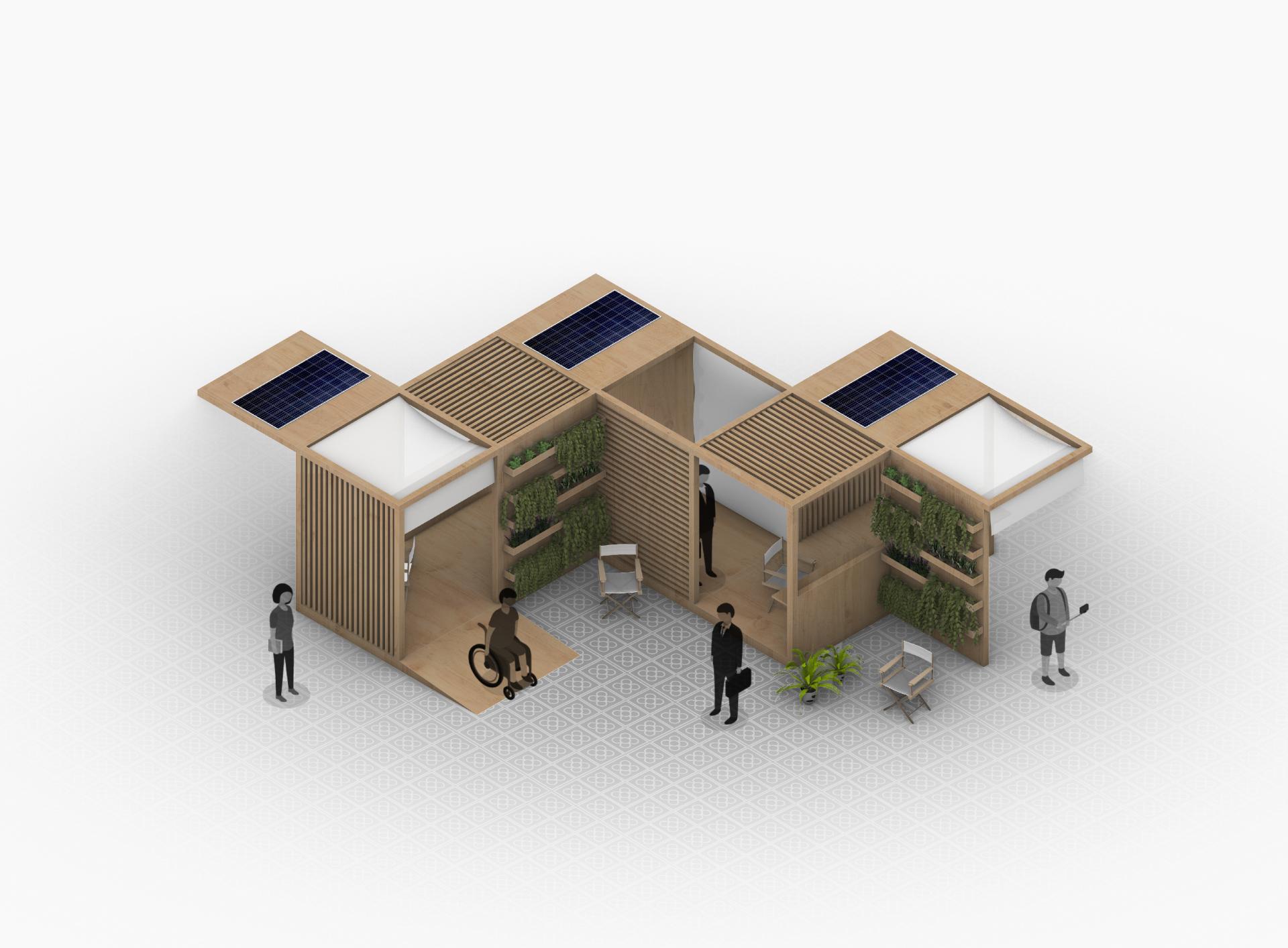 Its transport and assembly have been taken into account, which must be easy and intuitive, consequently, different pieces have been designed which, which generate different types of modules with different designs, giving each environment a unique identity but preserving its ease mounting. These modules work both alone and grouped with the amount that is required, playing with their shape and generating a space with use that goes beyond the stipulated, for this reason, these modules can be implemented in specific cultural events, other events carried out by the city council or they can even be placed in educational centres or companies. Despite the fact that this project arises from the pandemic, it is projected as a solution to other social and urban problems that already came from before, giving an innovative and easy-to-implement proposal.
