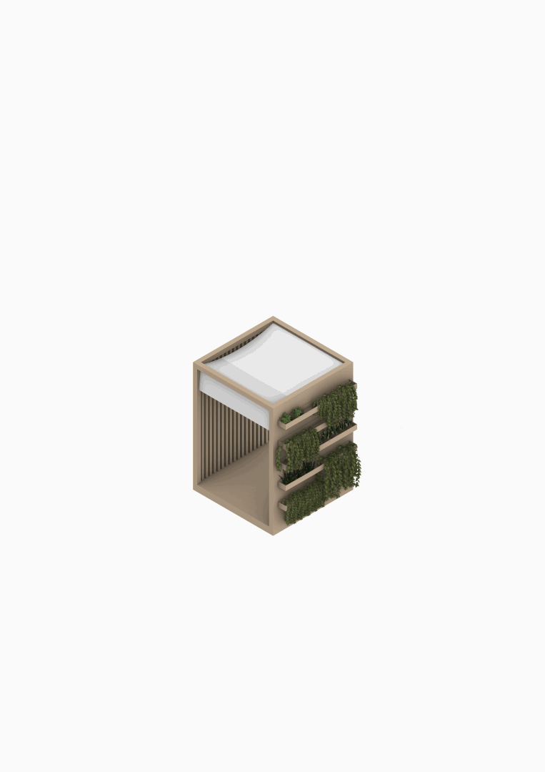 In order to comply with the accessible use regulations in Spain, accessible itineraries have been generated in the modules which consist of an access ramp and furniture at the height stipulated by the CTE. The base of each module is equipped with a radiant sheet to maintain a suitable temperature inside. On the other hand, the vertical components try to solve different aspects that we can find present in outdoor work, such as the presence of the sun and wind, and that thanks to protection elements can avoid glare or drafts inside. Said vertical components can be classified into wooden lattice walls (both vertical and horizontal), the textile wall and the vertical garden filtering and purifying the environment, renewing the air through the supply of oxygen which provides a safer, more pleasant and hygienic. Among the selected plants, some stand out that have been used in Chinese hospitals with patients infected with SARS-CoV-2, such as peppermint, or astragalus. Connecting with nature can help increase happiness and energy, with a greater sense of purpose in life, as well as make tasks seem more tolerable. In addition, a sense of responsibility of citizens is created towards the space that is given to them, having a positive impact on both the mental health and the citizenship of the users. The ECCO VITA project aims to create a new lifestyle, taking into account current difficulties. This new model of socializing wants to echo in the new generations so that they do not forget the importance of working in community while always respecting nature. Beyond construction, we want to generate a rethinking of the current structure and how we can take advantage of it to result in a more conscious, sustainable and healthy society.