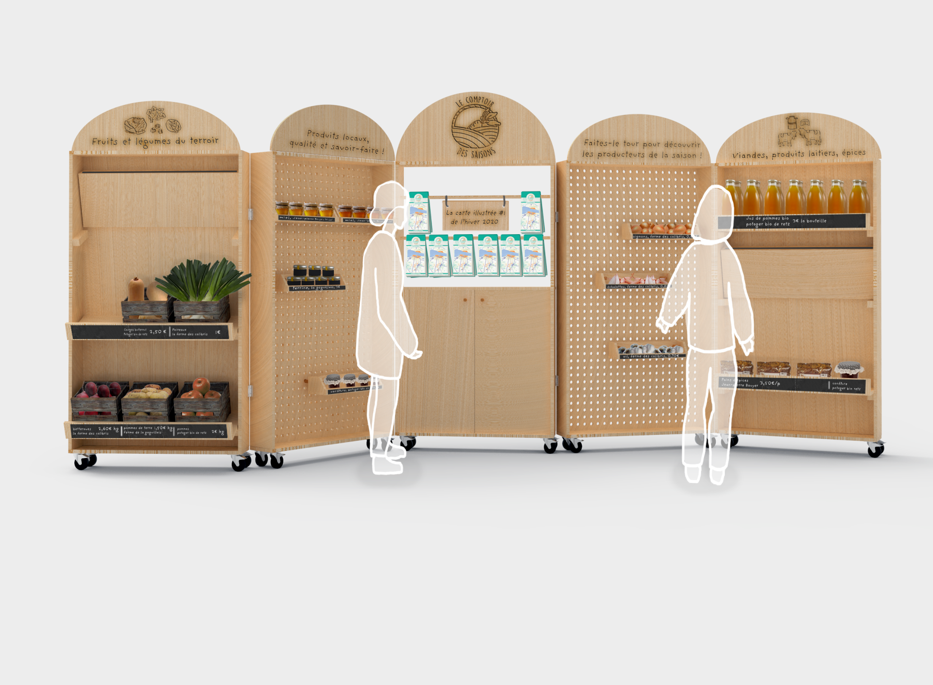 Le Comptoir des saisons offers a new kind of food service business. Intended for villages with few or no food shops, it offers inhabitants the opportunity to enjoy a variety of local products on the spot. It can accommodate a whole range of products such as fruits and vegetables, dry products, etc ... Using a system of modular panels, it adapts to its location and offers flexible time slots. In addition to that, a illustrated map will allow the distribution of the service to the inhabitants and will be published with each new season to promote local products and producers. Finally, to fully respond to accessibility issues, the service will open twice a week adapted to the resident working times and different lifestyle needs or outside traditional opening hours. This project is not a ready made answer, it is an invitation to reflect on an evolving device, which can stay in tune with the lives of its users.