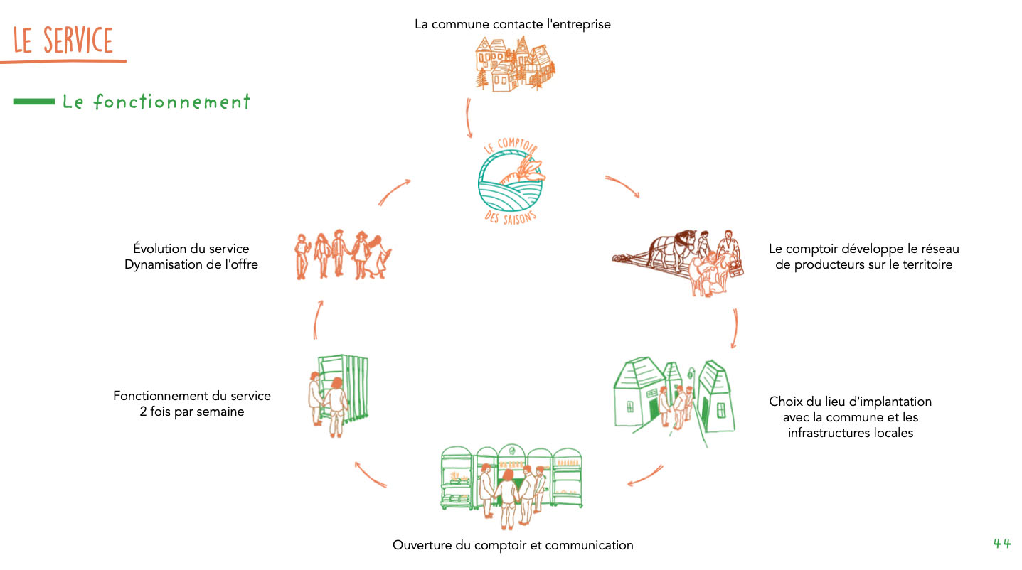 Le Comptoir des saisons offers a new kind of food service business. Intended for villages with few or no food shops, it offers inhabitants the opportunity to enjoy a variety of local products on the spot. It can accommodate a whole range of products such as fruits and vegetables, dry products, etc ...