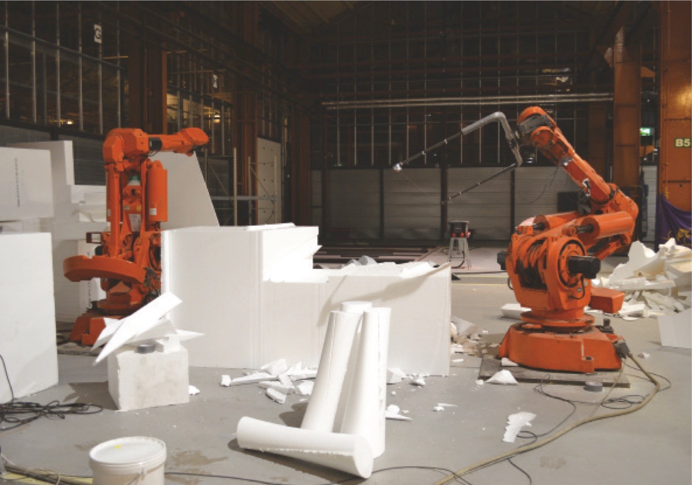 - Robotic Interaction, TALM-Le Mans, IUT de Nantes (department of mechanical engineering and automated production and the IRCCyN laboratory), 2018. Robotic Interaction, experimentation exhibition for the implementation of structures crosslinked with the help of a six-axis robotic system, questioning the potential of automated assembly on complex habitable structures. Its objective is to question the interaction between robotic manufacture, digital design and environmental challenges. Transdisciplinarity, collaborative project management, machinery manufacture, so many different intelligences for efficient experimentation. The exhibition is the result of this experimentation. The students of TALM-Le Mans have worked together on the creation of prototypes, sculptures, structures, large-scale works, sometimes close to monumental, from design to manufacture, verifying the importance of experimentation in the approach of the most modern digital tools. The robot in communication with the computer is the binder between experimentation, creation and innovation.