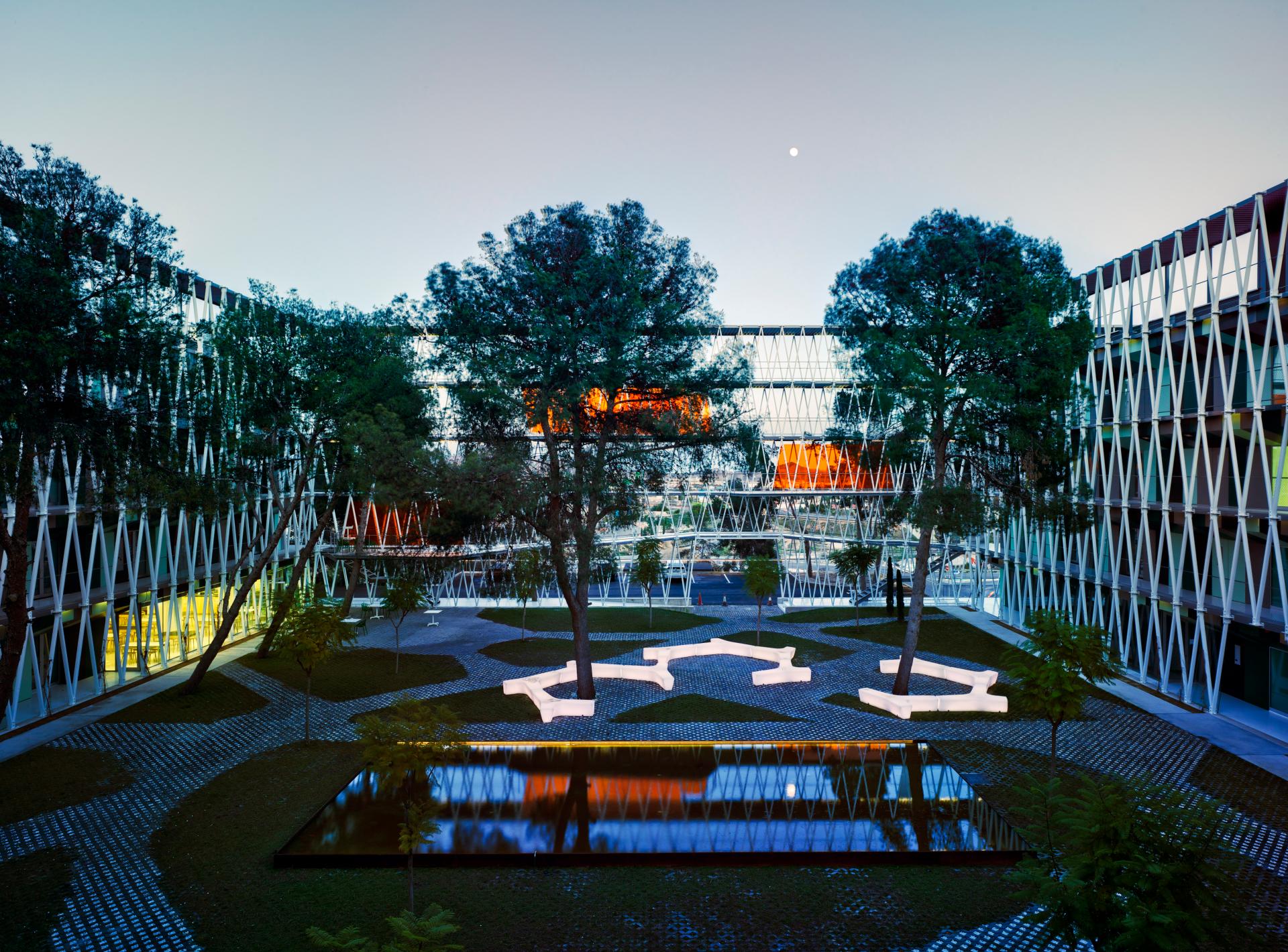 The building promotes coexistence in its interior, contributing to the social and participative development of the citizens. The perimeter galleries allow universal accessibility and an encounter with nature, creating a space for inclusion, social relations and integration. The creation of open-air work spaces among the trees enables the exchange of knowledge and synergies between companies. The facilities created allow the use and access of students to its gardens and event and food catering spaces. The vegetation and the paving of the courtyard outline the most used routes in the building, encouraging the use of the courtyard as a link between buildings as well as a meeting place.