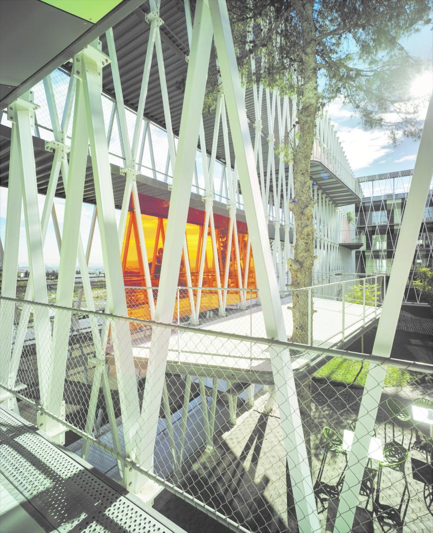 Changing façade. Each façade has been designed differently according to its orientation and its emplacement in the inner or outer courtyard. The density of metal sheets depends on orientation as well, making it possible to take advantage of the east-west breezes of the valley through the permeability of the structure.