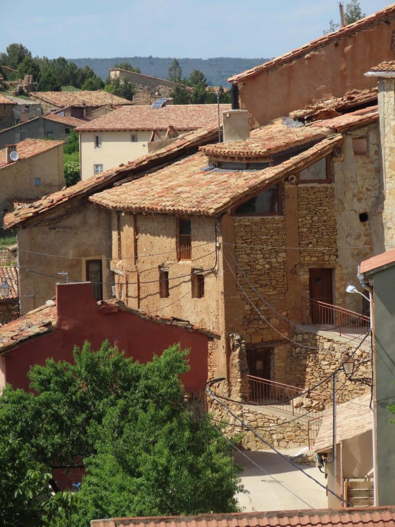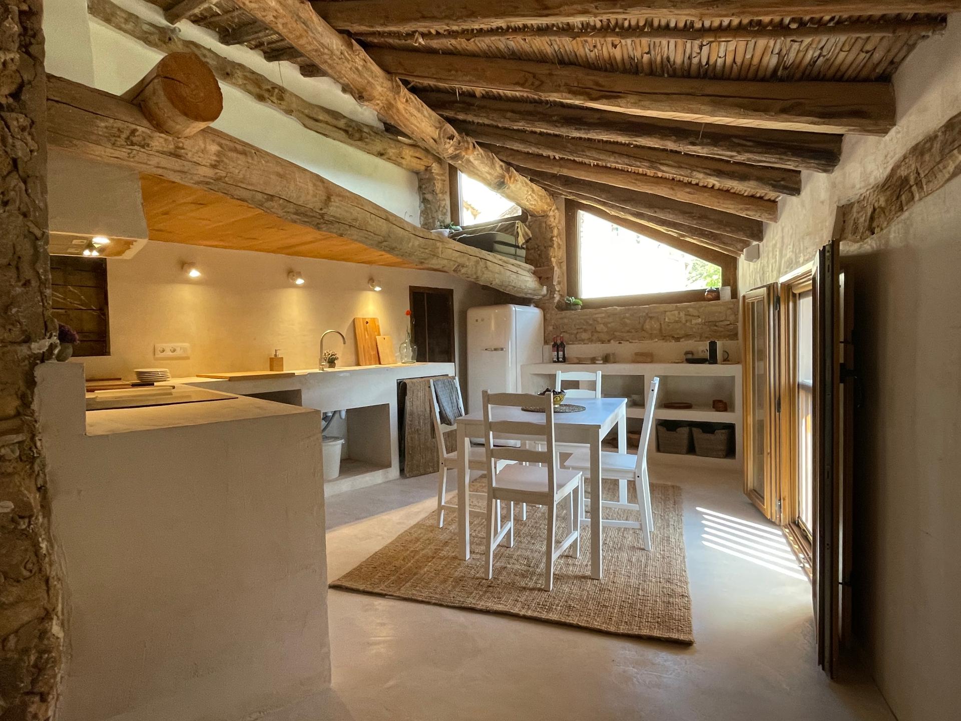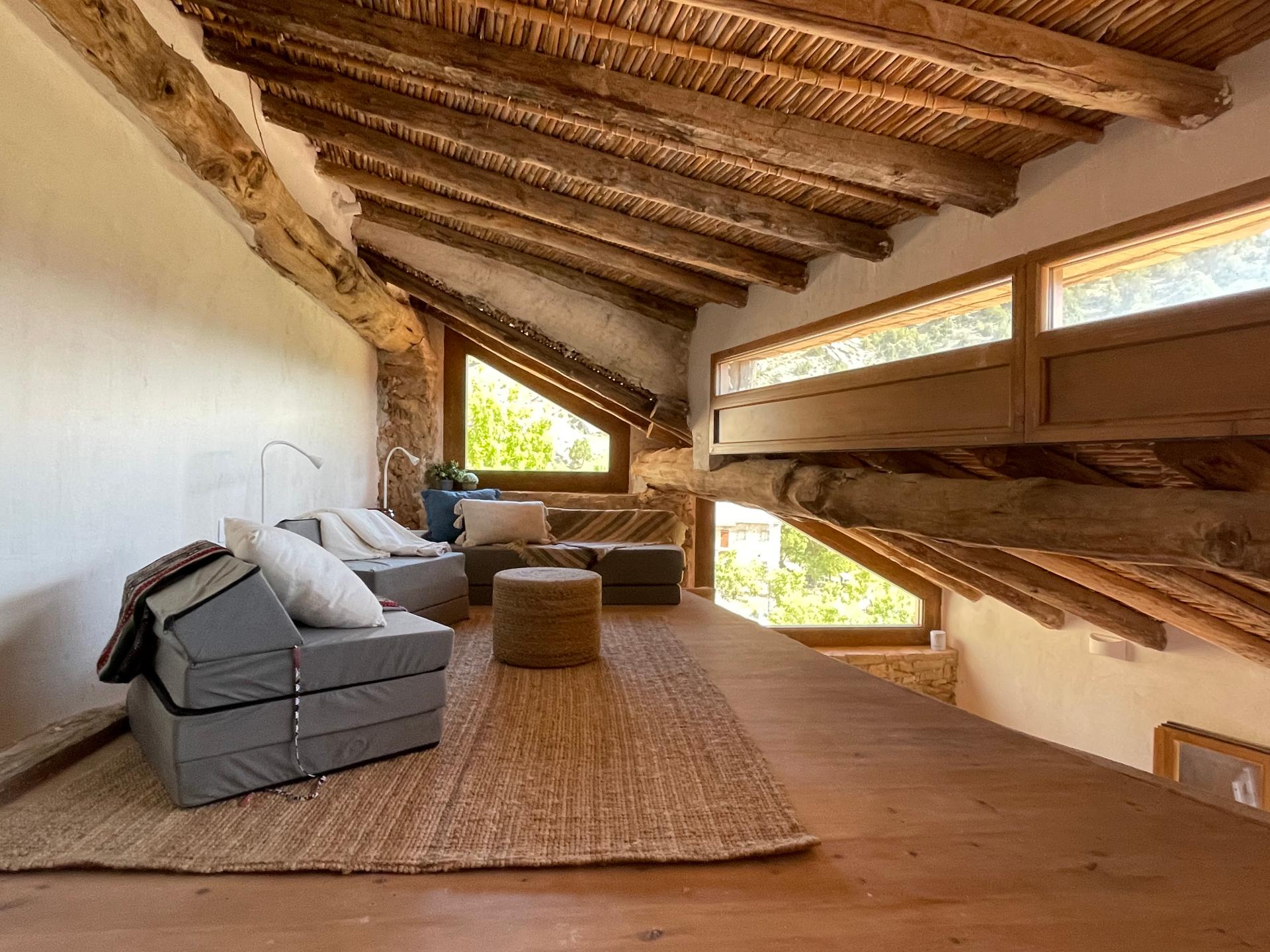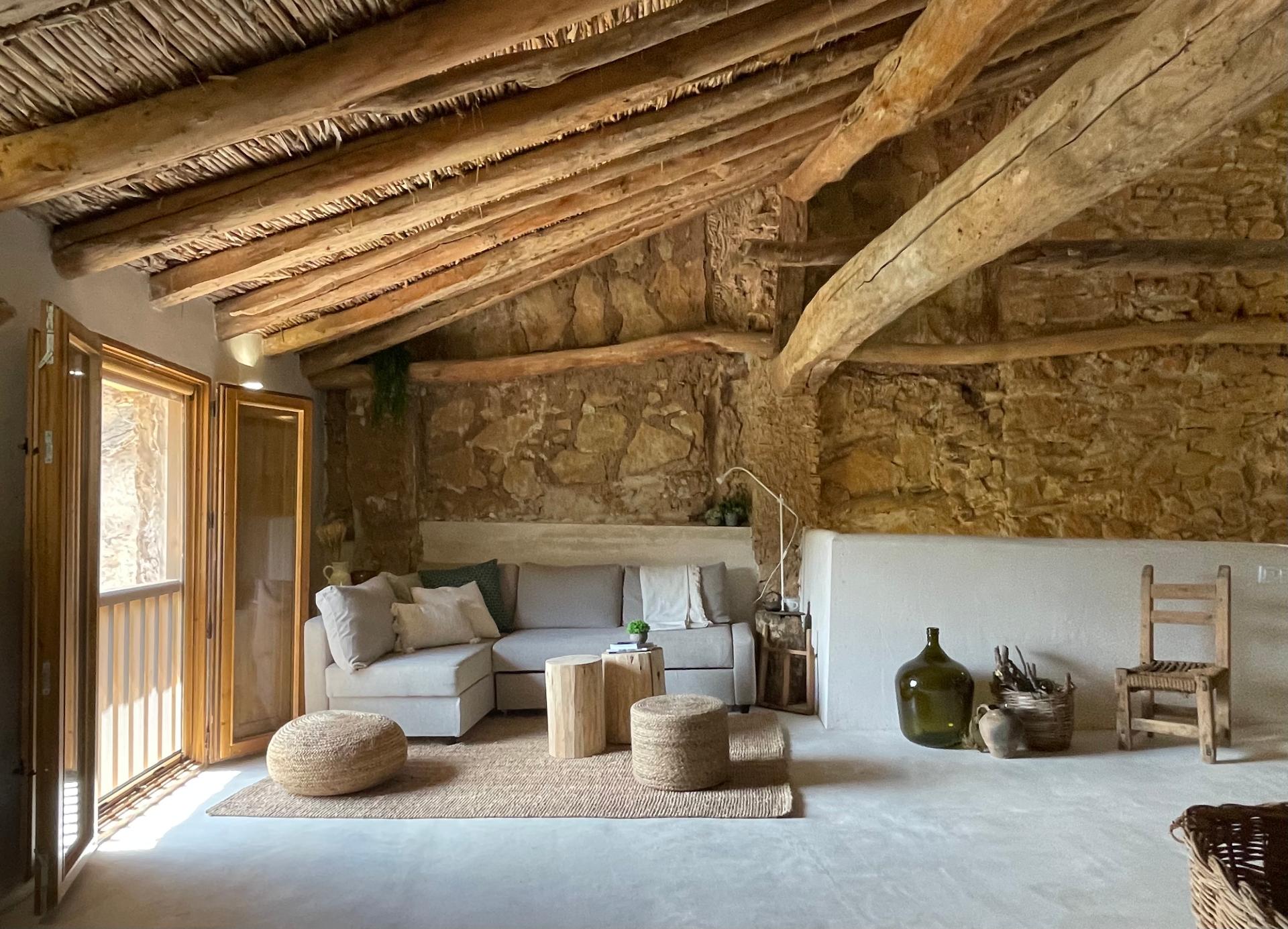 Any existing bare rough stone or stone slab walls have been maintained and any existing gaps have been jointed. Interior gypsum-rendered walls have been re-rendered after adding thermal insulation and new walls. Very fast-setting gypsum was used as rendering, following tradition and leaving the natural marks of the trowel. Flooring had a waxed gypsum rendering, recovering an almost-extinct local tradition. Double-glazed wooden windows were added where previously there had only been wooden shutters.