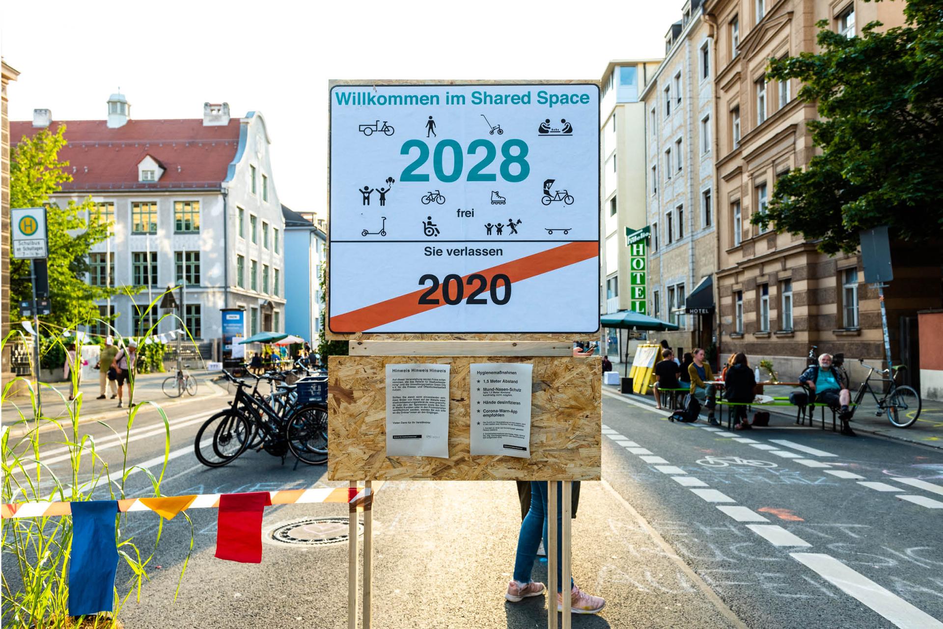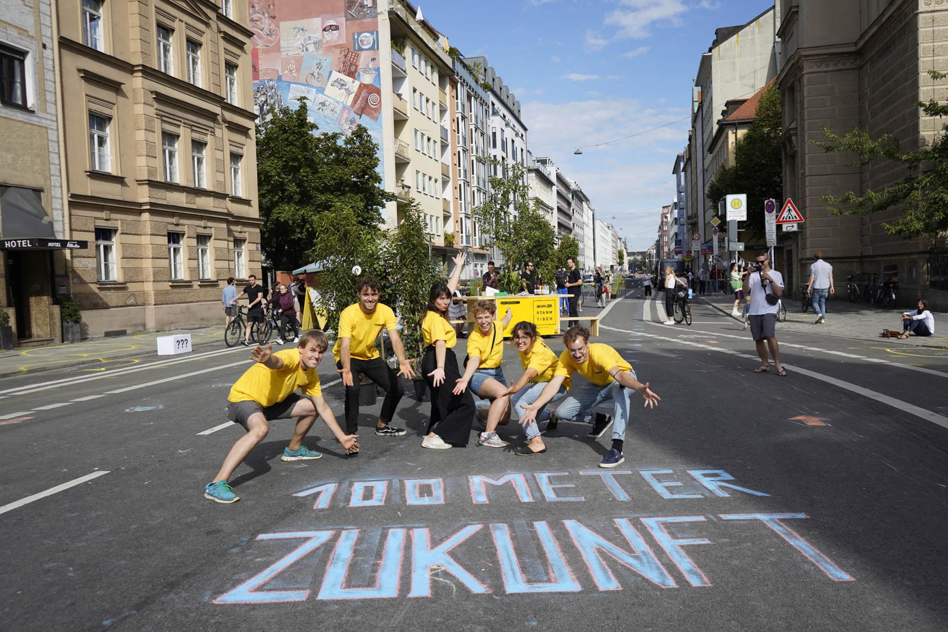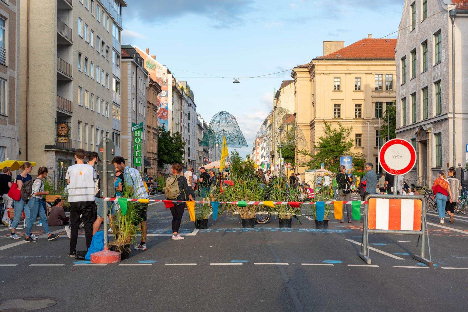 One and a half years ago, students of architecture, urbanism and landscape architecture founded the Referat für Stadtverbesserung* (City-Departement for urban enhancement) without a municipal mandate but with the urgency, that such a department is needed when city-planning has to cope with both climate change and rising social inequality. It is both a conceptual project on lobbying for a socio-ecological city and a mode for us to not only phantasies but actually practically changing the city for the better. Bridging the gap between virtuality and reality we concretize and implement concepts and political decisions. Our actions are layered and oscillate between activism, social-entrepreneurship as well as political involvements on different levels to lobby for a more just city. We are addressing the monofunctionality of public space, being mostly used for traffic. These spaces could be valuable uncoded spaces, serving multiple uses for environmental and social sustainability. Nevertheless, these potentials are unnoticeable in the everyday. Therefore we developed the urban simulation, to use experiences as a communication tool with a lowthreshold. Disrupting the status quo, they stimulate the imagination of the citizens. Through temporary simulations, problems can be evaluated on demand and long-term concepts can be improved. For this reason, simulations are the first and an important step on the way to a sustainable and social future. An example-project is our work for the communities in Schwanthalerstraße, Munich. The street is a major traffic axis into the inner city, connecting diverse neighborhoods with flourishing culture, while not serving the communities with valuable public space. Following the motto »if we can make it there, we can make it anywhere«, we developed a long term concept and made it tangible with our life-size simulation »100 Meter Zukunft« (100 meters of future).One day the street was not dominated by traffic but by the life of the people.