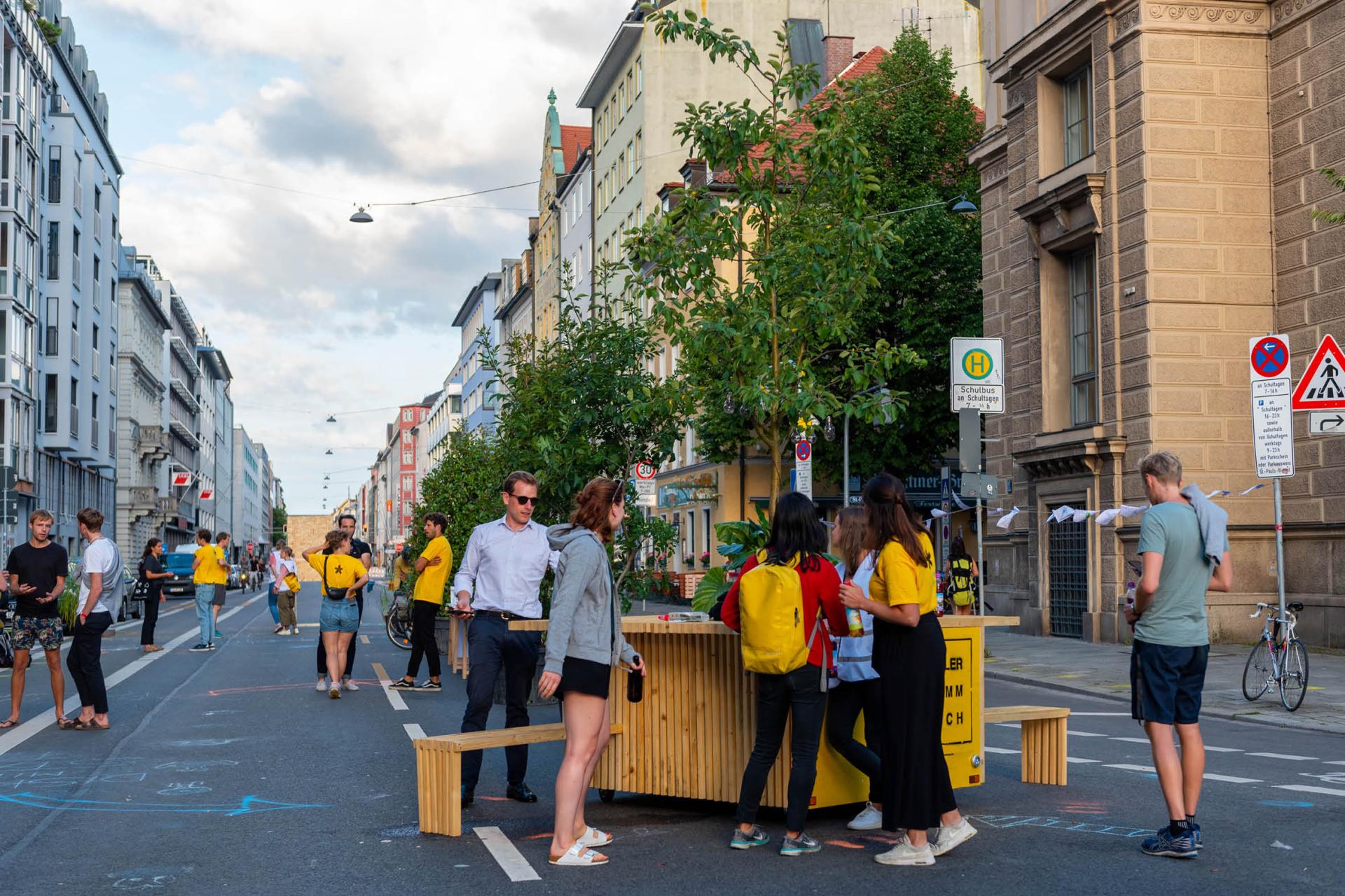 One and a half years ago, students of architecture, urbanism and landscape architecture founded the Referat für Stadtverbesserung* (City-Departement for urban enhancement) without a municipal mandate but with the urgency, that such a department is needed when city-planning has to cope with both climate change and rising social inequality. It is both a conceptual project on lobbying for a socio-ecological city and a mode for us to not only phantasies but actually practically changing the city for the better. Bridging the gap between virtuality and reality we concretize and implement concepts and political decisions. Our actions are layered and oscillate between activism, social-entrepreneurship as well as political involvements on different levels to lobby for a more just city. We are addressing the monofunctionality of public space, being mostly used for traffic. These spaces could be valuable uncoded spaces, serving multiple uses for environmental and social sustainability. Nevertheless, these potentials are unnoticeable in the everyday. Therefore we developed the urban simulation, to use experiences as a communication tool with a lowthreshold. Disrupting the status quo, they stimulate the imagination of the citizens. Through temporary simulations, problems can be evaluated on demand and long-term concepts can be improved. For this reason, simulations are the first and an important step on the way to a sustainable and social future. An example-project is our work for the communities in Schwanthalerstraße, Munich. The street is a major traffic axis into the inner city, connecting diverse neighborhoods with flourishing culture, while not serving the communities with valuable public space. Following the motto »if we can make it there, we can make it anywhere«, we developed a long term concept and made it tangible with our life-size simulation »100 Meter Zukunft« (100 meters of future).One day the street was not dominated by traffic but by the life of the people.