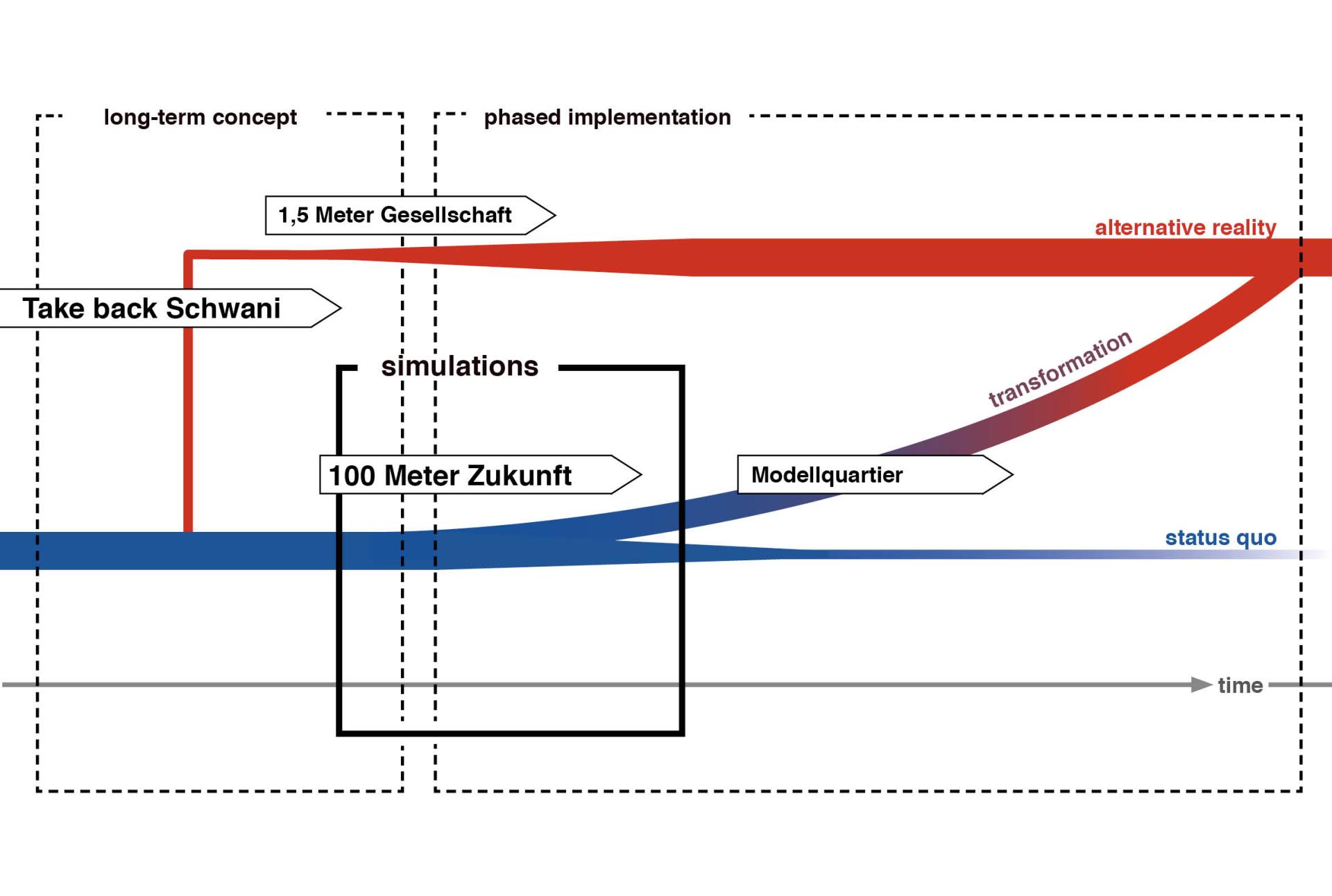 We understand sustainability as measures to examine whether our work contributes to both a socially inclusive and ecologically resilient city. The biggest problems cities are facing today are stemming from climate change and social injustice, therefore city-planning needs to address these topics in a sustainable way to ensure that cities are not only places people need to but people want to live. In the end adjustments need to be made to the surroundings of our everyday, which is in most cases the city. To make Europeans favorite place to live, the city, more biodiverse and climate-neutral, we are engaging in public space and in particular street spaces, because these are still optimized for combusting rather than compensating the pressing problems of cities. Today, street spaces are dominated by motorized individual traffic and sealed surfaces. There is still untapped potential in terms of both climate protection and adaptation. We are thus mainly led by the following questions: How must the space be designed to provide space for future-proof forms of mobility but also reduce traffic in favor of other uses of public space? How do we accelerate the necessary adaptation of our cities to climate change by improved green and blue infrastructure? And how can these questions be answered without consuming large amounts of resources for large scale urban redevelopment? We are convinced that thoughtful and sensitive interventions are necessary in the intermediate between testing and permanence. Therefore our simulations come in place. By intuitively grasping and feeling the interventions, they can be evaluated just-in-time, improved for structural permanence and achieving thus the goal of creating a large effect with fewer resources. This way of working corresponds to our understanding of the city, which we see as constantly inconstant and unfinished.