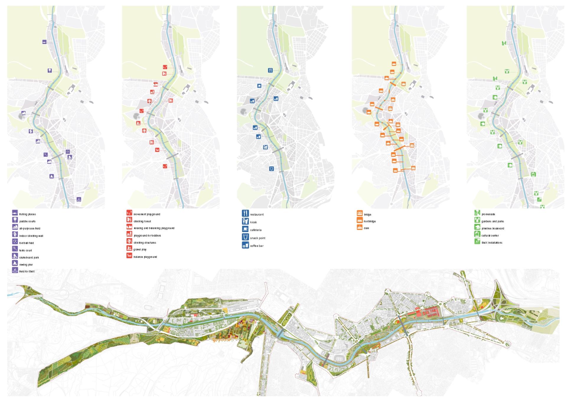 In addition to these three landscaping operations, which are consistent with each other, the projects propose 150 interventions of different kinds, among which the system of bridges stands out, providing the river course with an unprecedented level of permeability. Solutions to more than 20 bridges or river crossings have been developed, restoring seven dams, reusing some of the existing bridges and creating new crossings, some unobtrusive and others deliberately expressive. Like a microsurgical operation, the proposal incorporates, step by step, a series of formulas to integrate the river with the city and the city with the river. They are elements guaranteeing the transition of the new values of the regenerated riverbanks to the nearby surroundings and neighbourhoods. With this ripple effect, a succession of operations is anticipated that will ensure far-reaching renovation.