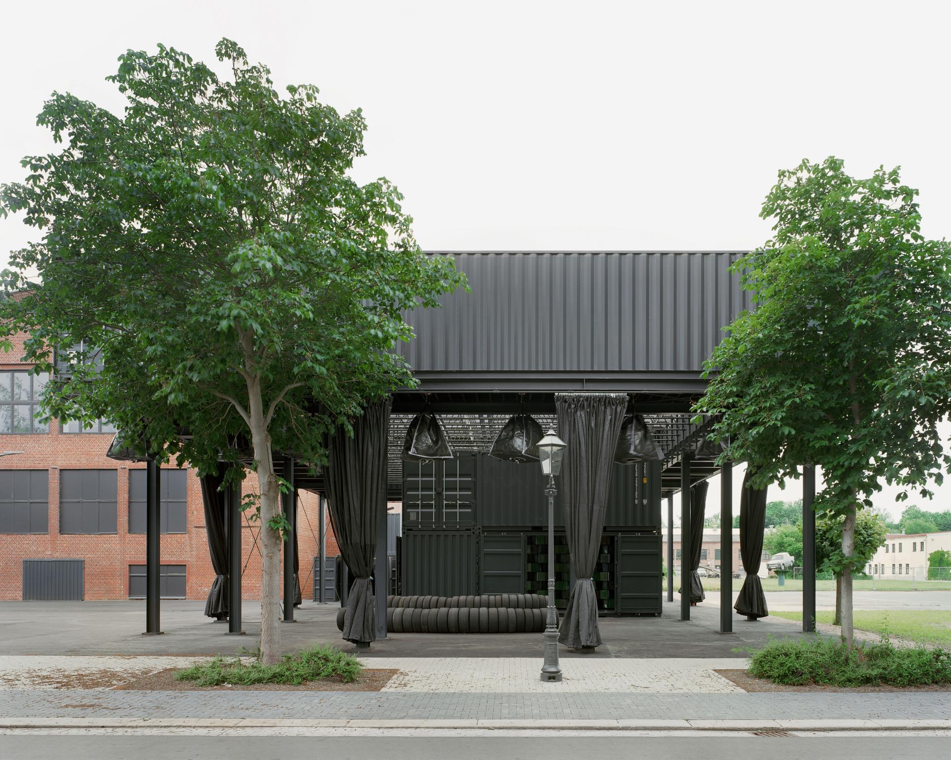 All new building volumes are made from used sea containers, which will be brought back into circulation after the disassembly. All supporting structures are made from reusable scaffolding trusses, reusable steel construction modules, or wood as a sustainable material. The furnishing elements, such as counters and lockers made from toolboxes or seating furniture made from car tires, consistently follow a holistic design concept of re-use. Topics such as industrial heritage, product exchange and recycling processes thus become legible as design-determining aesthetics.