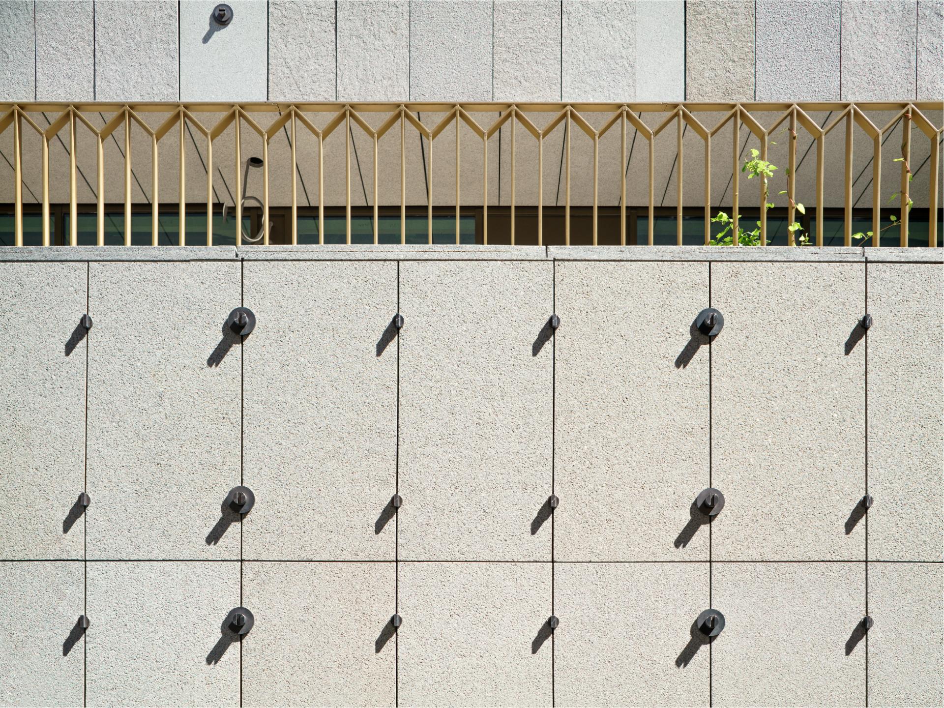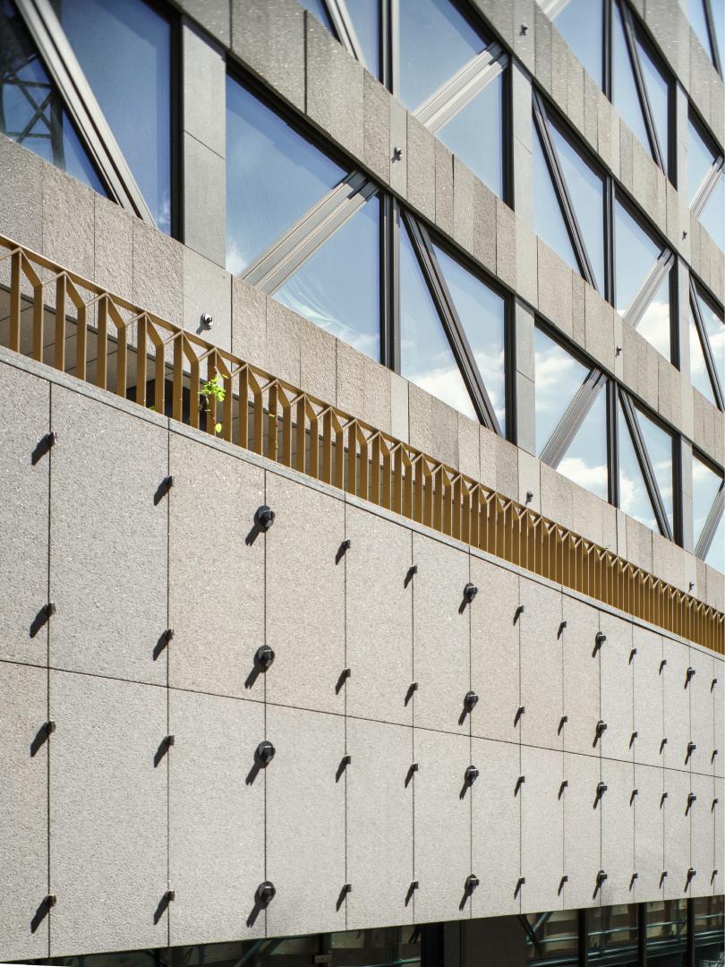 As a starting point, the building's framework was retained and strengthened on some parts to be able to build on new floors, including a two-storey high truss to collar over the car tunnel that runs under the S-building. Furthermore, the facades are new, but are built of the same material as the original facade, with cross-hammered granite and brown anodised aluminum. A large amount of the stone facade is recycled which connects the building to its history, makes the facade more alive with a patina character and makes the reconstruction more sustainable. The existing granite stones have the potential to last for several hundred years and Marge Architects emphasize that the beauty of the original stones is, among many things, their greater variation in width and thickness, something that would not be possible or economically defensible with today's technology. Each stone is unique and thus creates a texture in the facade. By keeping the original structure and re-using the facade material, the transport of materials in and out from Swedens most central spot was in addition reduced. Another sustainability approach involved in the project was the use of a green roof, both for the management of rain water which is used to flush water in some of the building's toilets, furthermore with biotopic benefits.