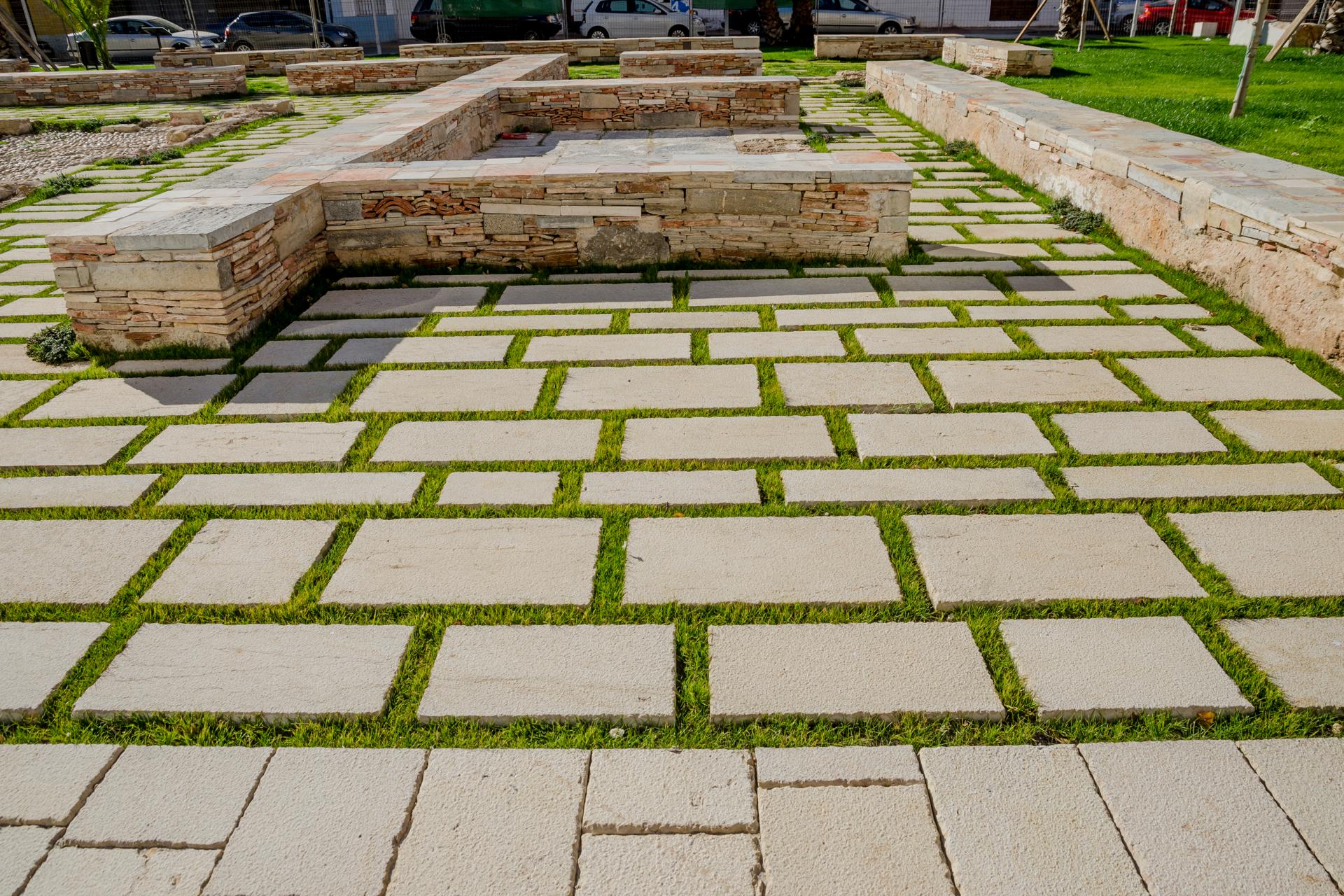 The paving installed consisted of Cenia stone slabs with a bush-hammered finish, in different lengths and widths, quarried with irregular edges, with open joints between slabs and from the remains of the walls of the convent, so that grass could be planted between slabs.
