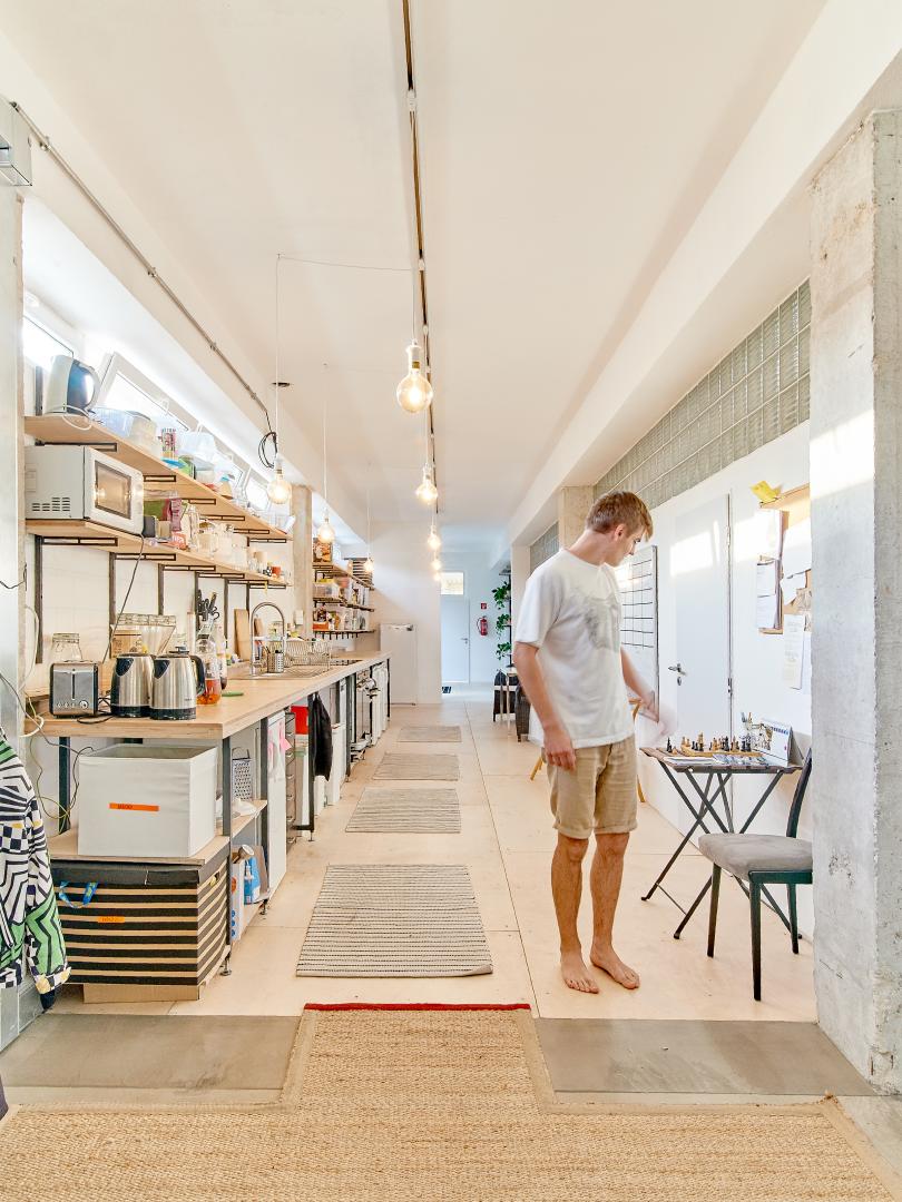 We moved warehouse space from the dark basement to the place under the kitchen, suitable in case of noisy works. it enables the opportunity of a gastro area, too, which could serve as a public shared space.