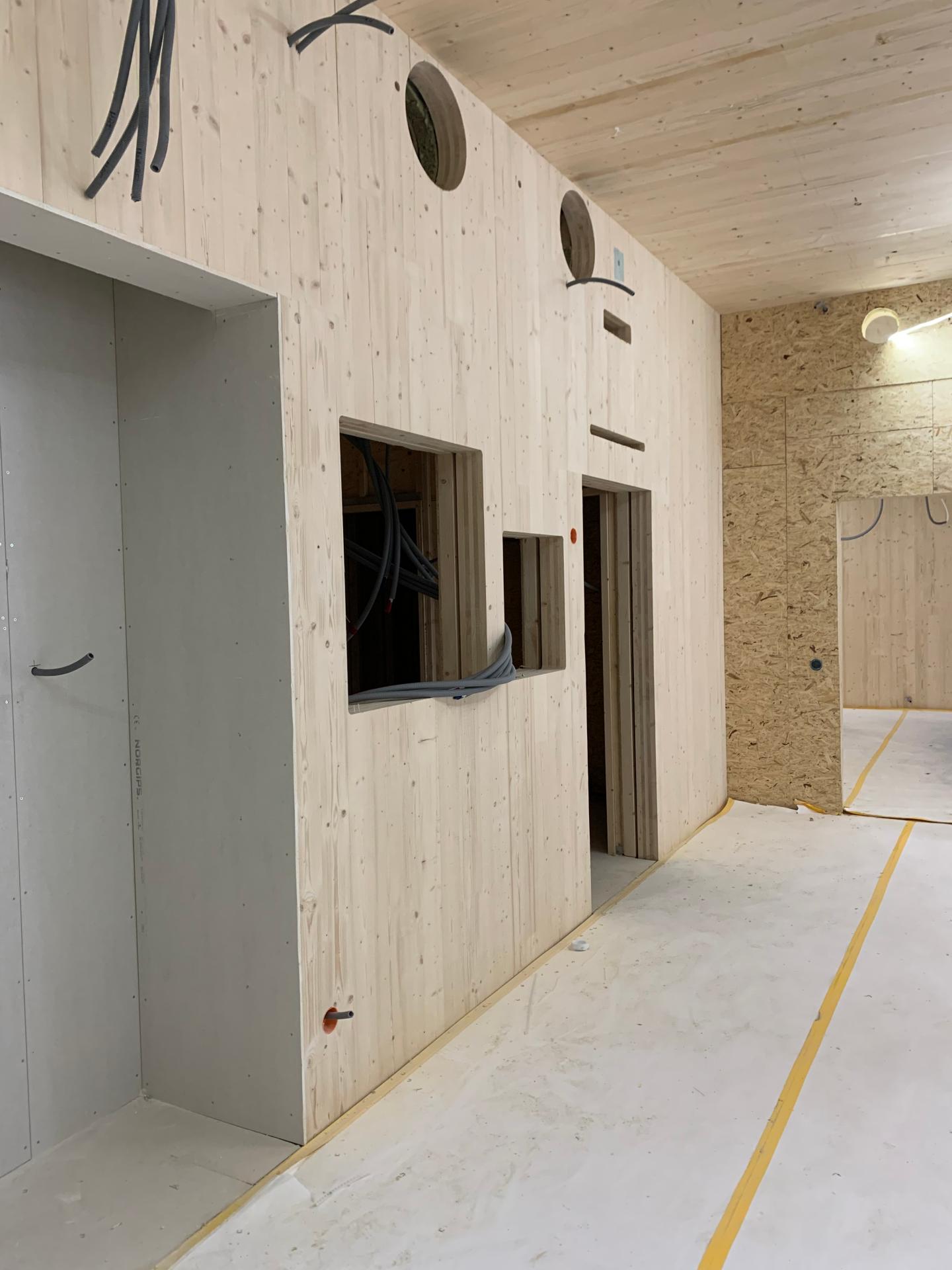 For almost all the building and structural components, the choice landed on solid wood. Walls, ceilings, and joists consist of cross-laminated wood. The facades are clad in natural wood, the floor is planned in cork, and most of the interiors are covered with structural wood or plywood. Much of the structural wood is sourced from the municipality’s own forestry.