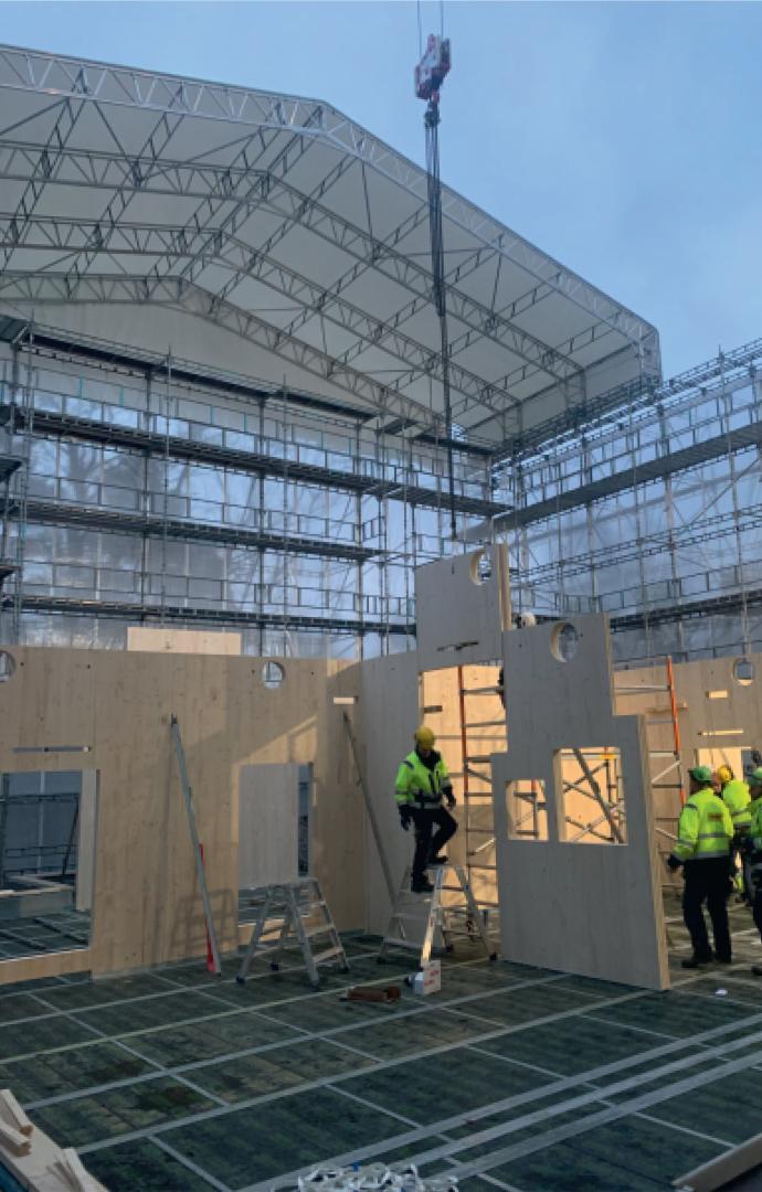 The building is resting on a foundation of Koljern, which is made from recycled glass. Almost every other building component is made of solid wood. The floors are made of cork and most of the interiors will have a surface layer of wood.