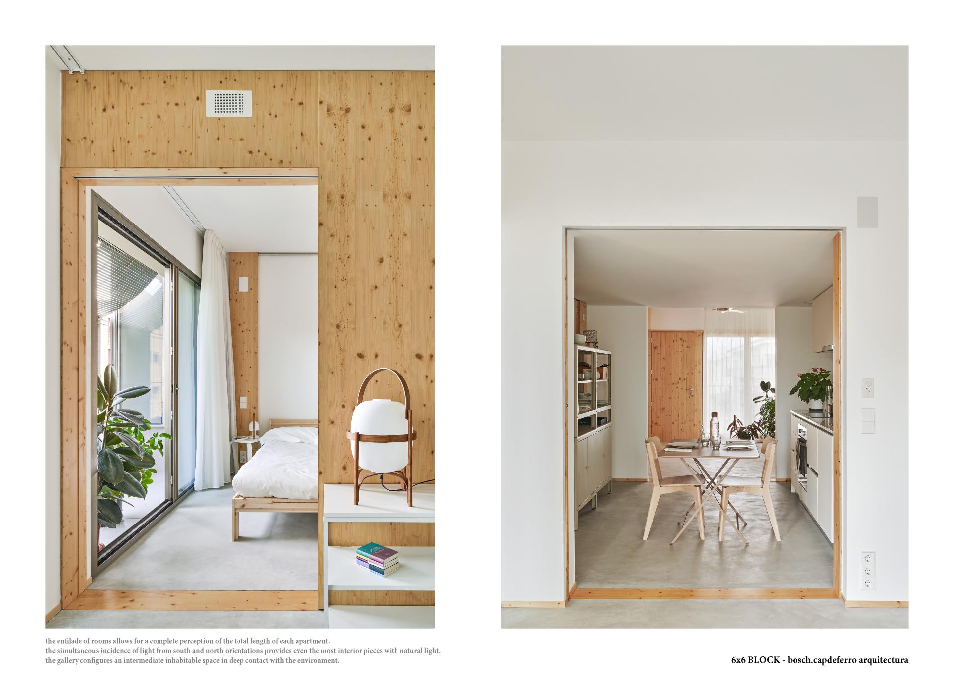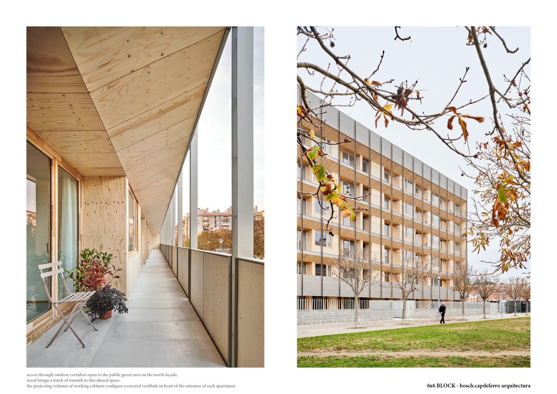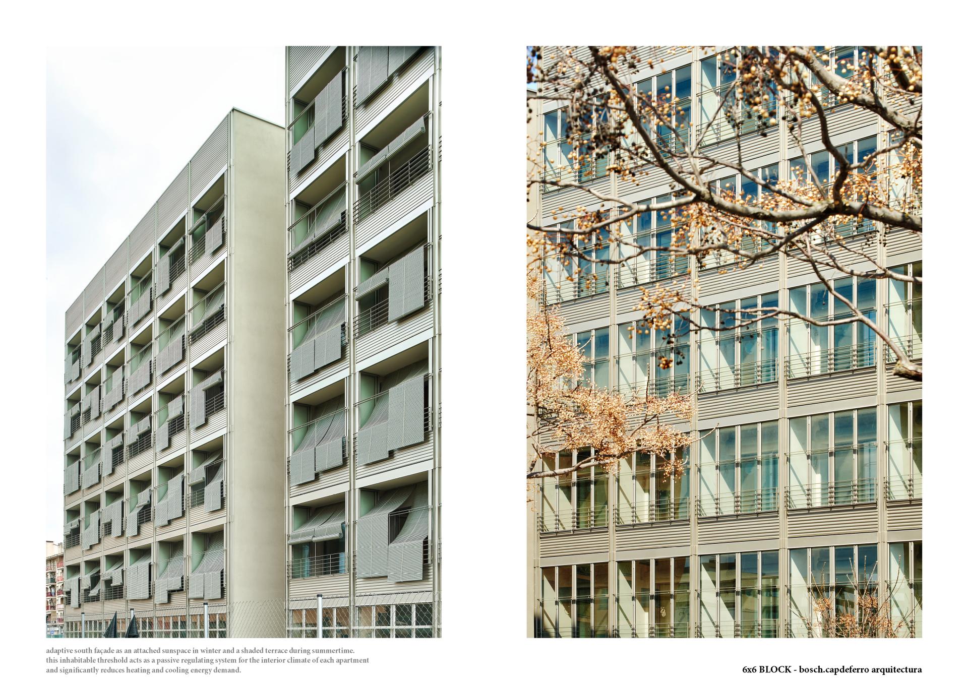 The 6x6 Block experience aims to contribute to mitigate climate change as it is a built example that significantly reduces the carbon footprint along the life cycle of the building. Due to the use of timber for the construction of its structural elements, carbon-intensive materials are avoided and more than 900 m3 of CO2 have been removed from the atmosphere. Regarding the operational emissions, the total energy demand has been highly minimized (7’09 kWh/m2 year for heating and 2’26 kWh/m2 year for cooling) achieving a 72% reduction in relation to the average building considered. On the other hand, a 100% electrical system is used, so solar panels can generate all the energy needed in a self-consumption scenario of green renewable sources. Besides the technological aspects of the buildings, aesthetic ones must play an essential role. As Pier Luigi Nervi wrote, “the principal and substantial duty of the architect is to give expression to the different factors and coordinate the specific trades which combine to put up a modern building”. With the irruption of new materials and construction techniques a new image must be found, one which can inform the aesthetics of our times and the amazing challenges we are facing as a contemporary definition of beauty. The 6x6 Block seeks the limpid architectonic expression of a coherent system that combines efficiency and clarity with a permanent interaction with the climate and the environment, creating a comfortable shelter from where one can enjoy life.