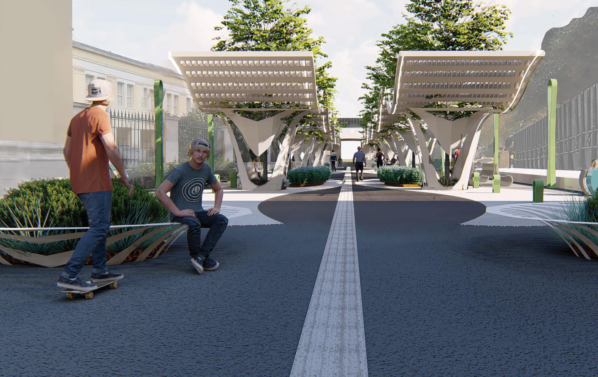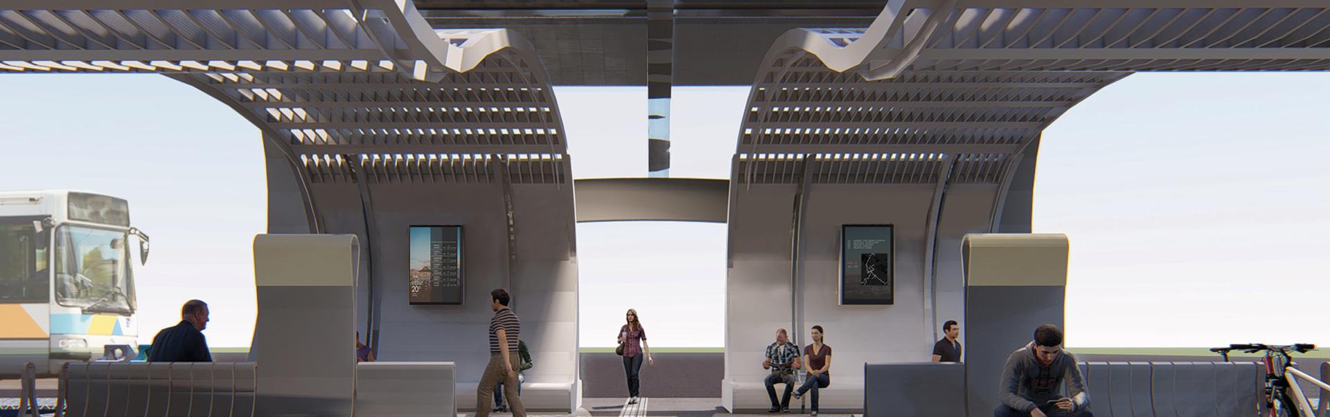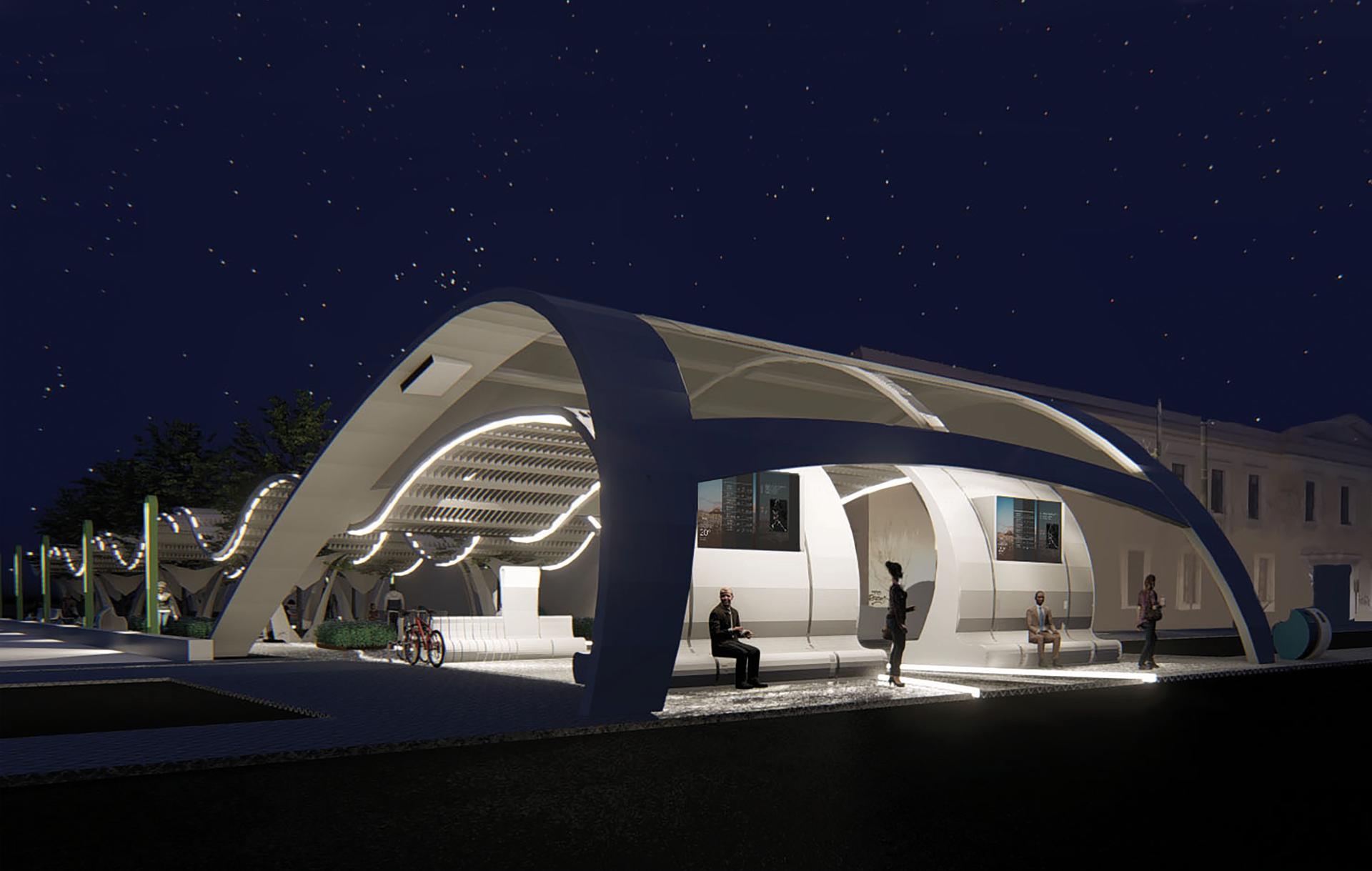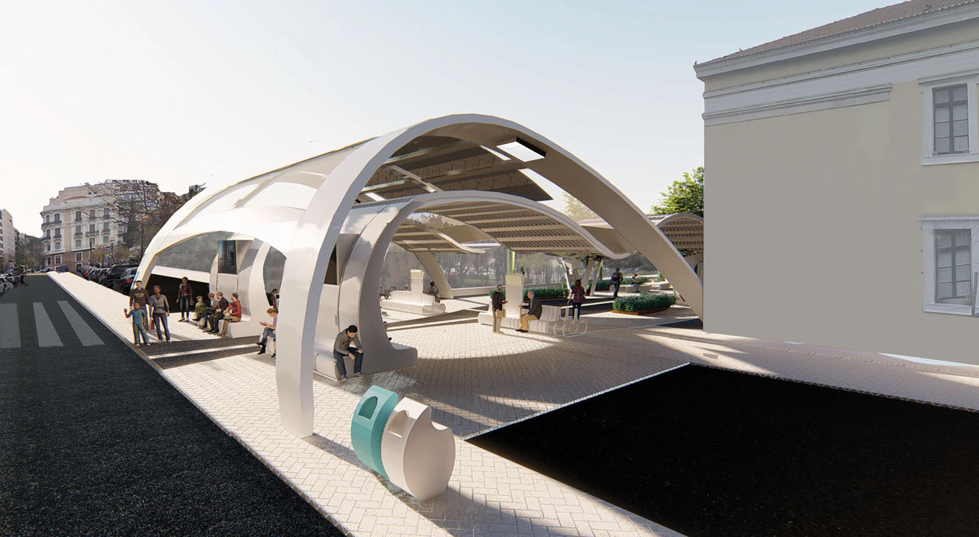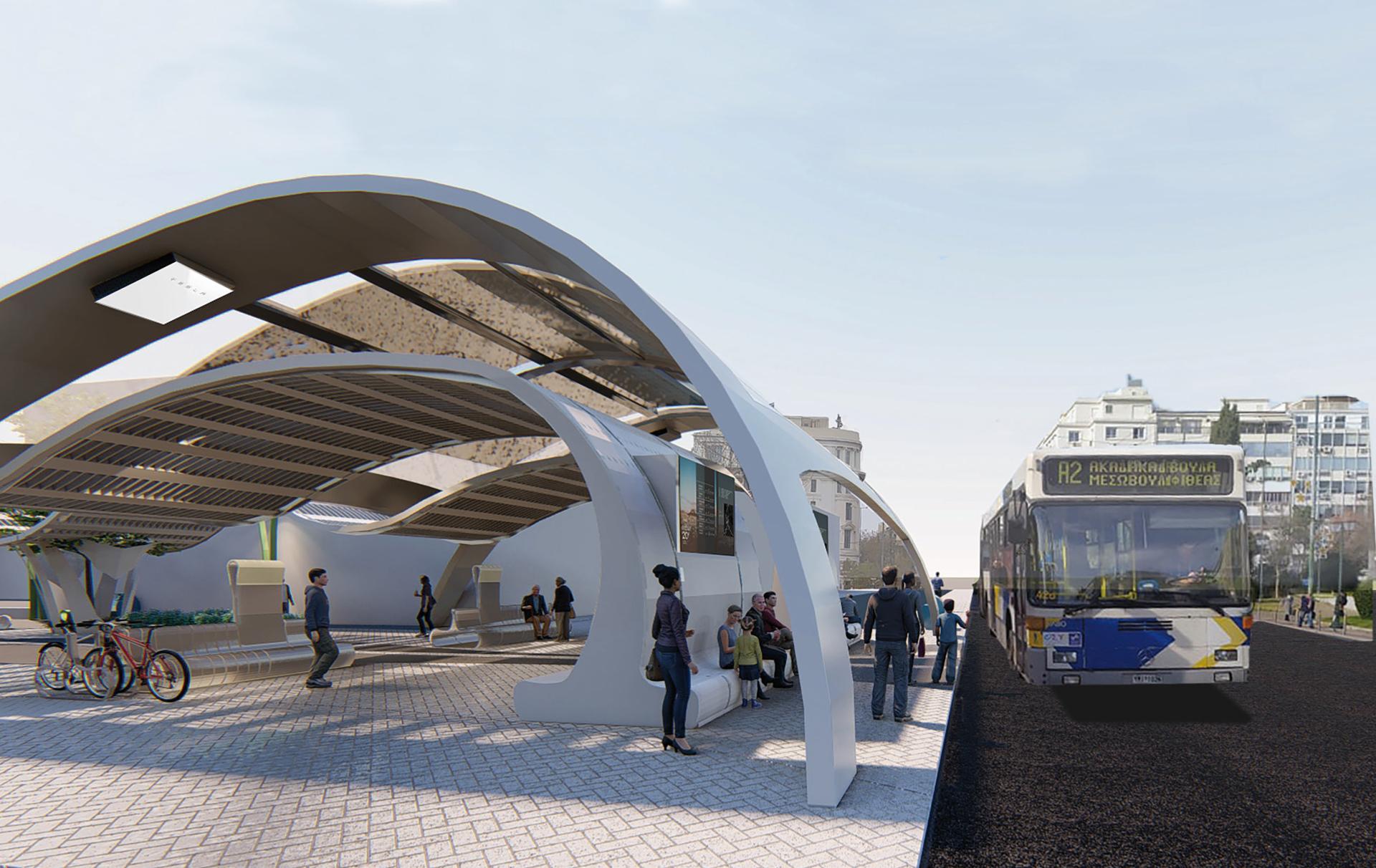 Driven by personal experience and analyzing the results of a questionnaire which was put to citizens-users of a specific urban stop on Akadimias Street, regarding the specifications of an urban stop, I conceived the idea of creating a stop, which will meet all their requirements, so that waiting for the bus is a pleasant experience.The installation does not need to use electricity as it is autonomous due to the solar panels that have been installed on its roof and provide electricity for the screens it contains and the lighting. During the elaboration of the work, the need arose to renovate the space behind the bus stop, which is a pedestrian street, offering them rest, shading and protection in specific conditions e.g. rain, intense sunshine.