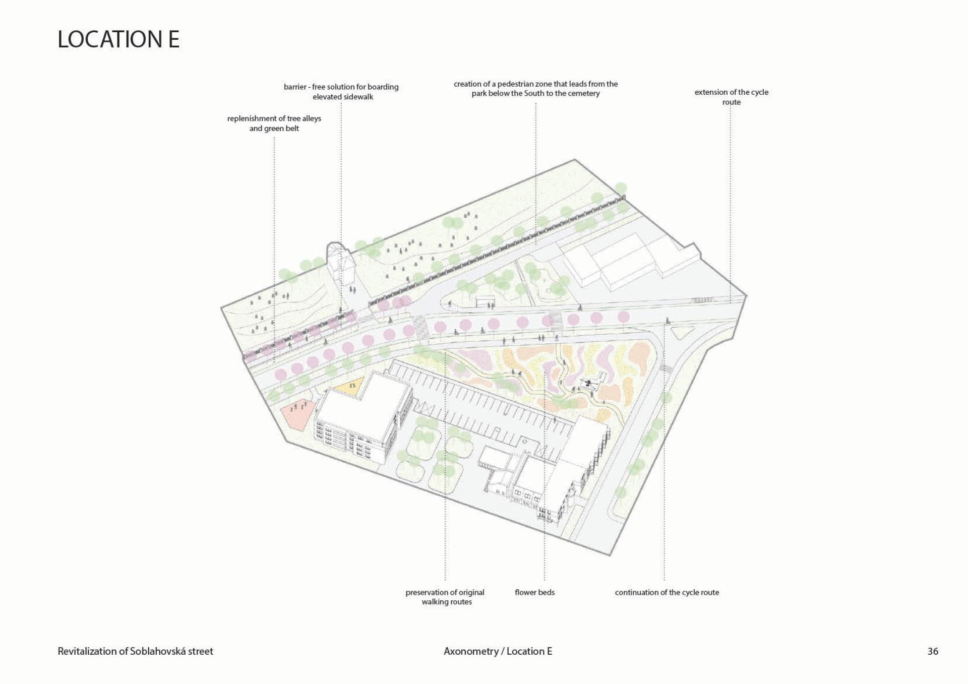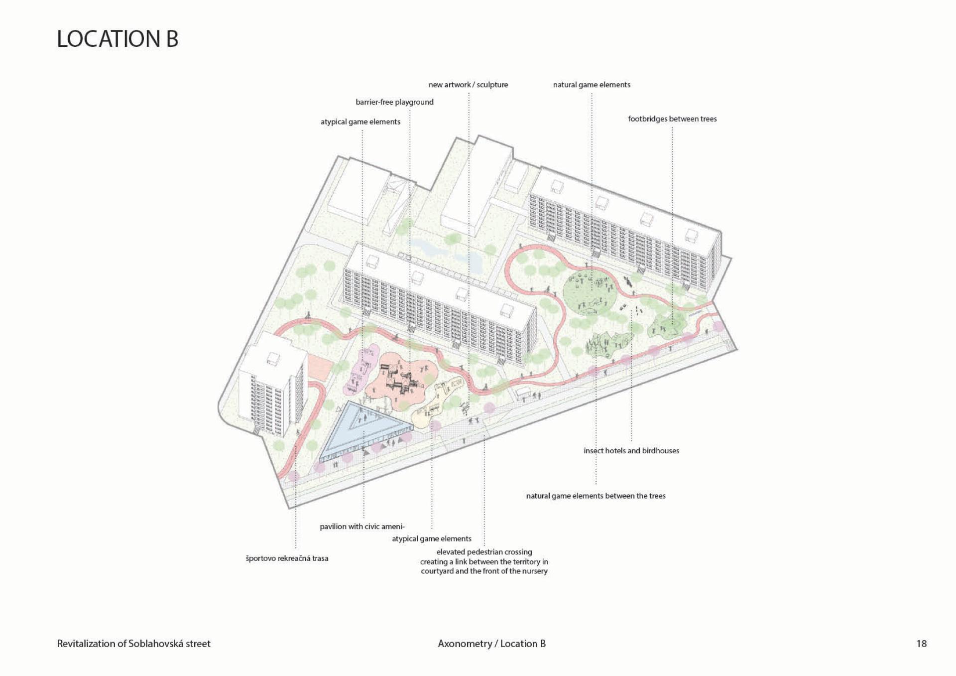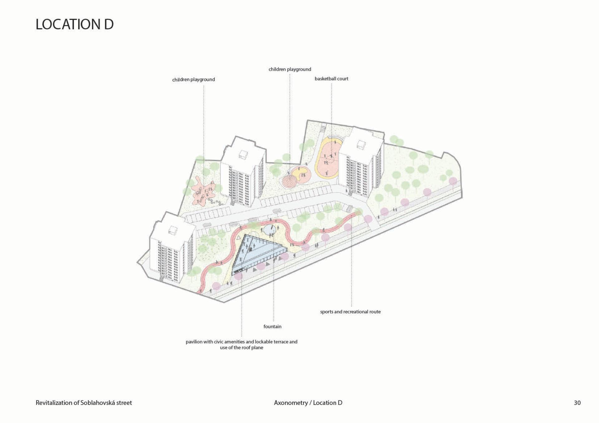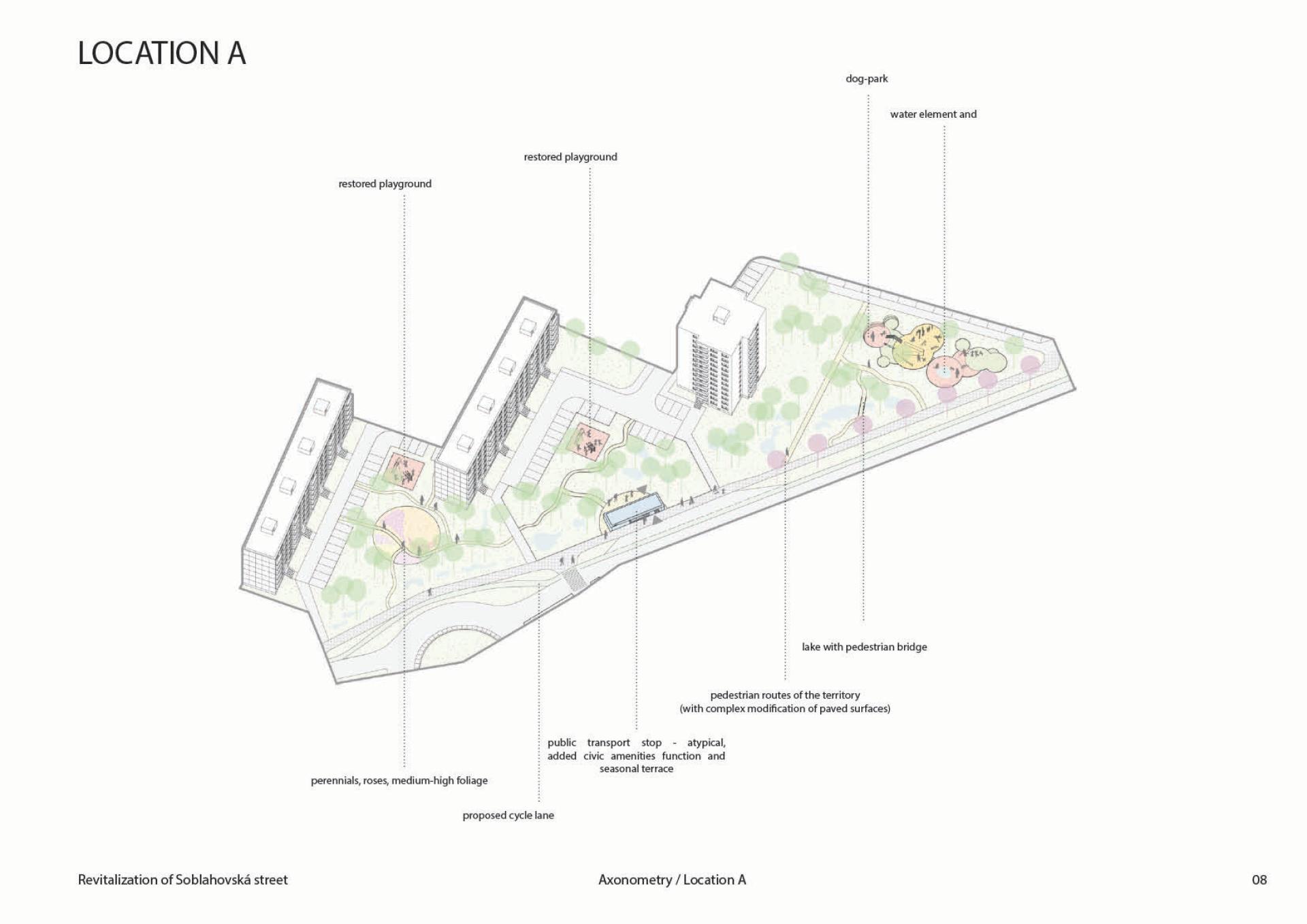 The proposal seeks to search us in all existing elements of Soblahovská Street to find their meaning and values and to try to save and revitalize them and show the public and users that we do not have to destroy even the elements of the past due to negative associations. The proposal seeks to work as much as possible with existing greenery and the addition of new vegetation crops. In the design, we also work with water and cooling water elements. We try to design waterproof surfaces for all paved surfaces and thus maintain rare rainwater in the area or collect that water to rain gardens and make street more pleasant, especially in summer. In the areas of the nursery, we work with the existing dense vegetation, add natural play elements to them and create homes for birds or various species of insects, thus supporting the ecosystem in urban areas. We will also try to consult the collection of rainwater in the raids and its possible subsequent use directly from the surrounding buildings.