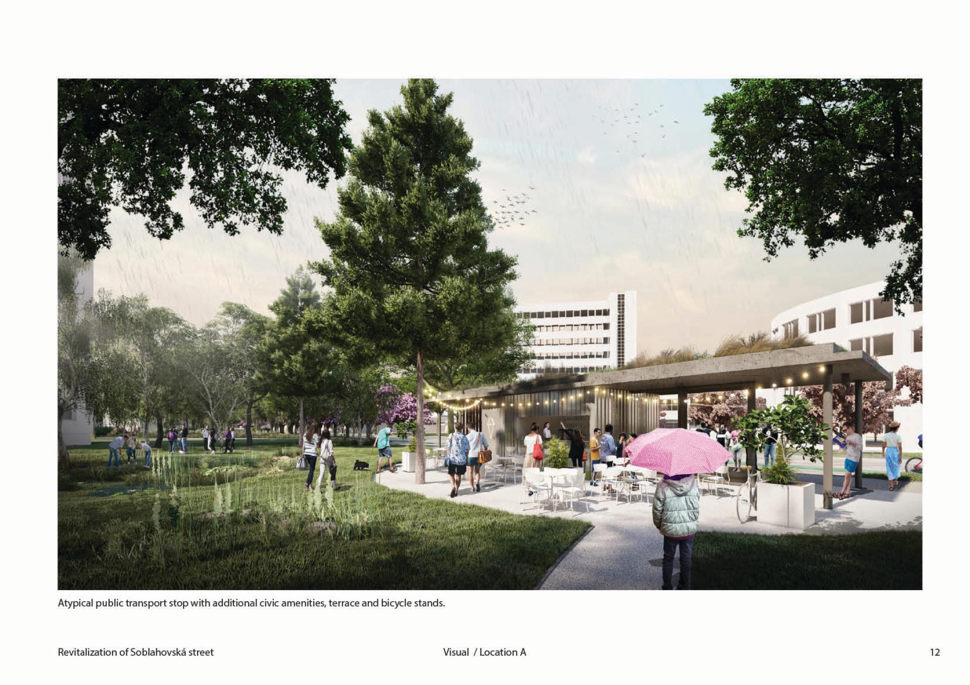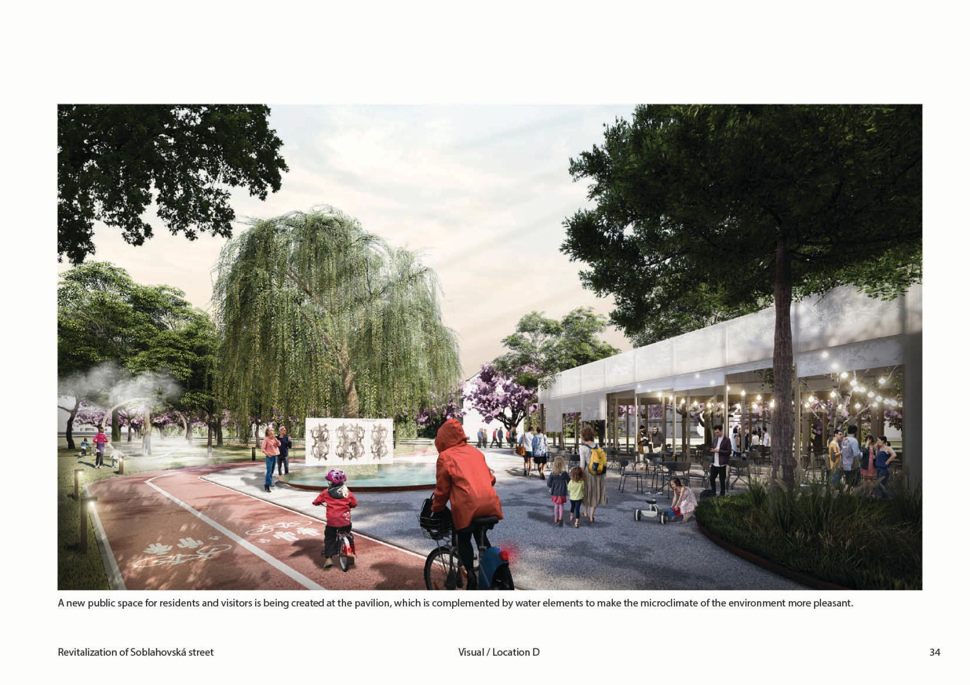 Soblahovská street revitalisation is a realistic view into the future. We propose a site specific project connecting the qualities of the past, reviving the public artworks and connecting them with elements of contemporary and environmentally responsible urbanism. We are supporting the alternative ways of transport, reconstructing sculptures, reviving fountain and adding a free time activities for residents or visitors.