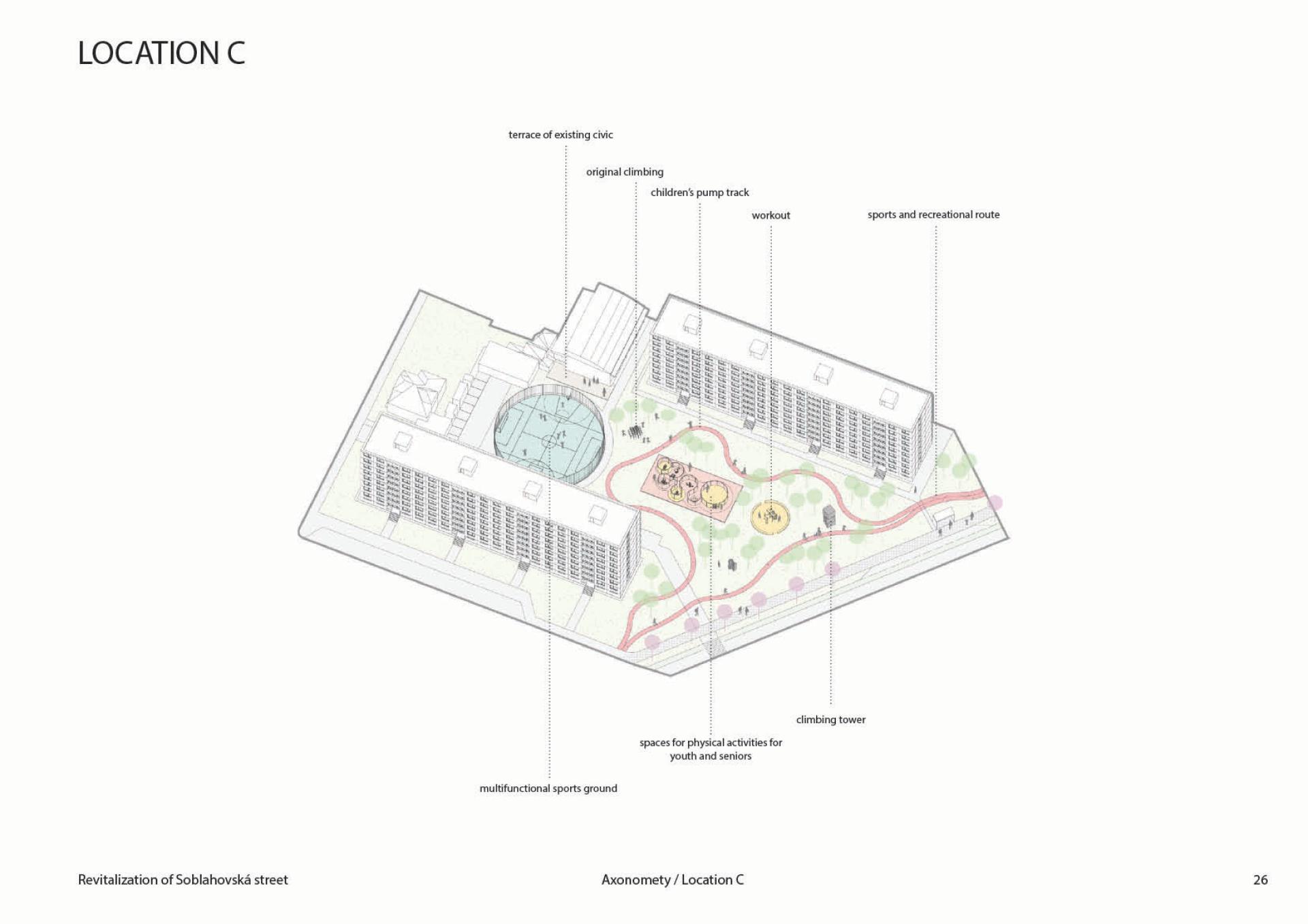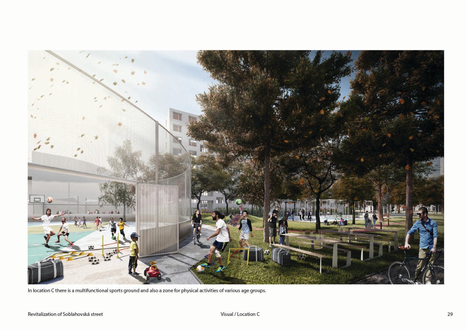 public spaces as well as new spaces for civic amenities, which will serve residents, but at the same time can create places to relax while walking or cycling to the city center. Soblahovská Street is divided into five localities, which are ideologically, but also functionally different and diverse, bringing new opportunities for sports, recreation, education. The concept also ideologically addresses the principles of sustainable design, care for the environment and the local microclimate.