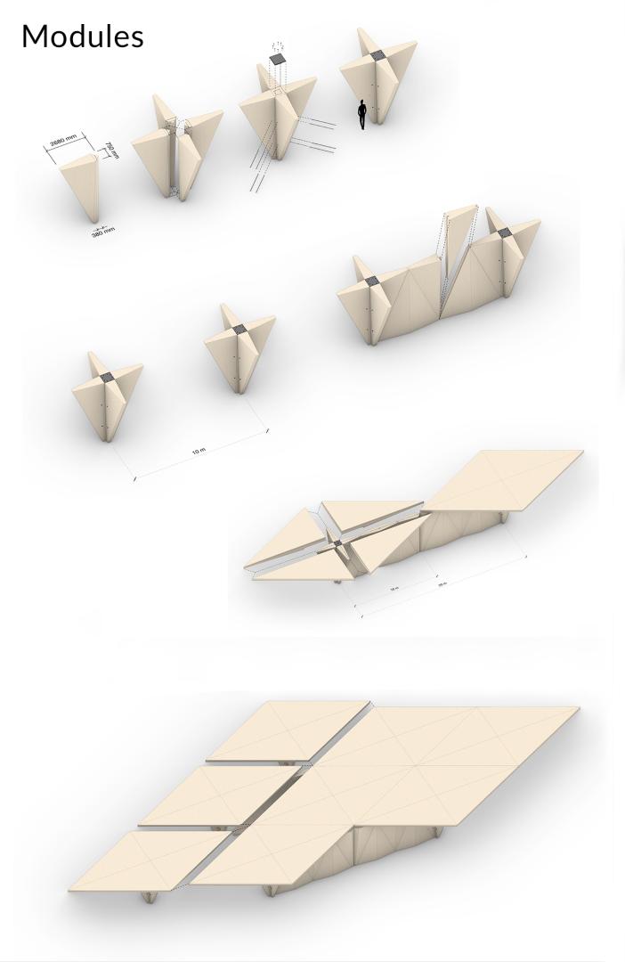 The building's modular design consists of multiple triangular elements with the intent to avoid the shipping container aesthetic that has become common with modular buildings. These triangular elements form mushroomlike modules that can be stacked on top of or beside each other. These modules allow us to construct all of the different functions needed in the cultural centre, from art galleries and large concert halls to office spaces and reading rooms in the library. The triangular form also allows the building of nature inspired sloping freeform surfaces whilst still remaining in the modular grid based system. This means that the building can blend seamlessly into nature while still being distinct and having its own identity. The whole complex of buildings is so to say sunk into nature by being completely surrounded by the tall trees of the existing park and all of the roofs of the buildings are covered in greenery to maintain the Park around and on top of the buildings. The building masses are not so much built on top of the park as they are slid underneath the corners of it. In a sense the park is draped over the structures forming a hilly landscape that is common to Southern Estonia, it also gives an extra dimension to the experience of the park. Terraces form on the slopes of the roofs of the buildings where visitors can relax and have a view over the whole landscape of the cultural centre and the main pathways meander through the wilder forest-like areas of the park, low down in the valley between the hills.