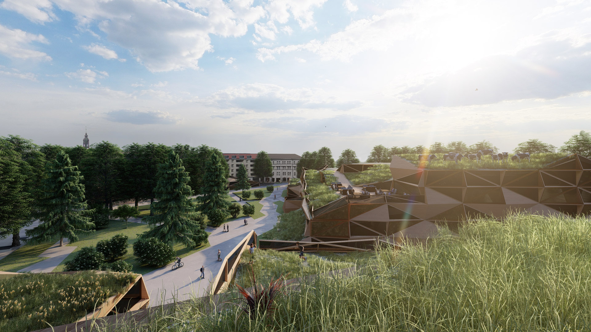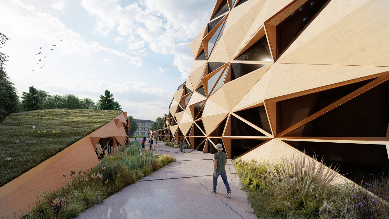 Our project is a cultural centre in Tartu, Estonia. It consists of a library, concert halls, art museum and rental spaces. The modular timber buildings are situated in a park and our concept is to disrupt the functions of it as little as possible. To achieve that, we made the roofs green and sloped, sliding the indoor structures under the corners of the existing park, which we left as is in the middle. The roofs are walkable and also serve as entrances to the upper floors.