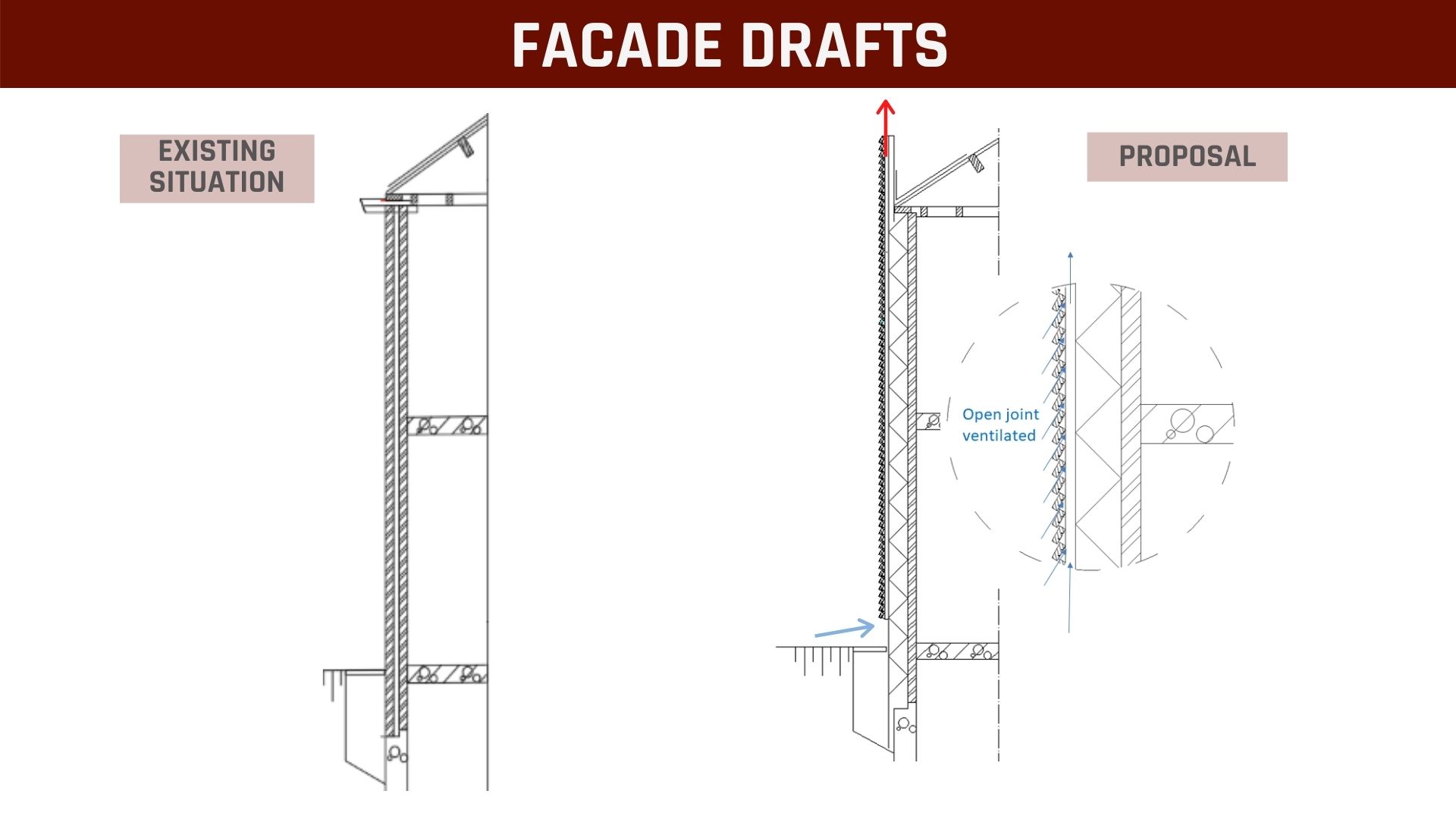 Firstly, the addition of insulation throughout all the external wall; secondly, the addition of a bio-inspired open-joint ventilated facade leading this insulation, with an air cavity between them where the air can circulate and cool the building during summer.