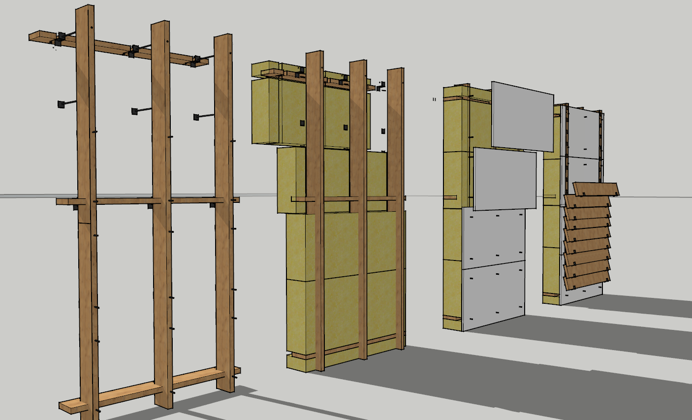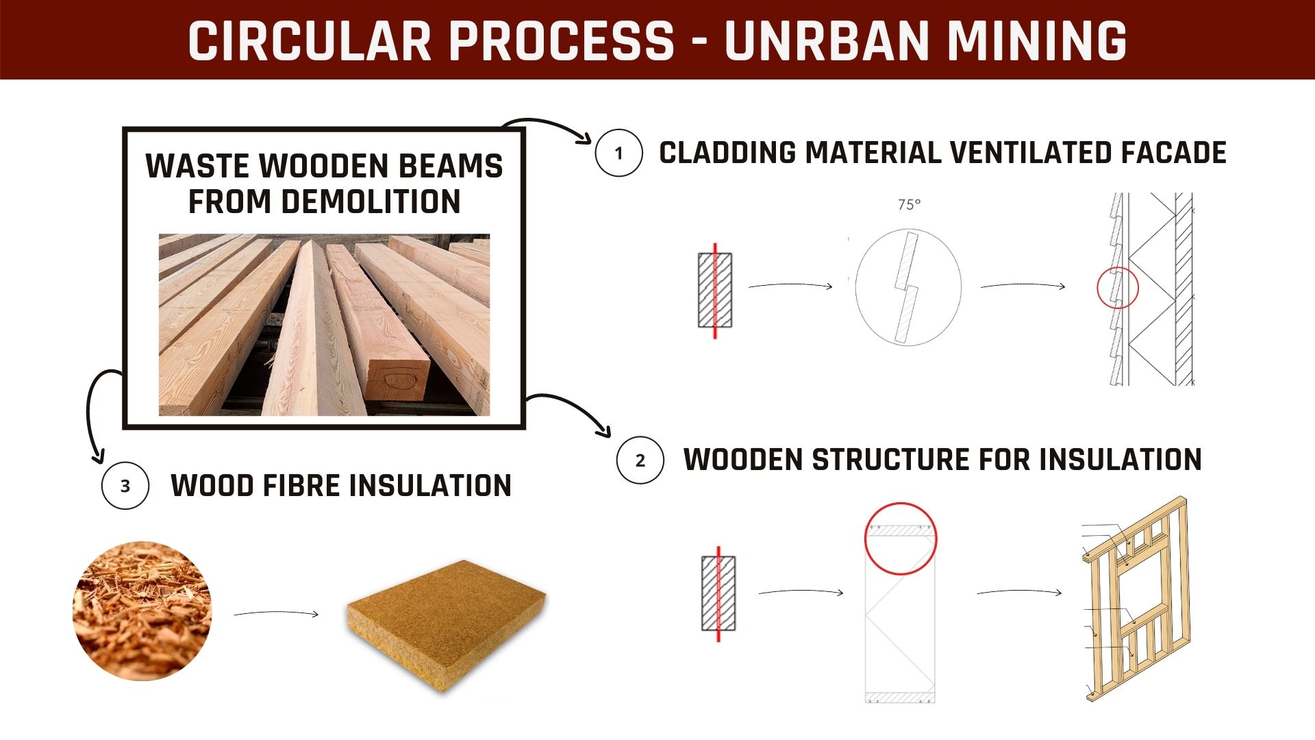 - Wood fibre insulation: reuse the wood from demolition as wood fibre insulation and add it throughout the exterior wall.