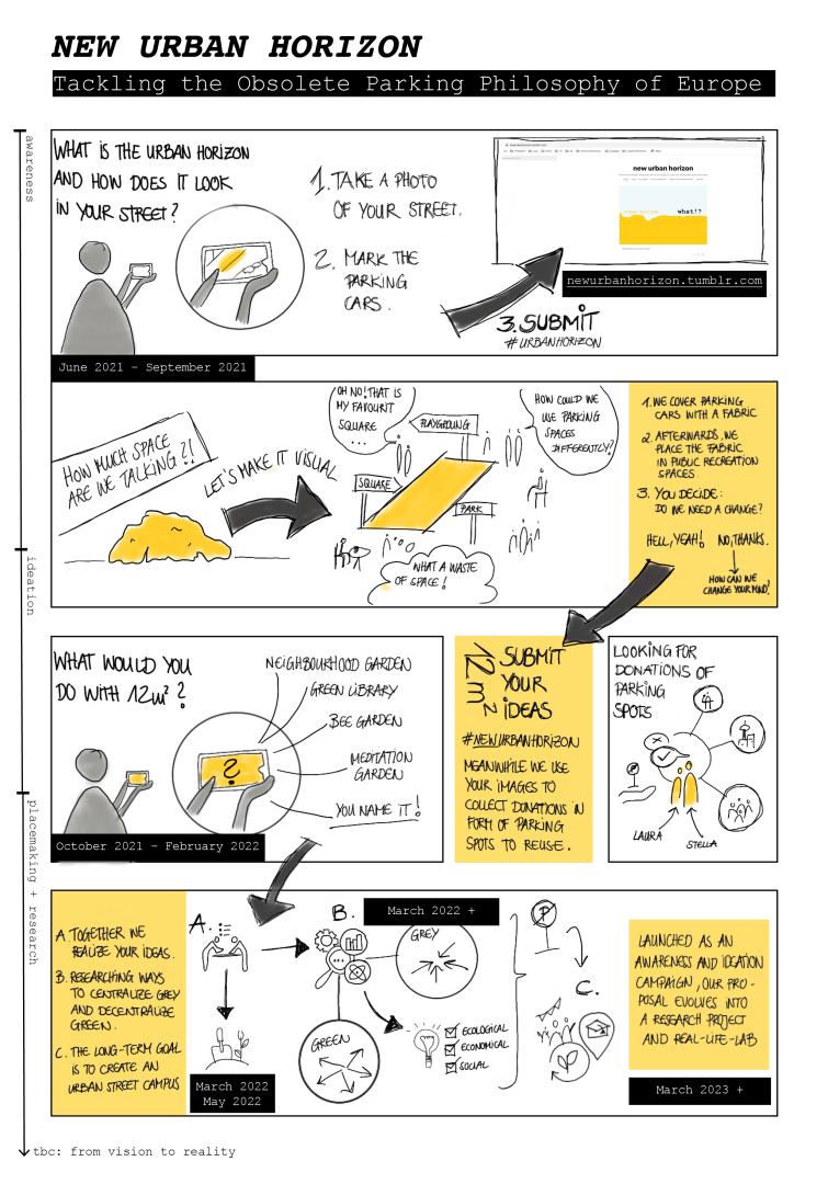 The power of imagination helps us to collectively shape our #newurbanhorizon in four steps, reaching from activation through immediate interventionists formats to implementation by long-term action and research configurations – (1) awareness, (2) ideation, (3) placemaking and (4) solution-based research. The awareness campaign is core of our proposal, as we believe that self-created images can raise much needed consciousness, of people and policy makers alike, towards the necessary change of our streetscapes. Acknowledging the problem enables the ideation and envisioning of alternatives, which can facilitate behavioural change for a sustainable and green future of our cities. Therefore, we need bold and utopic images, produced by all European residents, from young to old, that help us to acknowledge the status quo of our urban horizon; grasp the potential of public spaces marked by road paint; democratize parking spaces and detect inclusive and environmentally-friendly uses that are of similar economical value.
