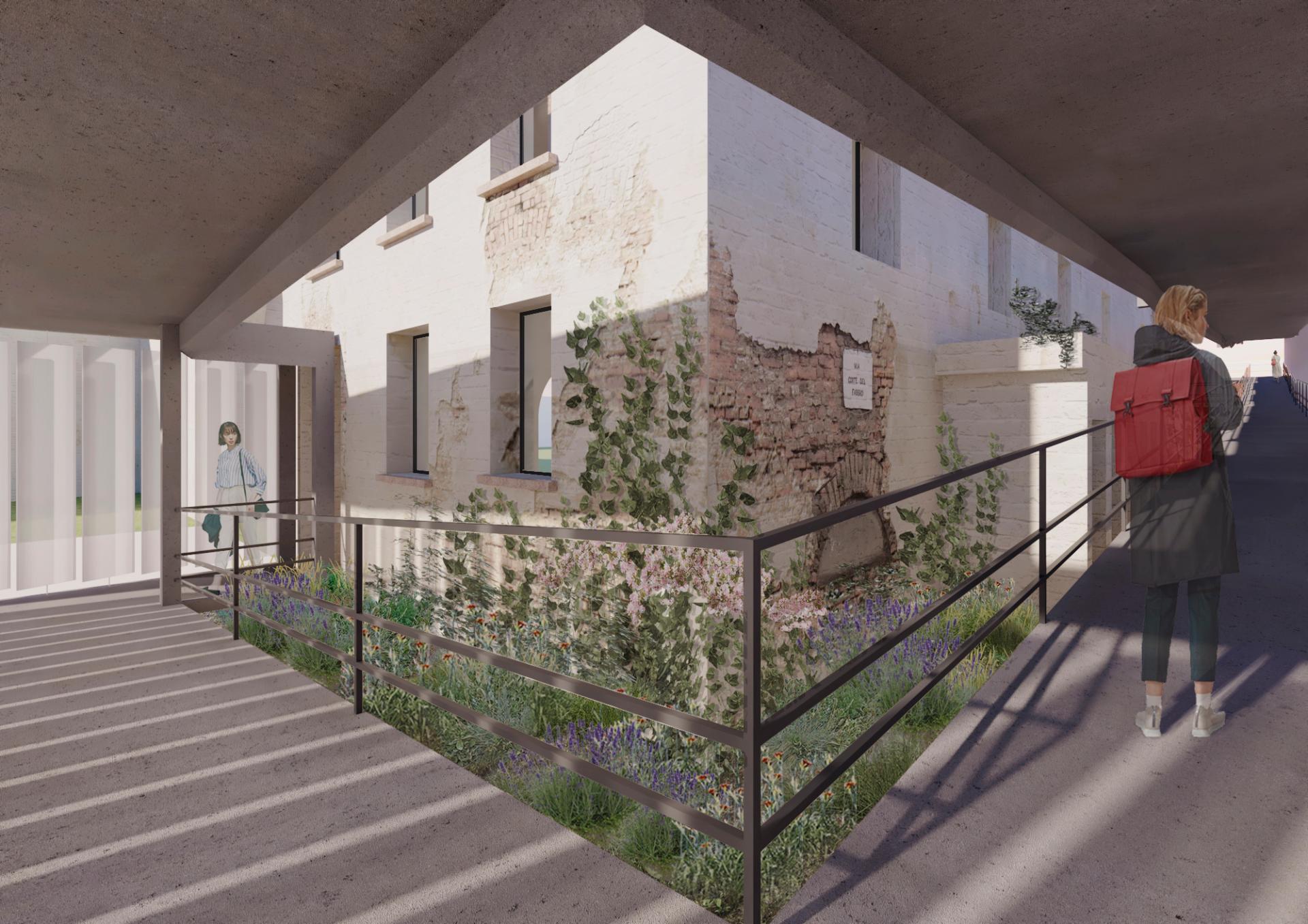 Our designed ramp is inserted in the pre-existing context, not only as a useful tool to guide the visitor through the historical building in a respectful and utterly honest way, but it also represents an activator of a new experience in the whole complex and is a key element in the design development of the project. We like to consider this new experience as a Corbusian ‘‘architectural promenade’’ composed of three essential elements: firstly, the creation of an entrance that arouses the curiosity of the visitor and pushes him to go beyond, secondly the production of multiple points of view along the path and finally, the continuity between the fragments and the architectural unity.
