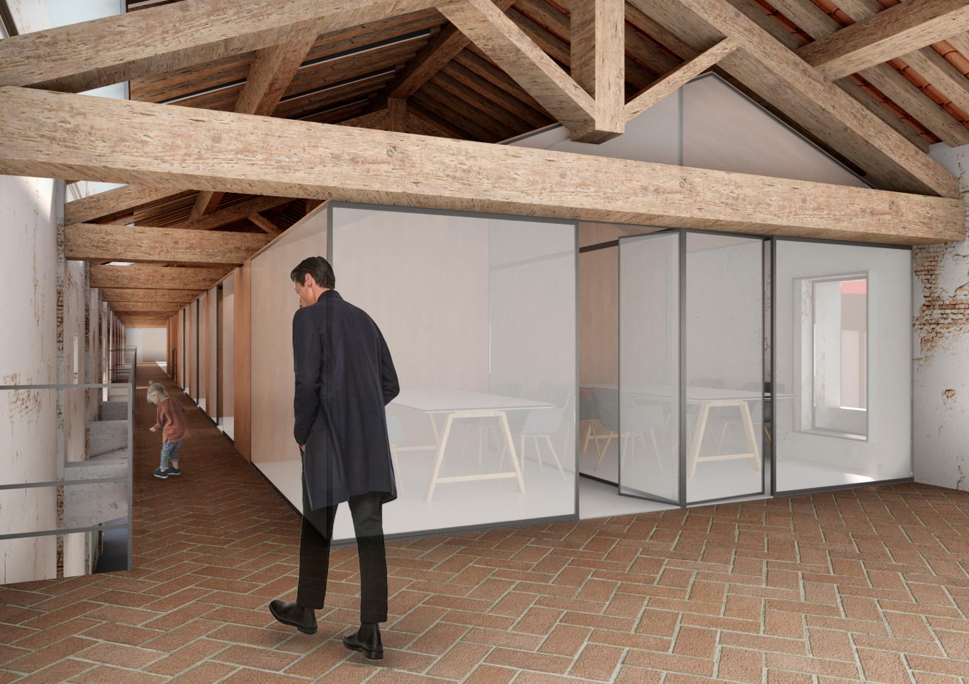 To ensure functional working and conference rooms, the ‘box-in-box’ concept is applied for the enclosure of these spaces. The boxes mimic the shape of the existing ceiling, establishing already a strong connection with the historical building. The semi-transparent divisions, made out of nylon scrim and framed by a subtle black metal structure, have a light appearance, while the wood chosen for the roofs and the inside walls ensure a warm and comfortable working environment. The flexible working areas can be enlarged and reduced according to its function and use by means of the internal wooden fins, which are clearly linked to the brise soleil in the ramp in form and function. In the end, this project aims to create a new functional and updated version of the Meridiana building that explores the various experiences connecting inside and outside and creates warm, comfortable and open working possibilities, in a very innovative manner.