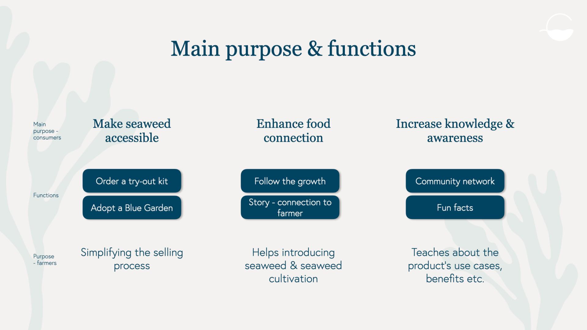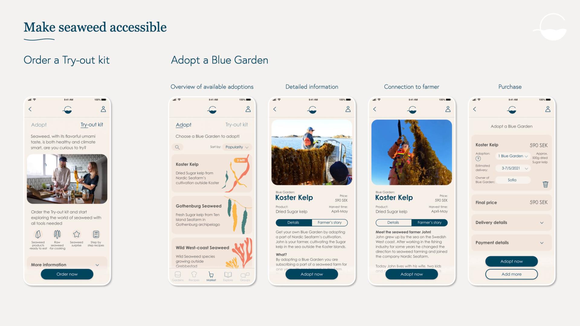 The concept is supporting Swedish ocean farmers, who mostly are small-scale farmers. Blue Garden simplifies their selling process and helps them introduce seaweed and teach about its different use cases to their customers. Today the seaweed farmers are trying to do this themselves, which is hard and time-consuming. With Blue Garden they can concentrate on their actual job, to be farmers, as the service is taking care of the rest. This can motivate more people to start cultivating seaweed.