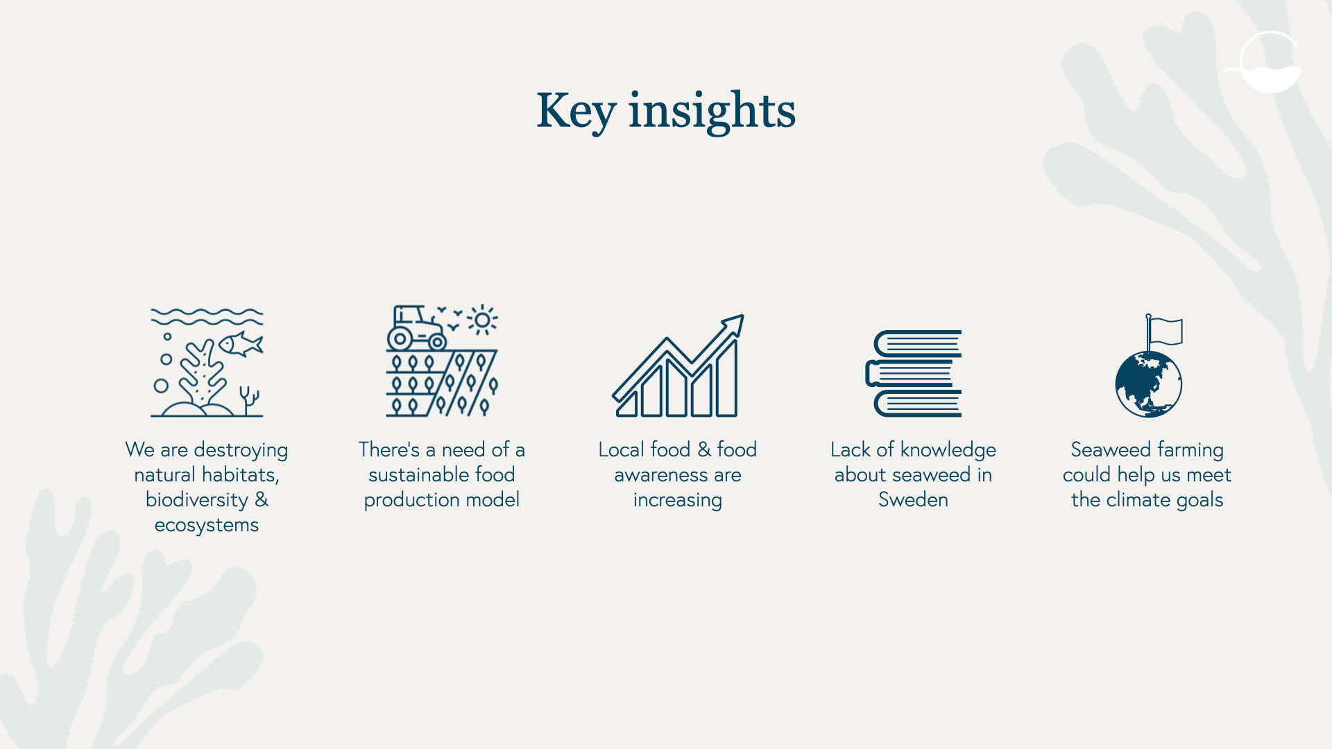 The way we are producing food today harms our lands and depletes our soils. With the increasing population, we will soon not have enough food to feed everybody. At the same time we are accelerating climate change and destroying natural habitats, biodiversity and important ecosystems. We have to make a change. There is a need for a sustainable, resilient and restorative food production model, creating carbon low food. A potential solution is Marine Permaculture, which is a type of seaweed farming. This solution can provide us with a sustainable and healthy food source, while at the same time leading to carbon sequestration and restoration of our harmed ocean. The next step is to introduce this food culture and food cultivation to Sweden.