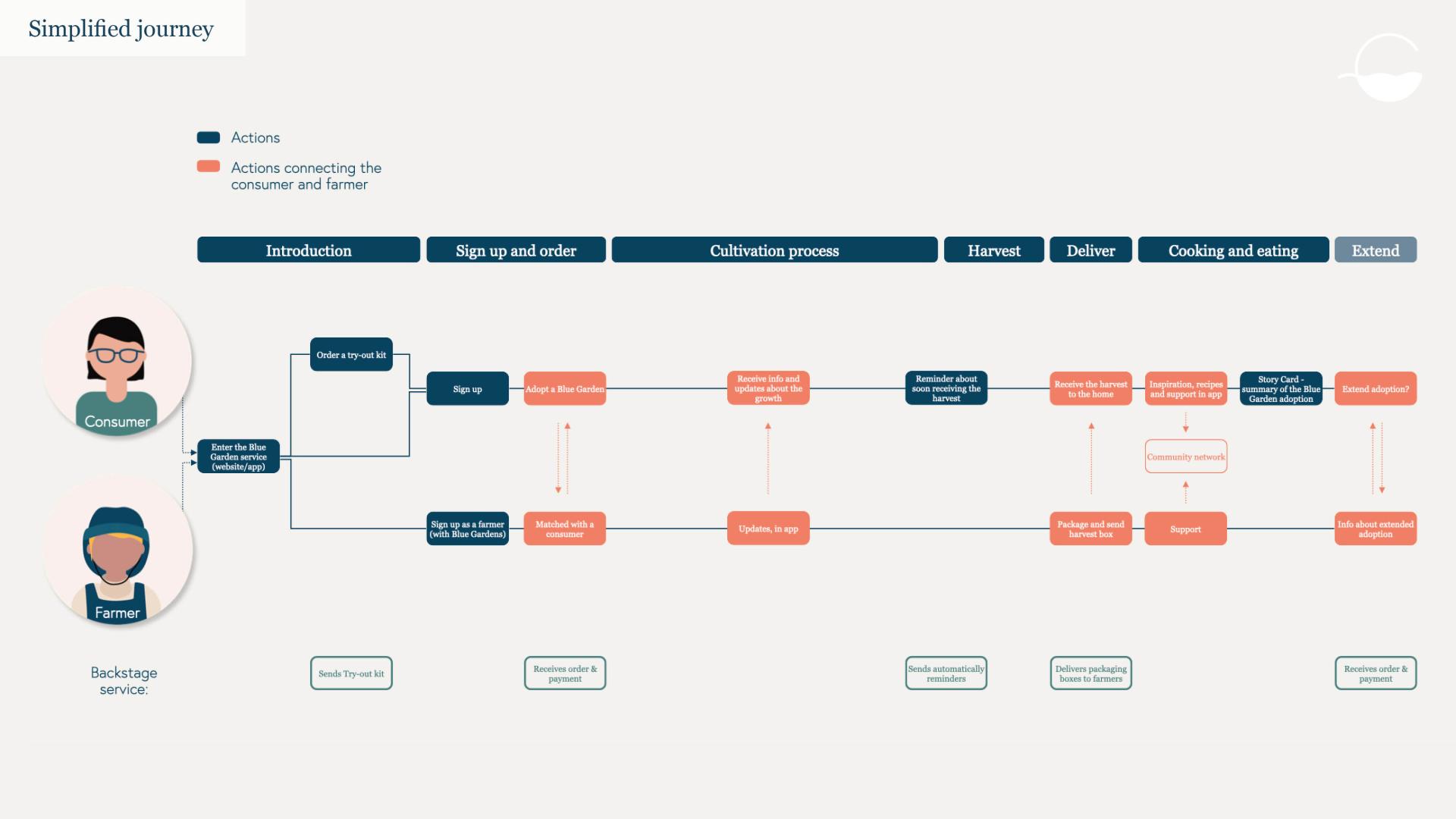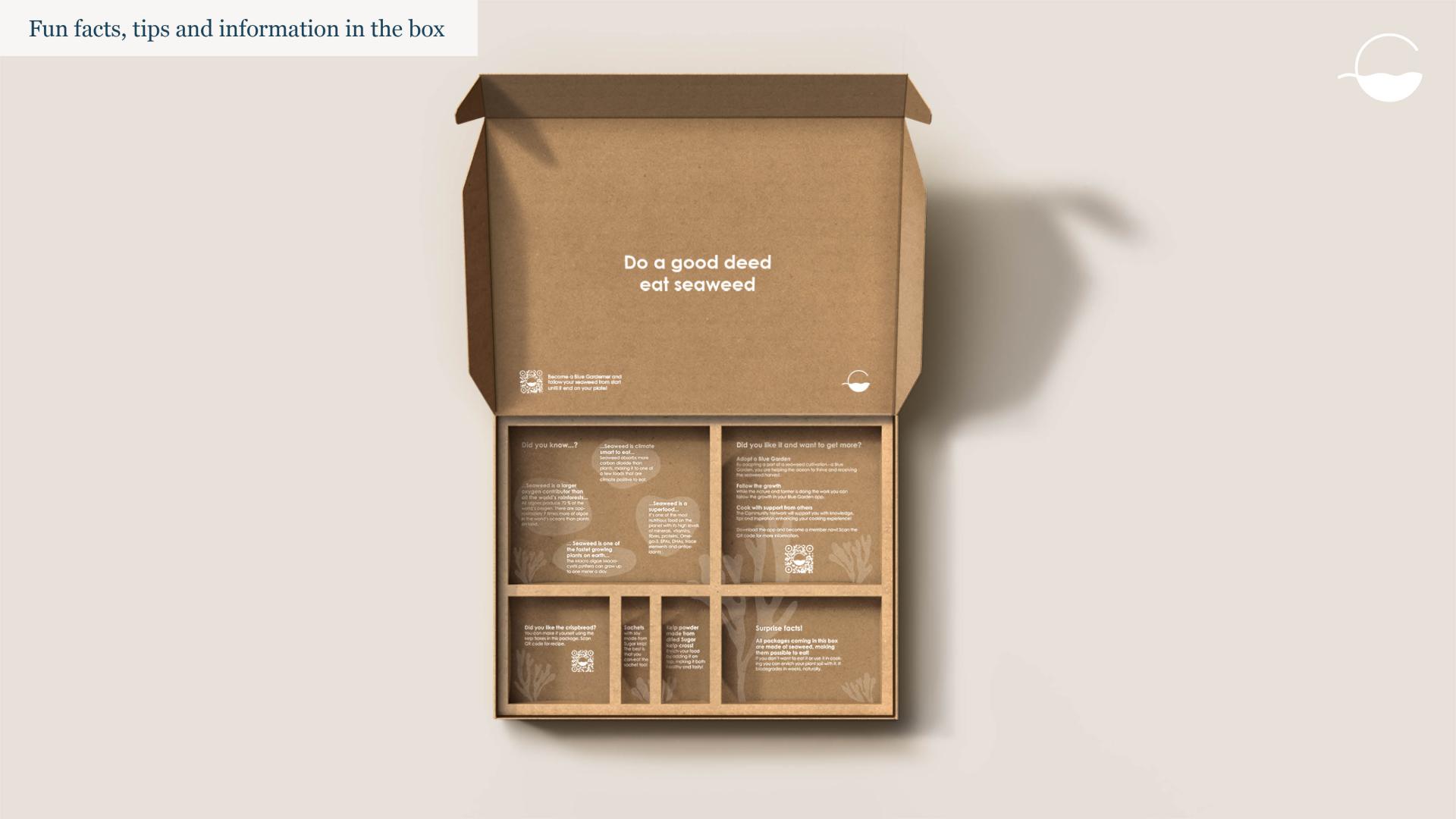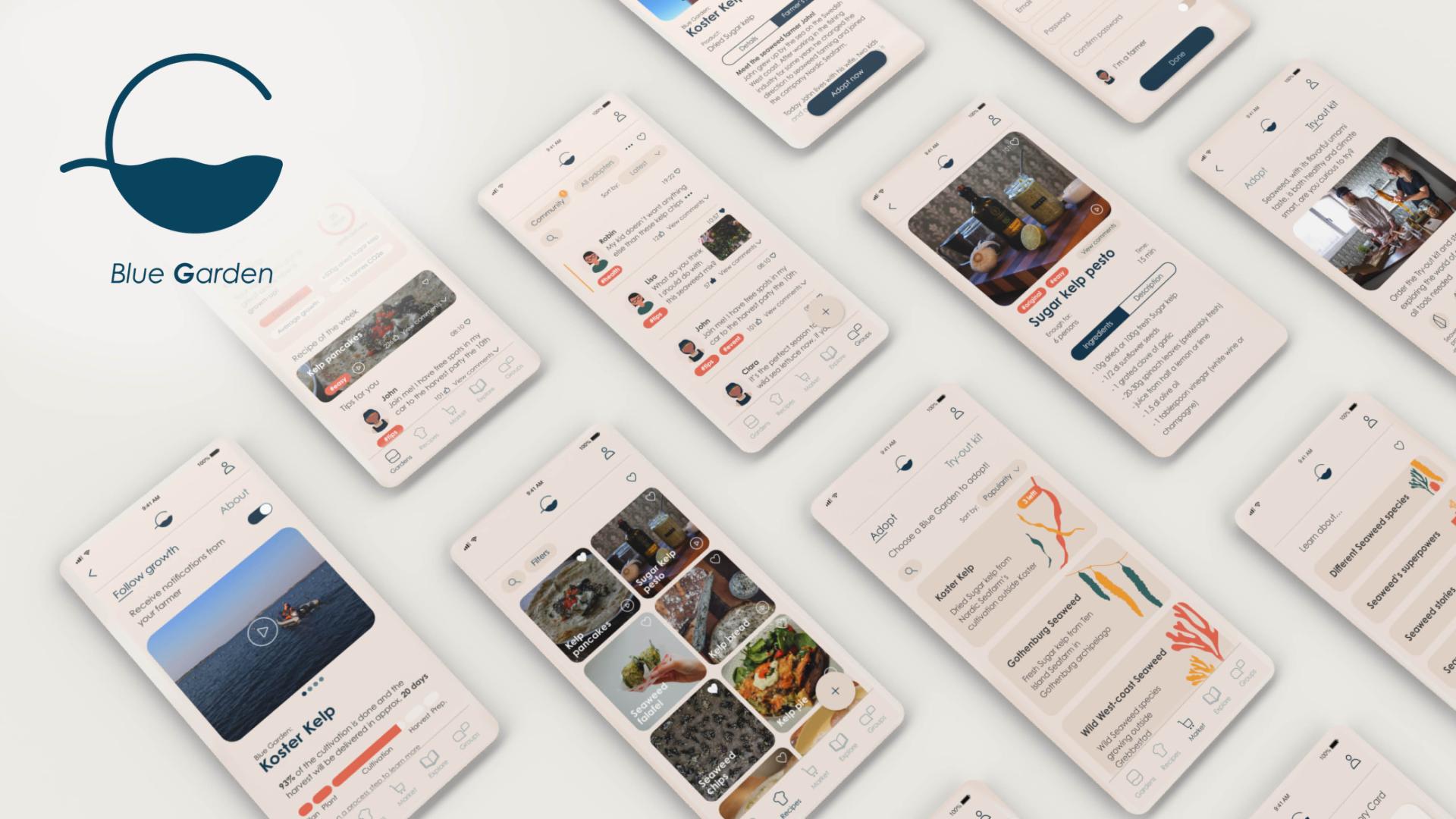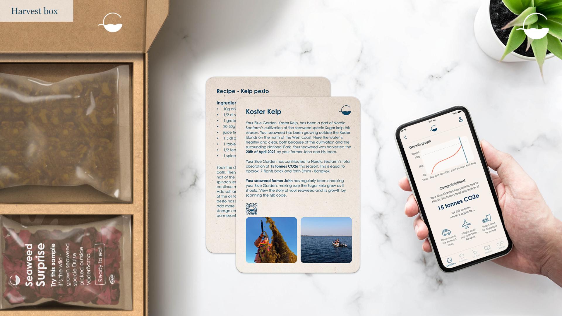 Blue Garden consists of a mobile application, a Harvest box and a Try-out kit. The service allows users to adopt a part of a seaweed cultivation, a Blue Garden, in order to receive its harvest. While the farmer and nature are doing the work, users can follow the growth and increase their knowledge in the app. The app also works as a platform for the Blue Garden seaweed community, where users can share recipes, inspire and learn from each other. After the harvest, the users receive the Harvest box at home. The Blue Garden Try-out kit is for the curious user, who wants to try seaweed before adopting a Blue Garden.