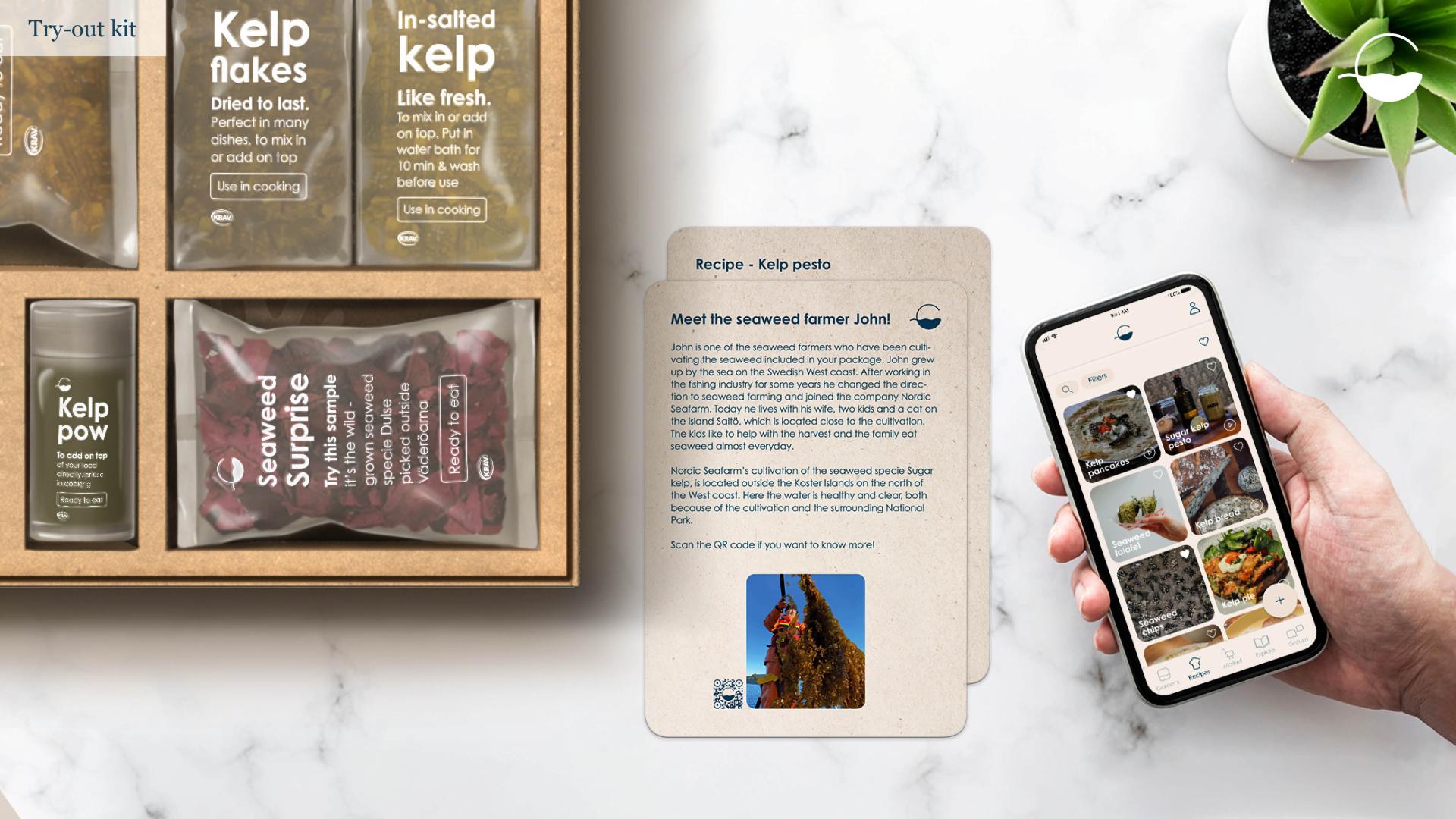 The recipes include inspiring pictures, step by step instructions and tutorials. Three physical recipes are included in the kit, and for the more engaged person there is also a recipe library and tutorials in the app, which can be reached by scanning a QR code on the box. The seaweed included in the kit are both products to test directly, and the raw form of seaweed to use in cooking. All seaweed products are packaged in an edible plastic, called Notpla, made out of seaweed.