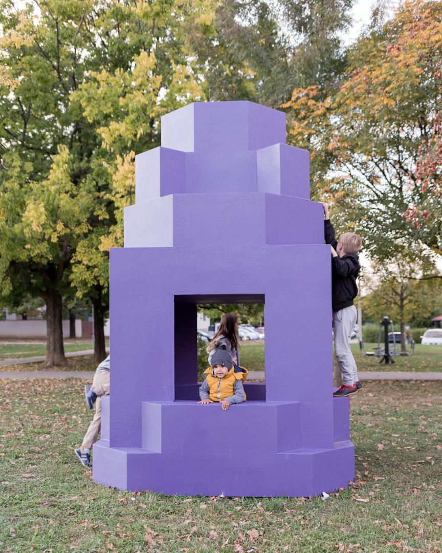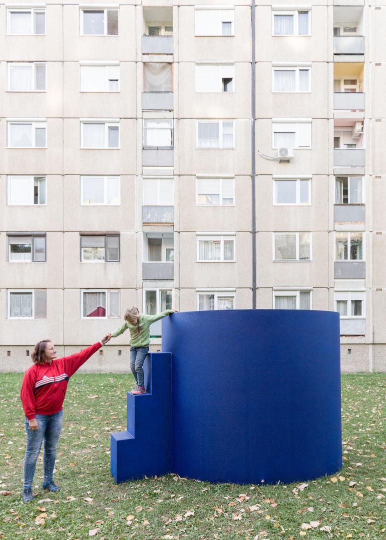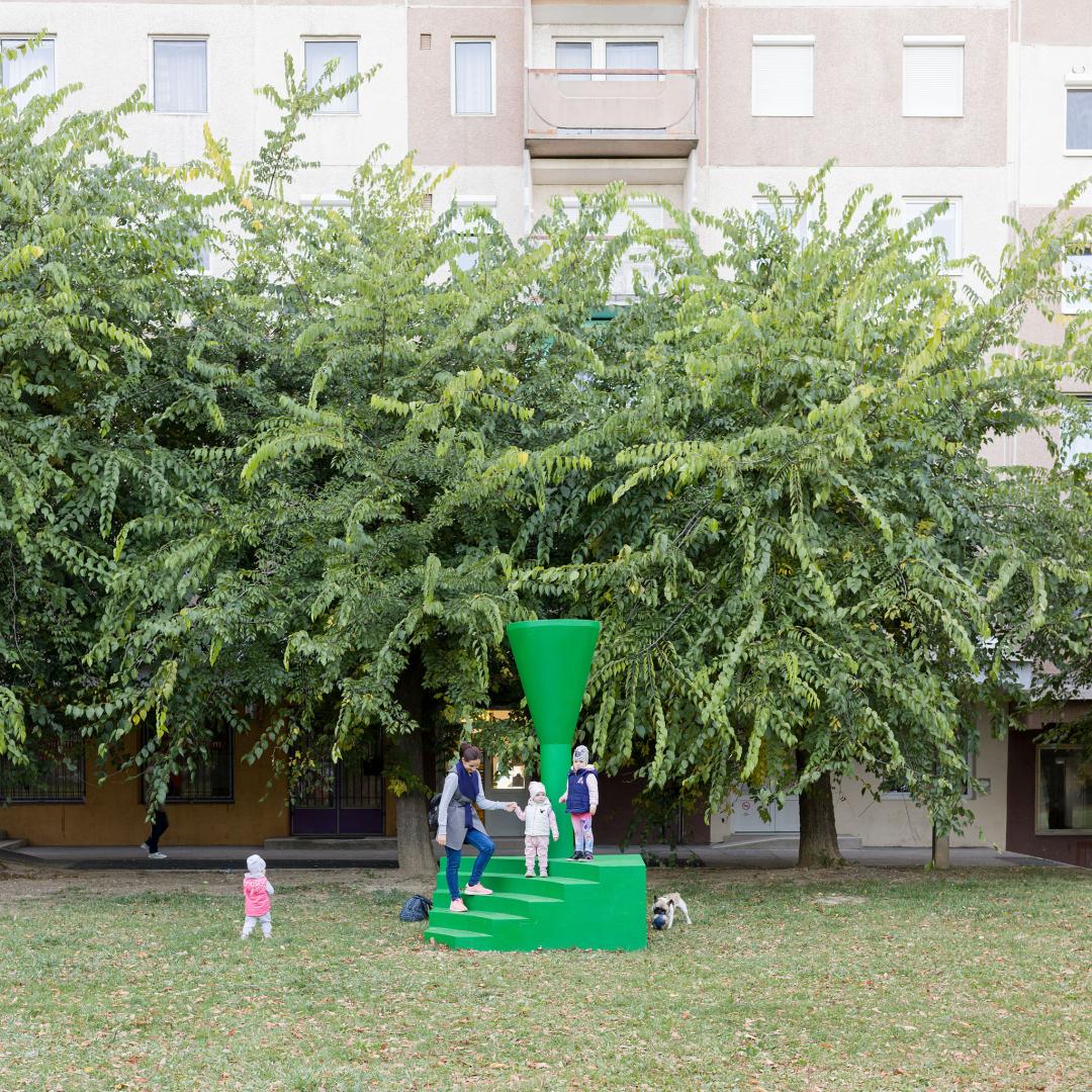 The aesthetic quality and permanence of the urban artifact stems from its form or morphology, and it can be anything and turn into anything regardless of these, in terms of function (from synagogue to furniture warehouse, from furniture warehouse to library, from library to a fencing room…). The historic city is full of artifacts and references of the kind, however, this urban, temporal and mental layer is missing or can hardly be found in modern housing estates. We attempted to create such new artifacts—in a planned and deliberate manner. Our urban artifacts were designed especially so that such layers can be built on top of them, to allow people to connect with them, to have events hosted next to them, to serve a point of reference in the estate, to be featured in photos, to be cared for and to be vandalized. Thus I think everyone can find something to relate to on them: kids sit on them, climb in and on top of them, teenagers smoke and kiss near them, adults meet at them, take walks around them with their kids, or listen to the guided tour related to the project online.