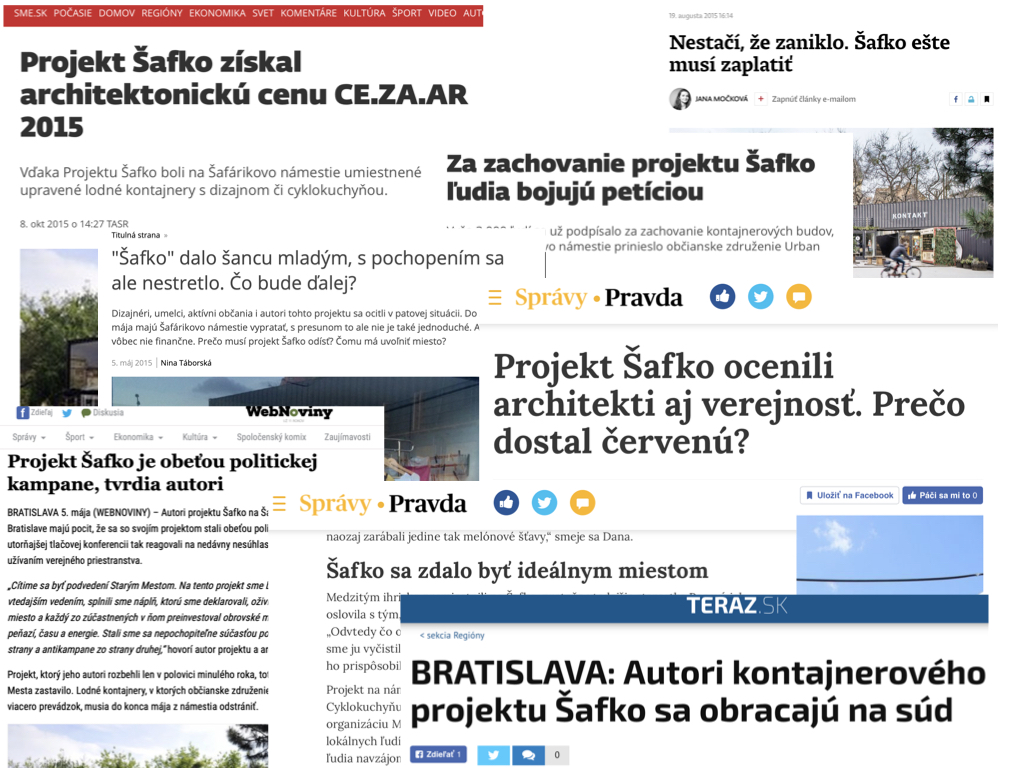 Then the newly elected local authorities cancelled the project. What happened? Cca 4000 people signed the petition to safe Šafko. Hundreds of support letters from local professionals and architects, big media covering, 2 courts against this decision (that we won)… all this effort did not save Šafko. But don 't be sad - it led to a movement in a society - particularly in the City of Bratislava - people started to look at the public space in a different way - they started to love to use it. It nudged communities in sharing the space, in living outside their houses. It helped to get people interested in politics together and now we have a new mayor coming from this surrounding and rapidly changing Bratislava to a really European city.