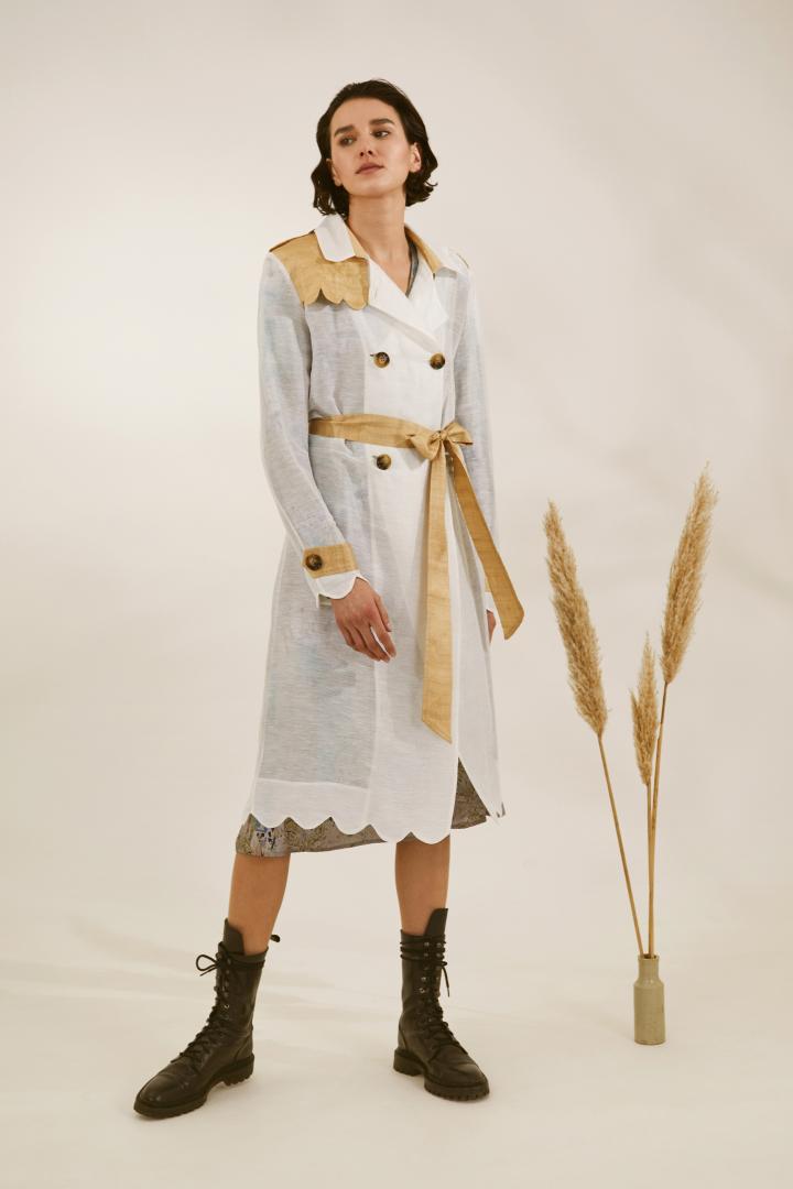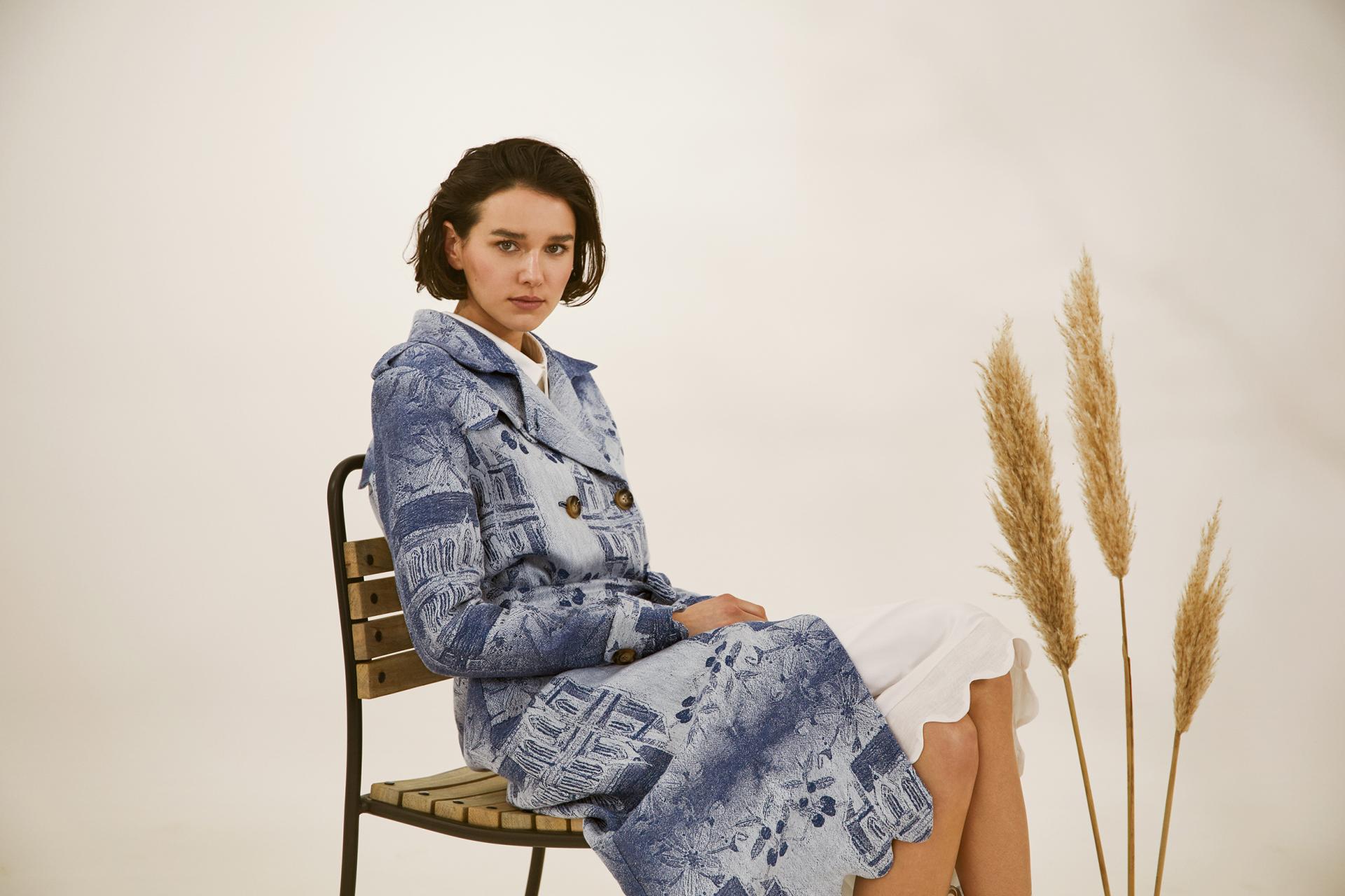 The project is innovative as it is rich in storytelling. Some of the titles of the pieces are in the Irish language "Eala Meán Oíche" (Midnight swans) drawing on our rich heritage and beautiful old names. Each piece has its own story. The "Paddington to Killarney" trenchcoat in Irish linen hemp union is inspired by my grandaunt ticket home from WW2 London to Killarney. My watercolor painting of "Cill Áirne" meaning Church of the Sloes (Killarney in English) is woven by a "Masters in Linen" in Ireland. The latter is a sign of excellence and means from farm to fibre to fabric was produced in Europe. The prints created by Christine's work are highly innovative and are influenced by reminders of home and the wonderful biodoversity of the area where House of Kerry is situate. The Raptor v Amphibian printed dress is a watercolor painting of the protected species of hen harrier and smooth newt and the inclusion of the old heirloom weatherclock in the old farmhouse, a reminder to act on climate change.